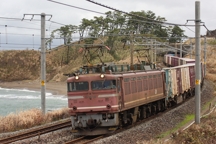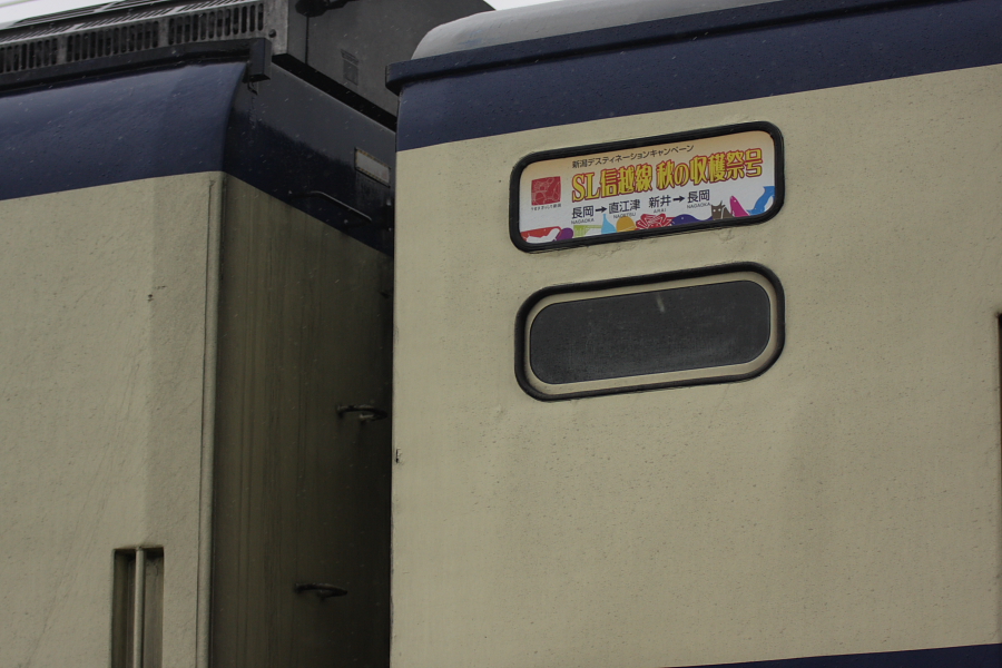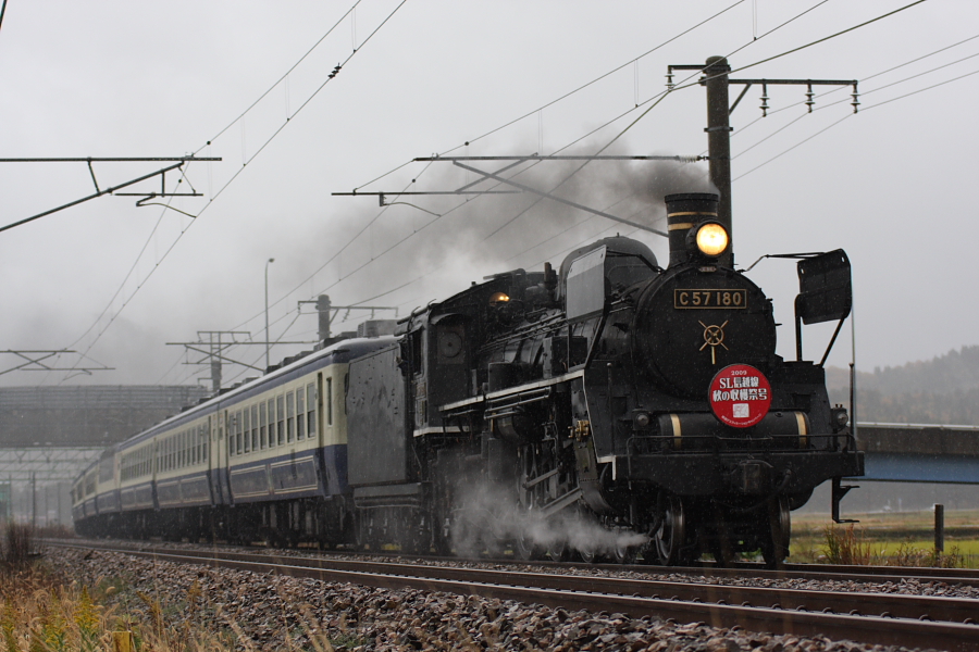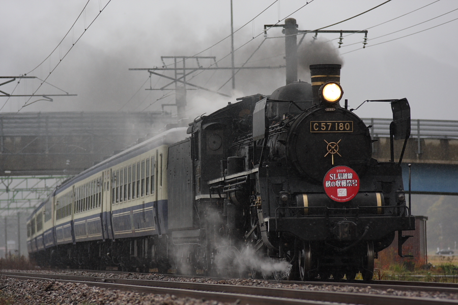 【信越本線】SL信越線秋の収穫祭号【C57+12系7B】 14日新潟DCの一環として、信越本線長岡~直江津間(往路)に「SL信越線秋の収穫祭号」として、C57-180+12系7B(ばんえつ物語ヘセ)が運転された。って事で、大雨の中クルマで柏崎へ。久々の信越線SL@茨目~安田柏崎で1時間停車するので、鯨波へ先回り(・∀・)約100人?かなーりギャラリーが。場所悪いうえ、ピン激甘撃沈@青海川~鯨波↑めっちゃRAWを修正。悔しいので、みんなが撤収したあと残って、EF81貨物を。4060レ@青海川~鯨波SLや貨物通過時はなんとか雨は止んでくれて良かった。が、ピン甘は何があったのか…泣たぶんフォーカスリングを撮影直前に触れてしまったのだろう。。 [0回]