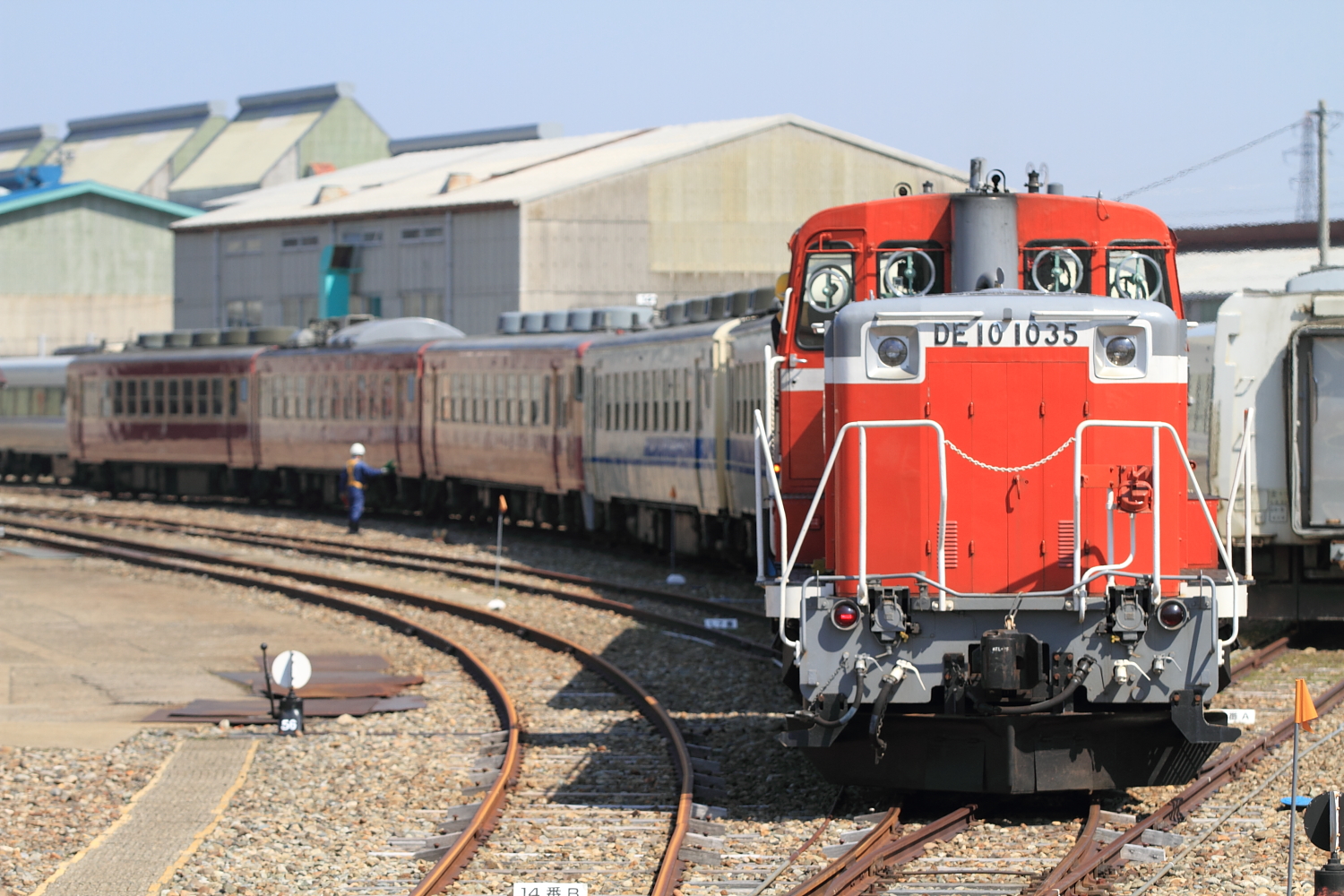 【北陸本線】A06+A13編成松任へ回送【457・475系】 H26.3.24A06とA13ヘセが廃車のため松任へ回送されました。 回9264M@野々市~松任とてもゆっくりした回送スジで運転され、松任へ。 松任到着後、DE10が連結され… 奥の方へと押し込まれて行きました。綺麗な状態のままで、廃車とは思えない姿で…久々に松任へ行きましたが、見ていると面白いのですね。 DE10は先日のパンタ損傷の683SREを移動させたりしていました。 [0回]
