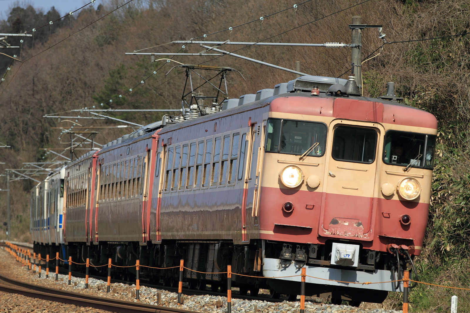 【北陸本線】A19ヘセ撮影【475系】 H26.4.7綺麗なA13ヘセは留置となってしまいましたが、A19ヘセはまだまだ現役。 朝日を浴び、413系と6連を組んで運転。 安楽寺では413が先頭。 固定運用がいつまで続くのか…475系A19ヘセとトワイライト、徹底的に撮ります! [0回]