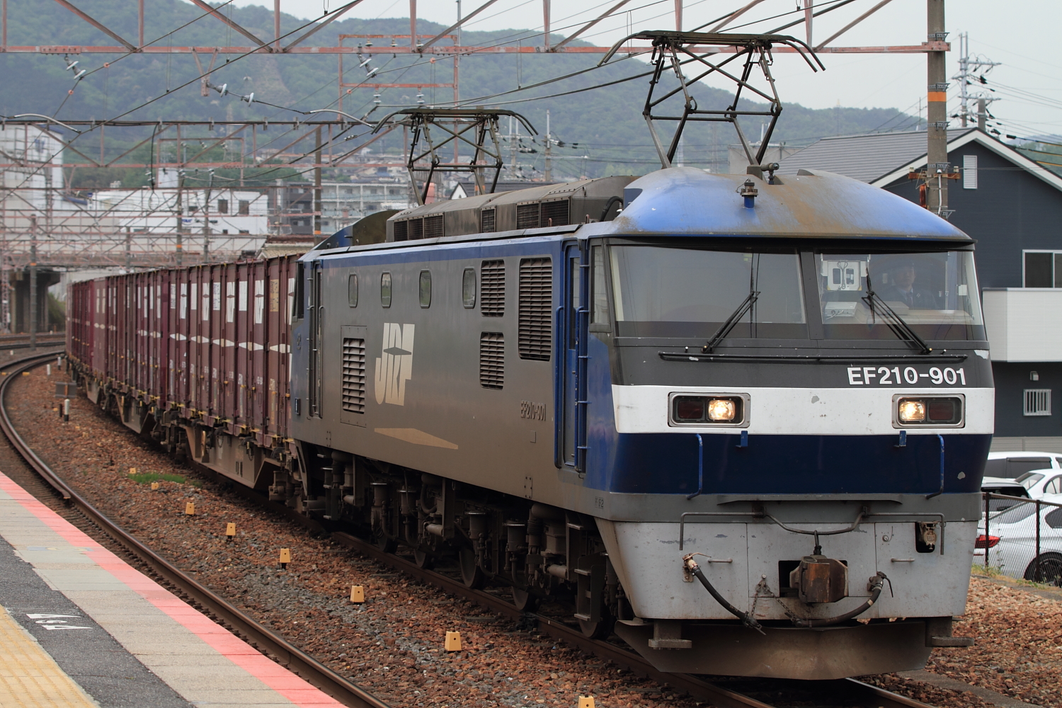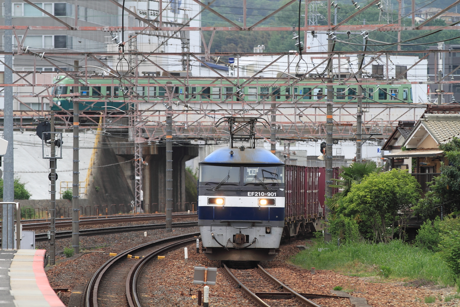 【東海道本線】1070レ撮影【EF210】 H29.5.9近江鉄道、信楽高原鐵道に乗車の後、草津経由で石山へ向かっている最中に人身事故発生。ちょうど上り貨物があったので撮影。 1070レ@石山EF210 901号機牽引でした。普段は通貨の石山駅ですが、抑止のため側線への入線。ちょうどバックに京阪電車も。 [0回]