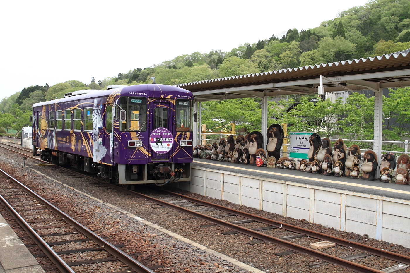 【信楽高原鐵道】新ラッピング車撮影【SKR311・312】 H29.5.9貴生川はよく通るのですが、なかなか乗る機会がなかった信楽高原鐵道に乗車しました。 H29年2月に新ラッピングになったようで、車内も忍者だらけでした。駅は言わずと知れた、信楽焼きでタヌキだらけ。貴生川から一つ目の駅(紫香楽宮跡駅)まで9.6kmもあり、この区間だけで信楽高原鐵道の3分の2あります。 [0回]