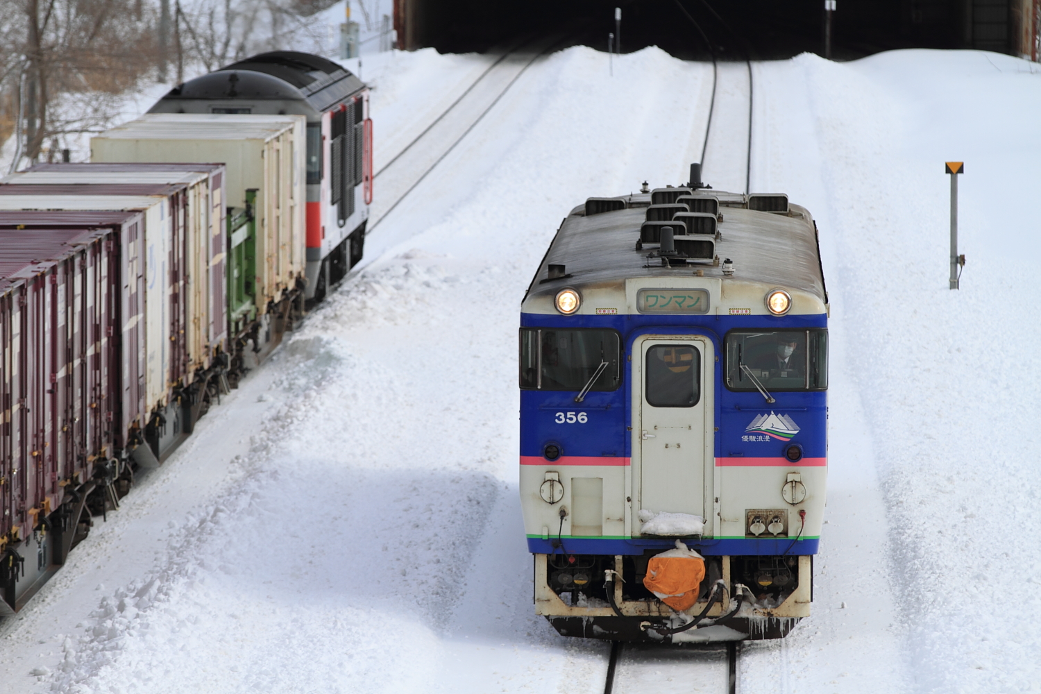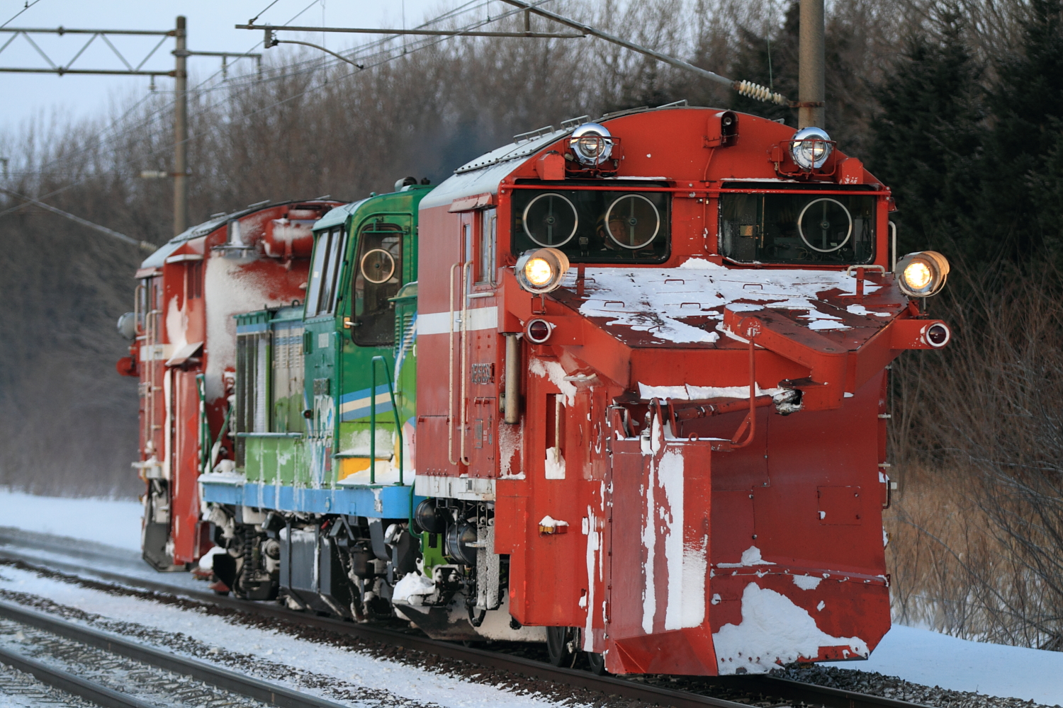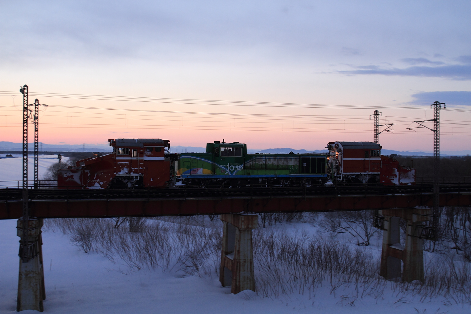 【函館本線】雪8145レ撮影【DE15ラッセル】 H29.2.25岩見沢で朝早く起きて沿線へ。狙いは臨時排雪列車…が、雪は無し。しかし、今回も同行している友人が運転を確認してくれていたので撮影へ。 雪8145レDE15 1534号機ラッセルノロッコ塗装の機関車でした。除雪作業をしている場面ではありませんでしたが、雪列車です。せっかく晴れているので、他にも色々と記録。 北海道でキハ40の3連を初めて見ました。方向幕も「普通」がとても新鮮でした。 こちらは赤スカートの貨物列車で、DF200 10号機牽引でした。 スーパー宗谷1号こちらはダイヤ改正(H29.3.4)で「宗谷号」となりました。他にもありますが、割愛します。オホーツク号は何と、見る鉄でした。。この後、疲れを癒すため「ながぬま温泉」でほっこりし、夕張方面へ。次へ続きます。 [0回]