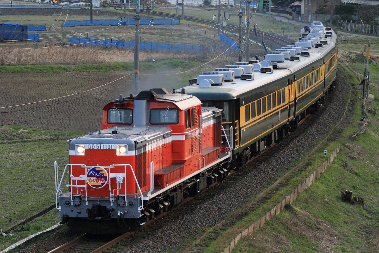 【山陰本線】「だいせん」HM付き団体臨時列車撮影【サロンカーなにわ】 H29.3.19大阪〜米子間にて、サロンカーなにわ5両を使用した臨時団体列車が運転されました。福知山線〜山陰本線で往路は夜行、復路は日中の行程で、前後に異なるHMを取り付けての運転でした。 9703レ@淀江〜伯耆大山DD51 1191号機牽引でした。 後部もしっかりと「だいせん」のヘッドマークが付けられ、走行撮影可能な区間が限られたため早朝から多くのカメラマンで賑わっていました。往路は都合上撮影できませんでしたが、貴重ワンシーンが記録できました。14系改「サロンカーなにわ」による団体列車は常に魅力がいっぱいですね。次へ続きます。 [0回]