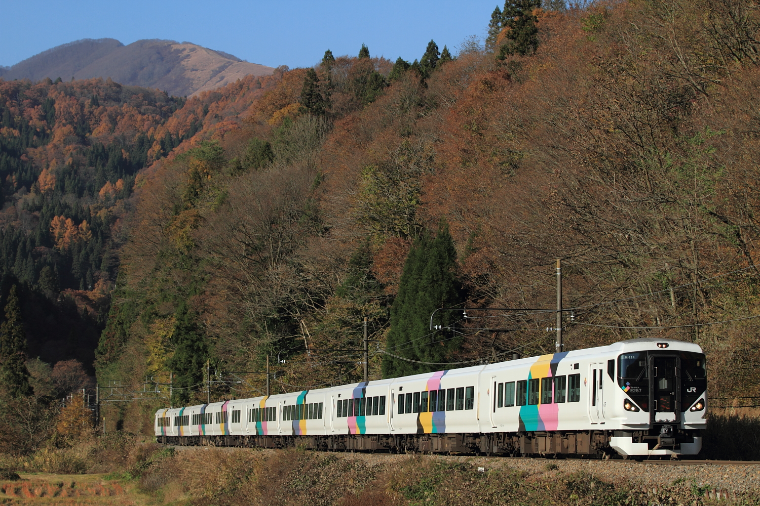 【大糸線】紅葉と特急あずさ号【E257】 H28.11.12今回は糸魚川から南下する形での帰省、キハ120に続いてE257あずさ号の撮影。 76M@信濃森上〜信濃大池見頃が過ぎていますが、なかなかの紅葉。静かな大糸線を走るE257は9両編成でとても長く感じます。この後は白馬〜長野を経由し、碓氷峠の「峠の湯」でほっこりして帰省しました。 [0回]