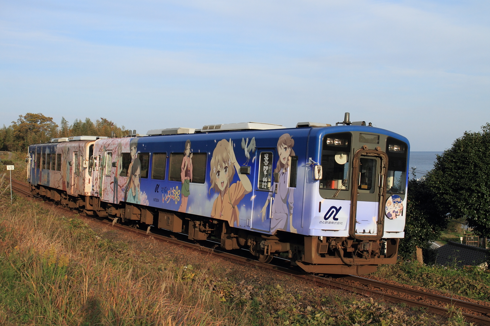 【のと鉄道】花咲くいろはラッピング列車 32【NT202/204】 H28.11.18良いお天気のようで、少し雲がかかった微妙な感じの中、いつもの場所で構えていると影が。もうかなり陽が傾くのが早く、厳しくなってきたのでアングルを変えて1枚。 140D@西岸〜能登鹿島やっと、新ラッピング車(NT204)先頭をスッキリ記録。綺麗なうちにたくさん記録せねば。。 [1回]