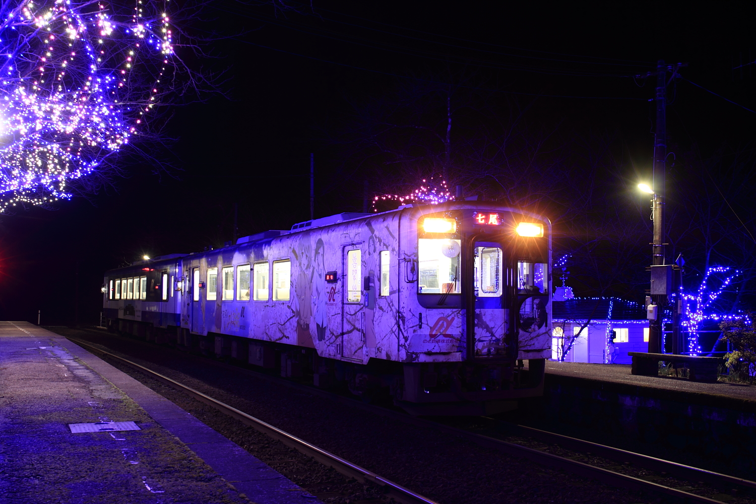 【のと鉄道】花咲くいろはラッピング列車 33【NT202/204】 H29.1.4新年、あけましておめでとうございます。今年も当ブログ共々、よろしくお願いいたします。色々と変わりゆく環境ですが、今年は昨年以上に活動できそうな気がします。さて、新年1発目はのと鉄道のイルミネーションからスタートです。 146D@能登鹿島NT202いろは先頭の2連を撮影。青のLEDライトが多いため、全体的に青に。 143D今度は先頭がマジンガー、後ろNT204いろはですが見えません。。標準レンズしか持ち合わせておらず、アングルに乏しく、停車時間もわずかの厳しい状況。。ふと山側から見下ろせそうな場所を発見し、移動。 148D少し俯瞰気味に撮影。出発した際の流し撮りが綺麗に決まれば、かなり良いかもしれない…これはリベンジしなきゃ。 [2回]PR