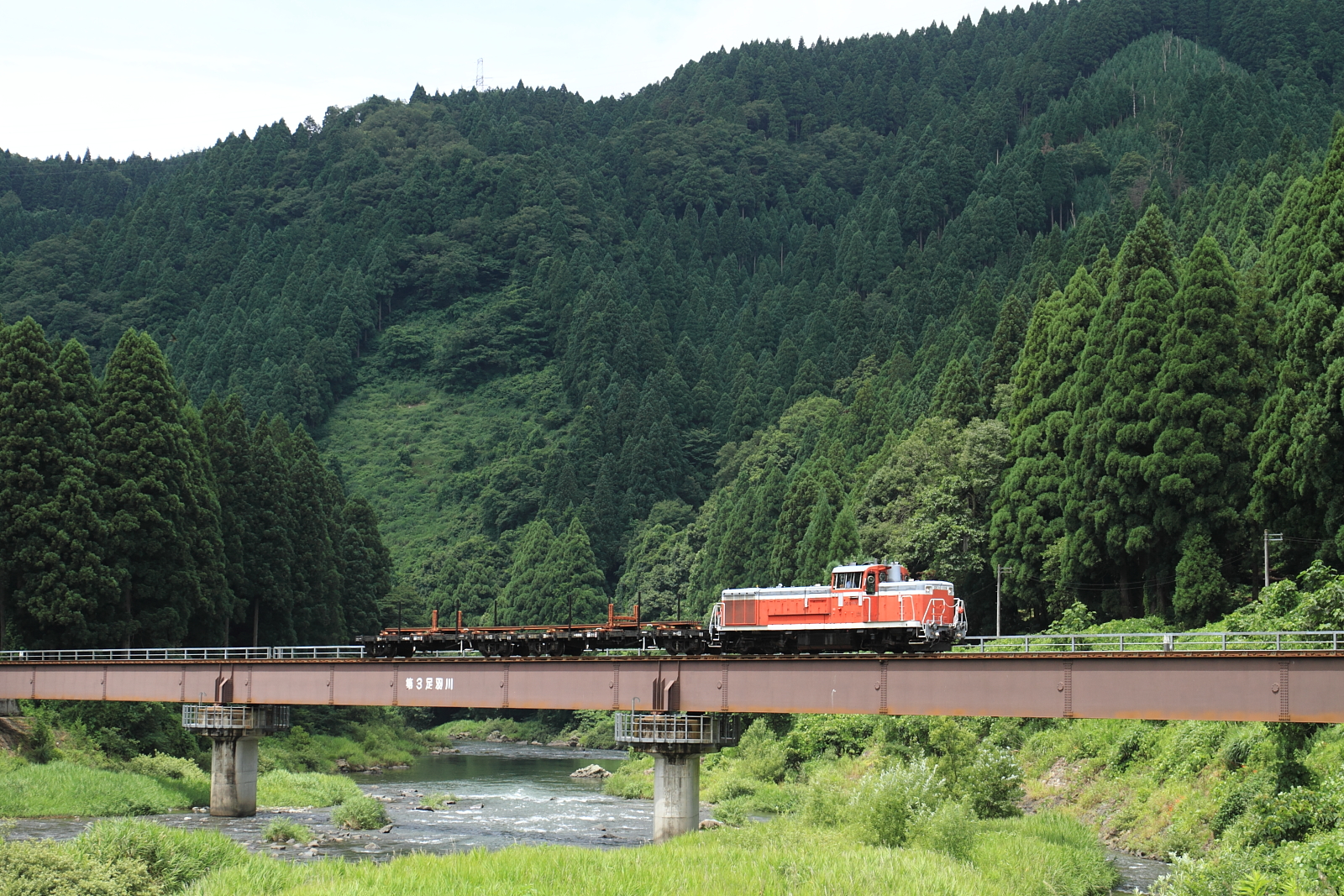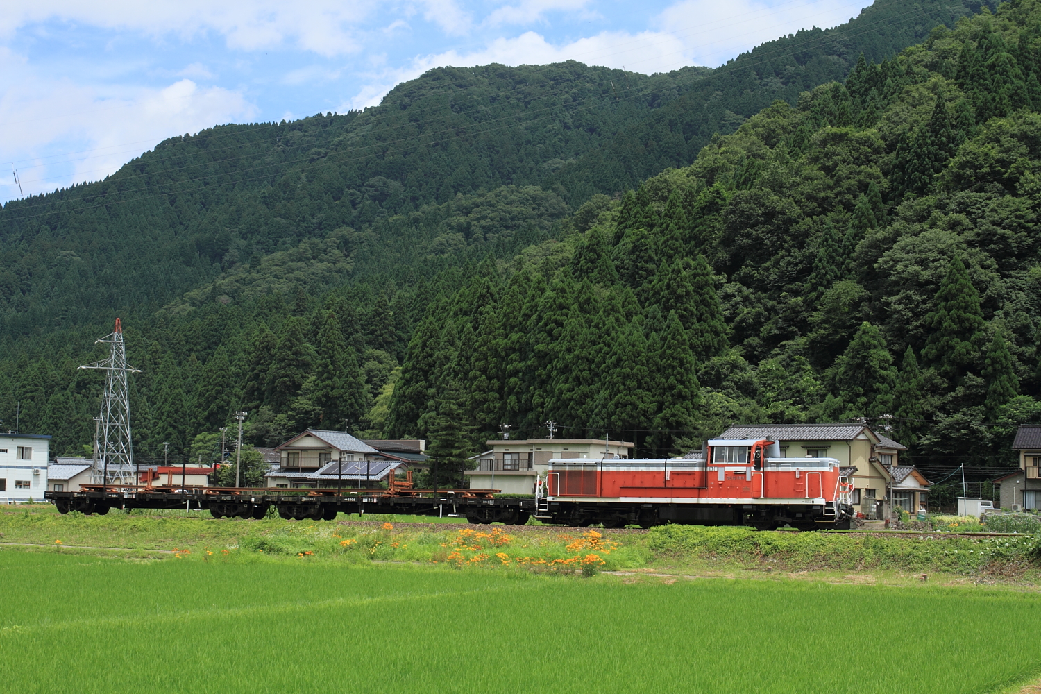 【越美北線】工9731(チキ2B)撮影 2016年【DE10】 H28.7.13越美北線にてチキ2両のレール運搬が南福井→越前大野間で運転されました。 工9731レ@一乗谷〜越前高田DE10 1119号機牽引でした。毎年、数回運転される越美北線工臨です。 @小和清水〜美山美山で少し停車し、上り列車と交換。 @美山〜越前薬師 @美山〜越前薬師 @計石〜牛ヶ原積載ありのDE10+チキ2Bが山間をゆっくりと登り、越前大野へ。越前大野に到着後、すぐに切離し、機回ししてチキを材料線へ押し込み。DE10はその日のうちに単機で回送されます。越美北線ももっと撮影地を開拓しないと、、、 [4回]