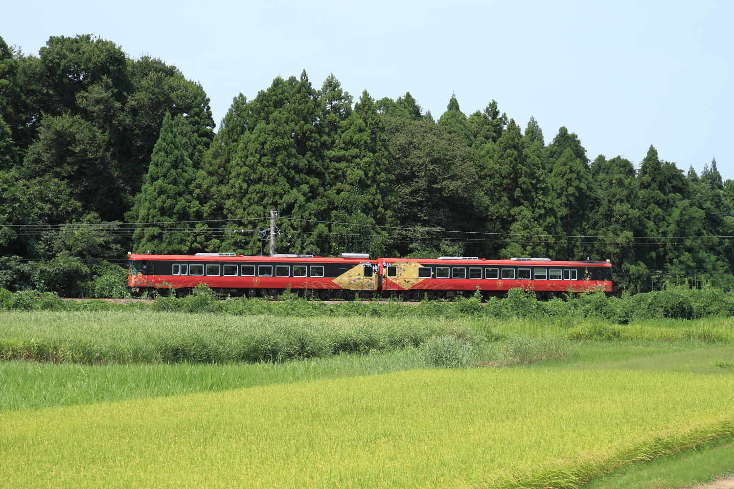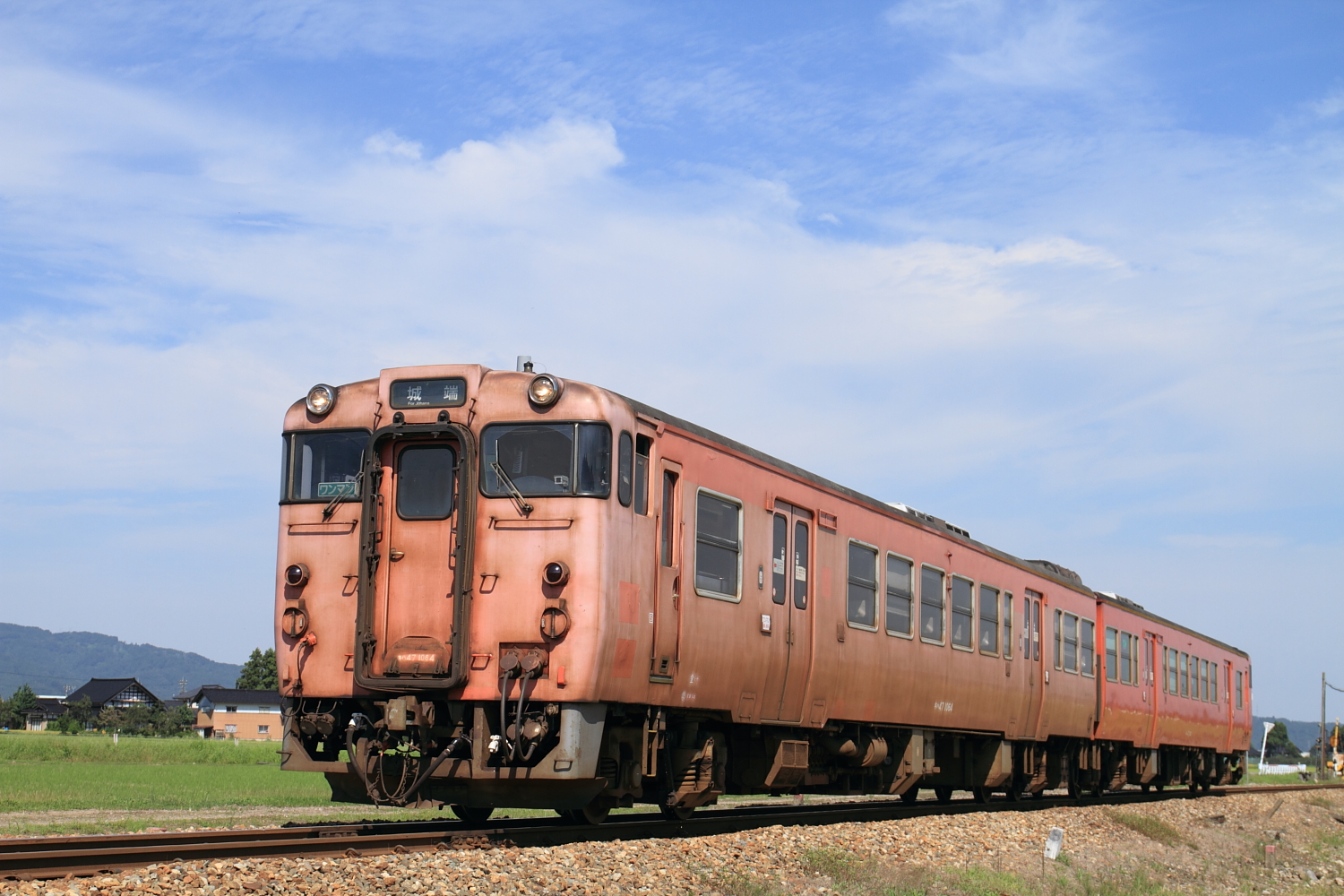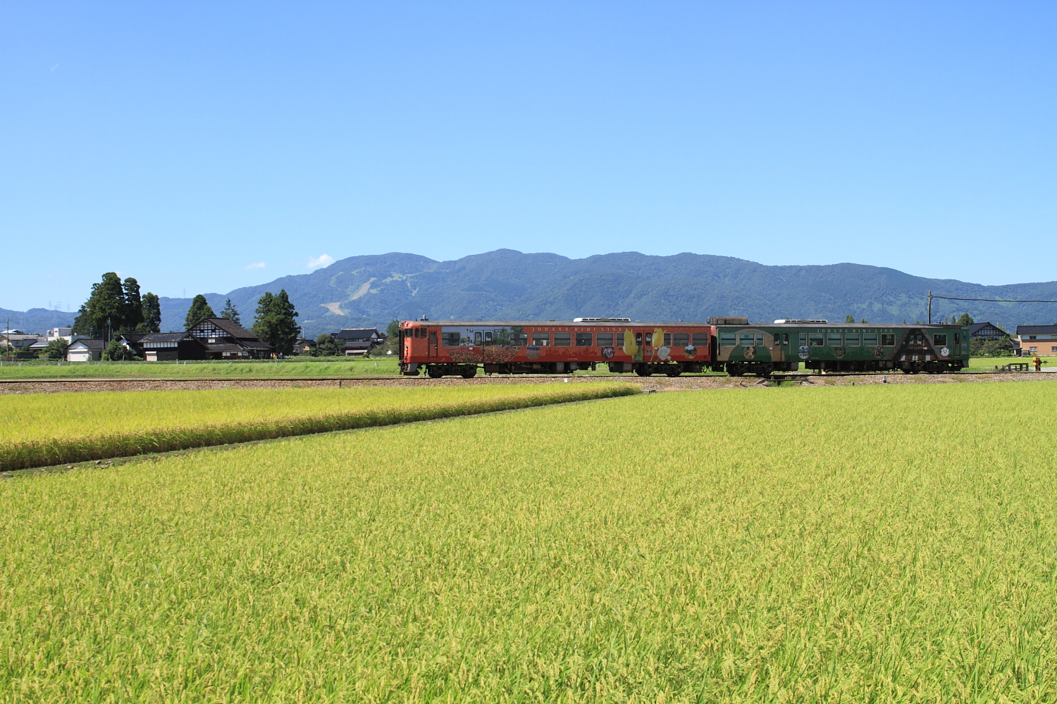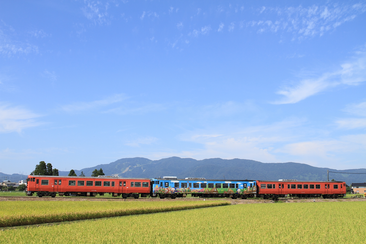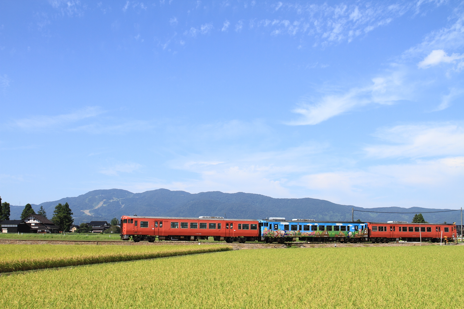 【城端線】ぶらり城端線撮影5【キハ40/47】 H28.8.31ぶらり、城端へ。 @越中山田〜城端特に時間は調べず行ったら、光線が残念な感じに。ダブルラッピングのキハ47を側面から。稲穂、散居村、スキー場バックのこの場所、お気に入りです。 [0回]