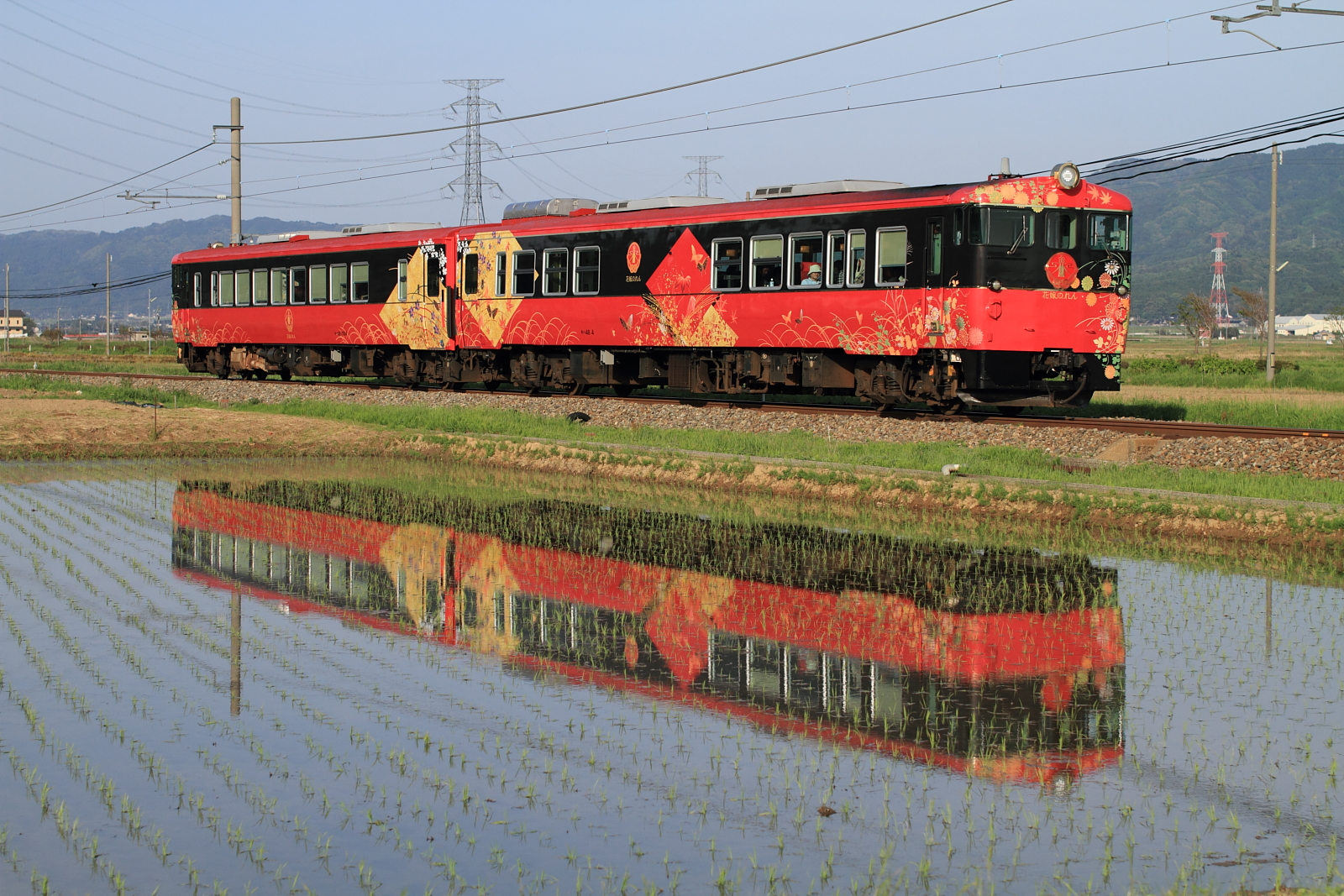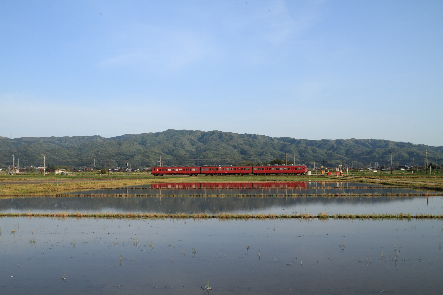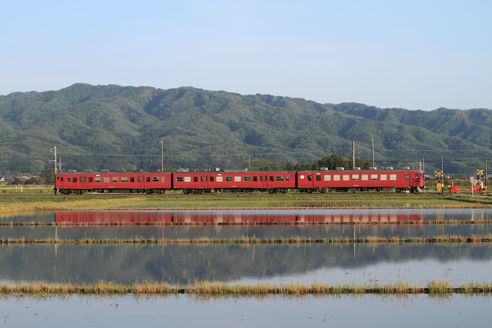 【七尾線】特急「花嫁のれん」撮影4【キハ48改】 H28.5.2いろいろと撮影しつつ、今度は七尾線へ。この時期(GW前後)の能登は田んぼに水が入って良い感じです。 8014D@金丸〜能登部色鮮やかな、特急「花嫁のれん」号。せっかくなので、後続の普通列車も記録。 858M413系でした。と、また虫が写り込んで…と思いましたがコレはレンズ側のゴミですね。これはひどい。。。50単に変えて、下り普通を。 853Mこちらも413系。最近は狙った列車しか記録していないので、このような記録も大事ですね。 [1回]