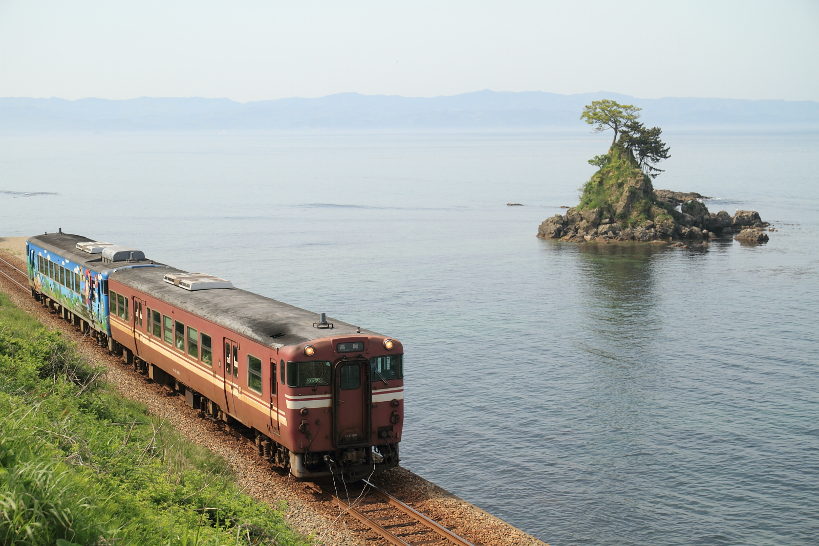 【氷見線】最後の高岡色【キハ47】 H28.5.2「べるもんた」を撮影しようと雨晴海岸へ行くも、時間もよく調べず運転があるのかもわからなかったため、とりあえず1枚。 540D@越中国分〜雨晴運良く、キハ47 1091(最後の高岡色)が通過。後ろはハットリキハ40でした。なかなかスッキリ晴れた雨晴が見られません… [0回]