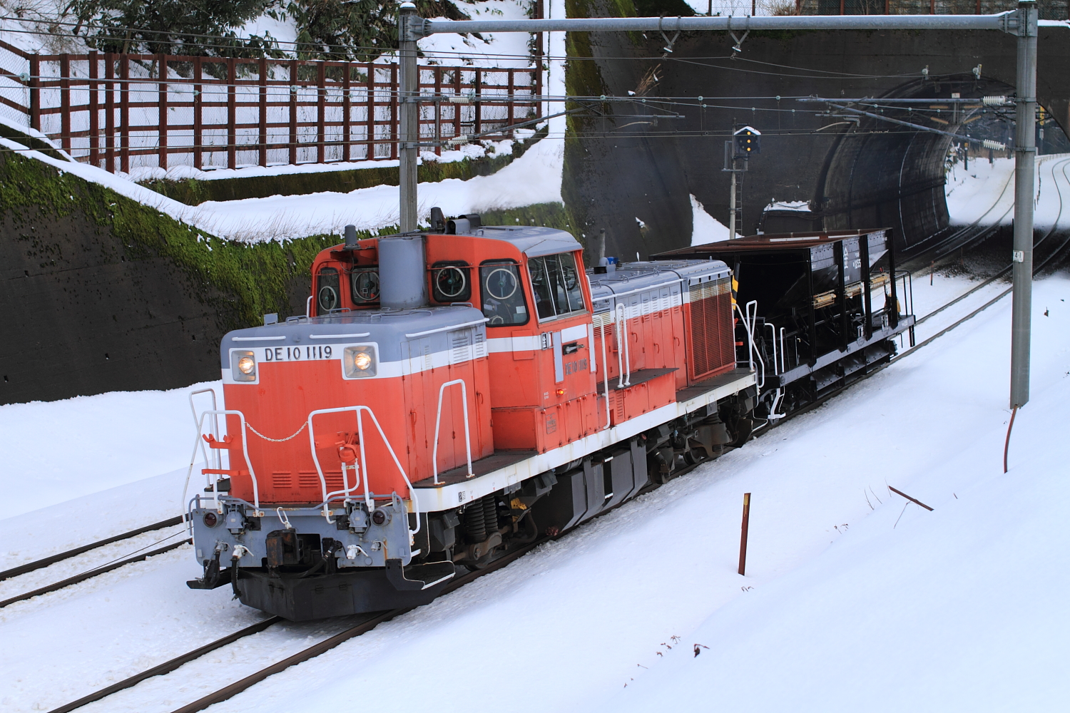 【北陸本線】配9330 (DE10 1119号機牽引)ホキ1B撮影【DE10】 H30.1.30ホキ800-1255が松任から敦賀へ輸送されました。雪がやみ、少し晴れ間が見え始めた北陸本線を短い編成が通過。 配9330DE10 1119号機牽引でした。昨年9月に松任へEF81牽引で運ばれたホキですね。 [0回]