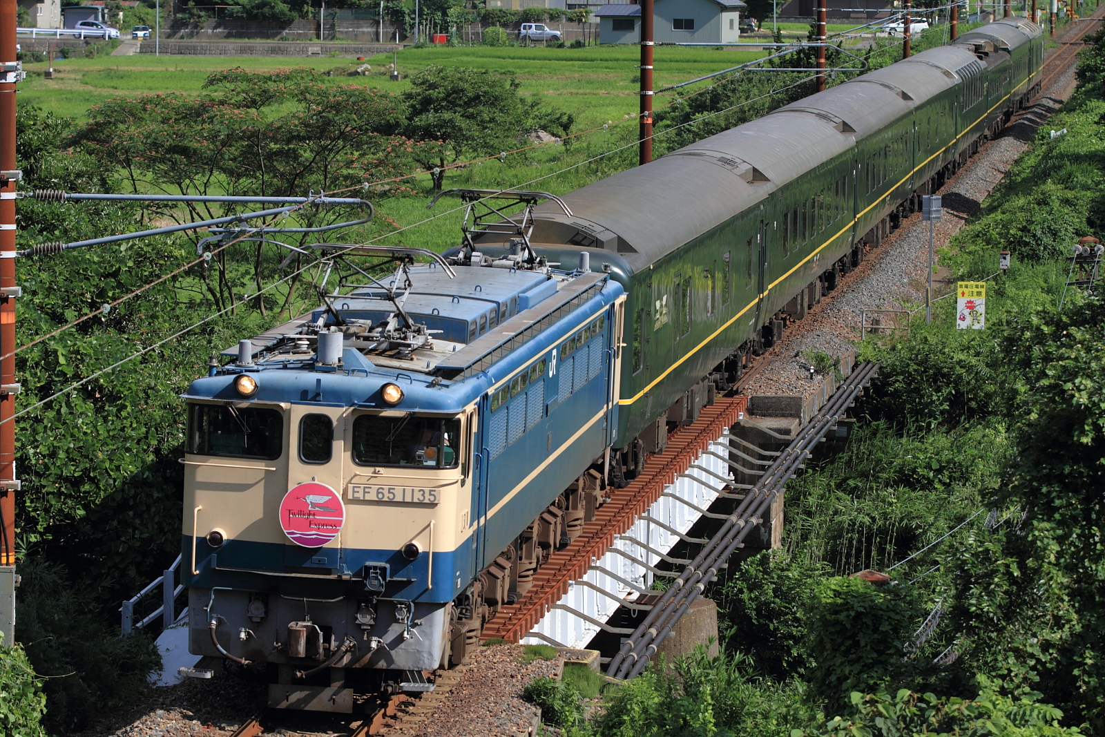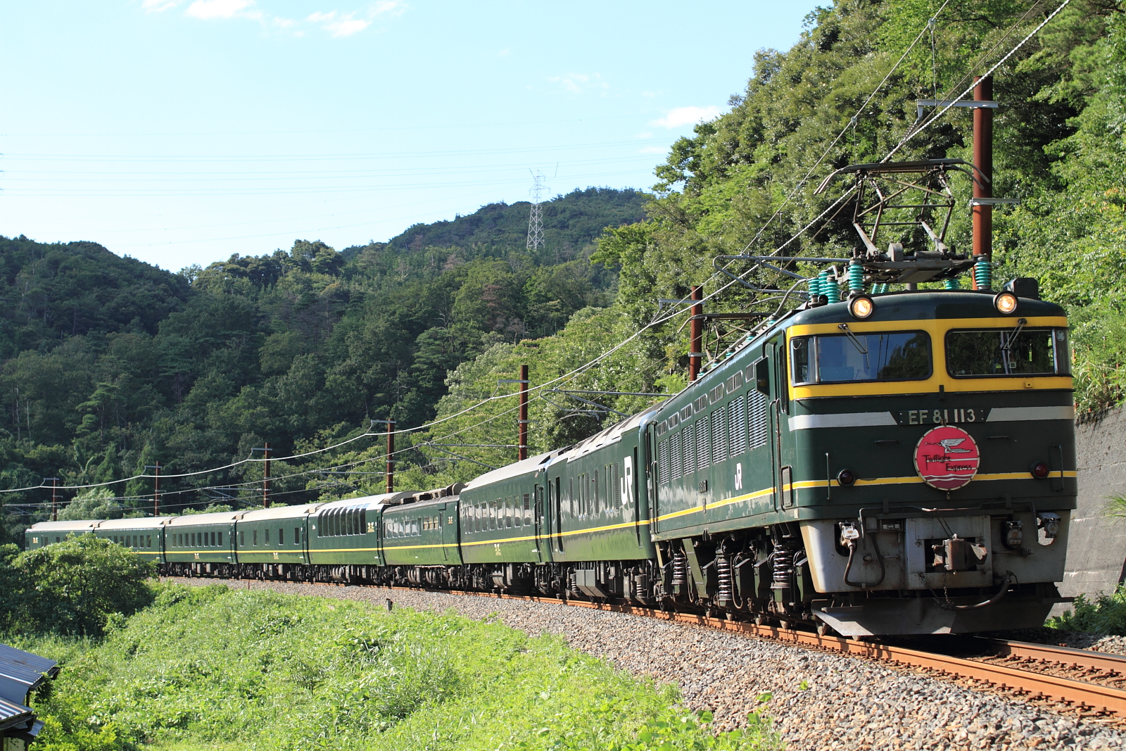 【北陸本線】特別なトワイライトエクスプレス号撮影【EF65/EF81】 H27.7.14大阪〜札幌間を走るトワイライトエクスプレス号は引退となりましたが、編成を組み替えてスイート+ロイヤルのみの「特別なトワイライトエクスプレス号」として運転されています。今のところ発表されているコースは全9回の予定のようで、今回は8回目となる列車を撮影。 9041レ@新疋田〜敦賀EF65 1135号機牽引でした。この区間でのEF65はとても新鮮です。この日は先行列車遅れなどで、およそ25分ほど遅れての通過でした。そしてすぐの折り返しのため、上り線へ移動。 9042レEF81 113号機牽引でした。敦賀到着後すぐに機関車交換を行ったのでしょう、数分で折り返してきました。セッティグ中に練習電…かとおもいきやEF81の姿が見えたため焦って撮影、なんとか記録。敦賀へのトワイライトはあと何回あるのでしょうか…。 [0回]