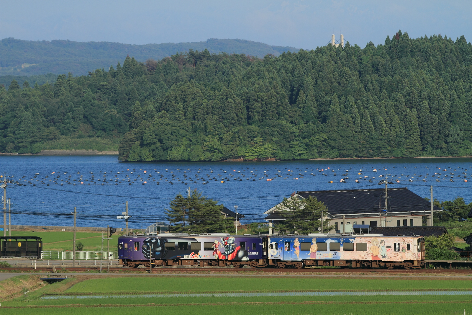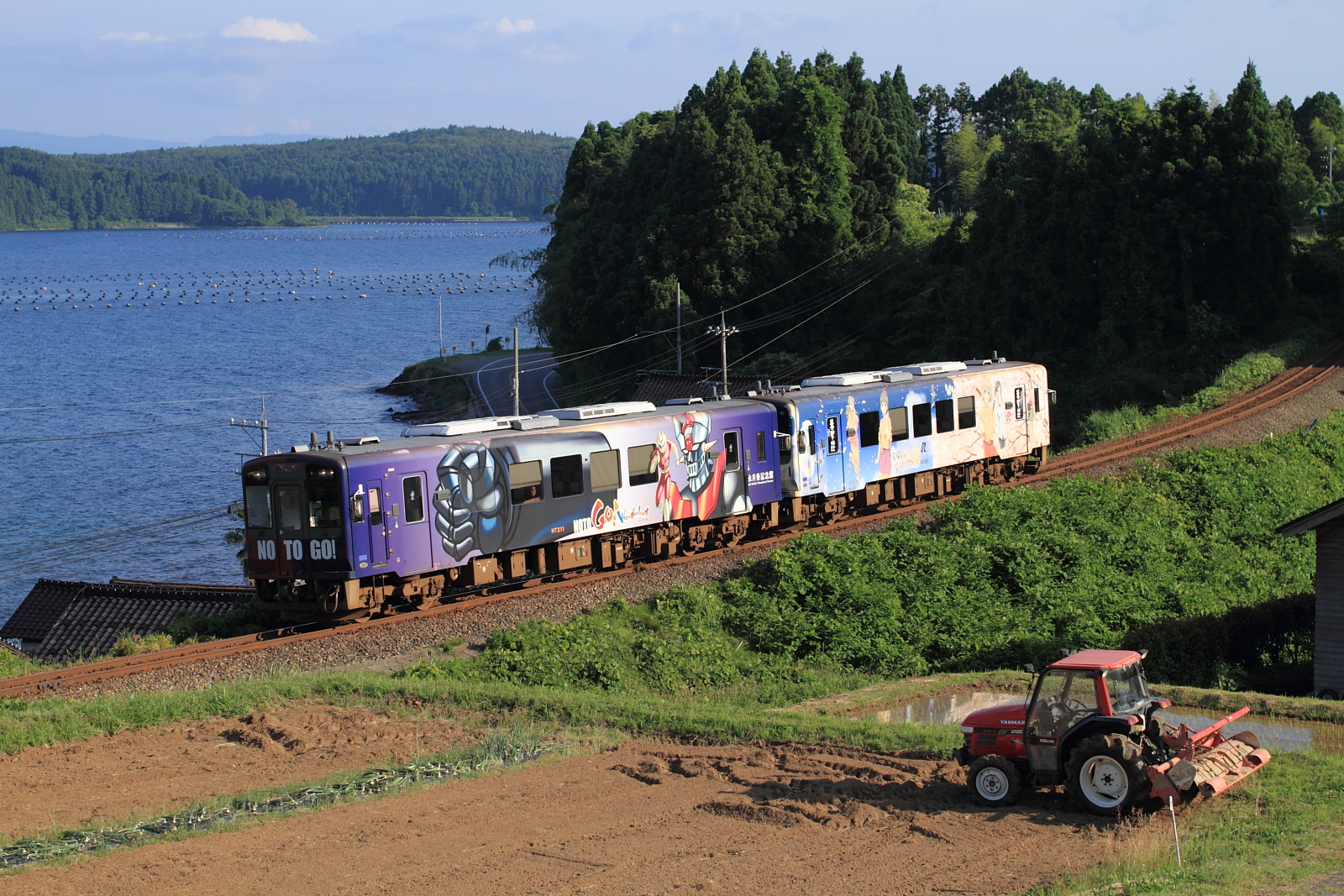 【のと鉄道】花咲くいろはラッピング列車 27【NT202】 H27.6.10良い天気だったので、ぶらり「のと鉄道」撮影。 140D@西岸〜能登鹿島「マジンガーZ+花咲くいろは」のラッピング列車を記録。少しですが立山連峰も見えるポイントで撮影。そして、折り返しの時間まで、西岸駅こと湯乃鷺駅と猿田彦温泉でほっこり。 141Dこちらはトラクターとの1枚。 144D日没前の西岸駅へ進入する場面を記録。この時期は日が長く、良い光線になりますね。 [0回]