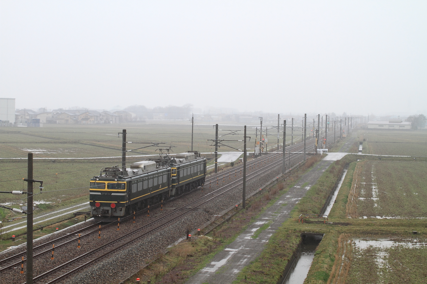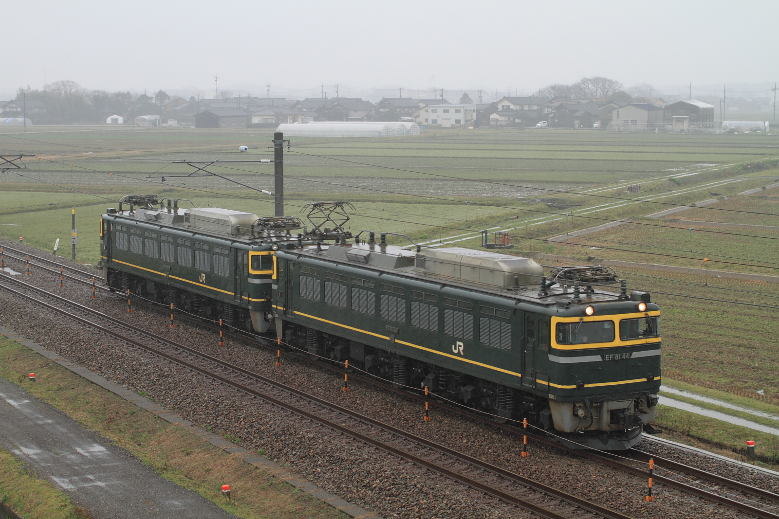 【北陸本線】EF81 44+EF81 43号機が松任へ【EF81】 H27.3.19ついに敦賀の機関車が松任へ。。 配9281レ@美川〜加賀笠間EF81 44号機牽引でした。次位に43号機を無動力で連結し、松任へ…。長らく北陸地区の客車を牽引して、トワイライトエクスプレスの先頭にたって走ってきたEF81もついにその役目を終えようとしています。16日には103号機、106号機も松任へ行き、この後も…敦賀機関区や残るEF81が今後どうなるのか、気になるところです。おまけに前走りの貨物列車を掲載し、この辺で。 [1回]
