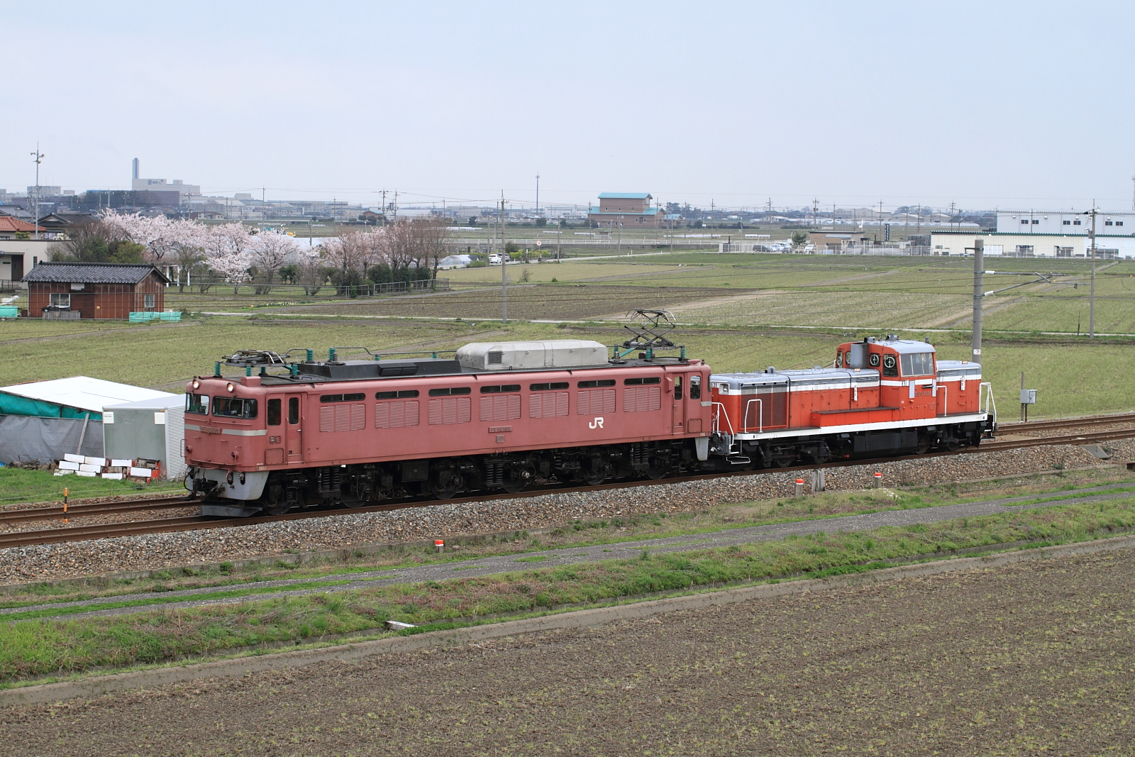 【北陸本線】DE10 1531号機が下関へ【EF81】 H27.4.7北陸で活躍していたDE10 1531号機が松任から下関へと旅立ちました。 配9570レ@美川〜加賀笠間EF81 108号機牽引でした。少し桜をバックに…天気がイマイチでした、、、下関での今後の活躍に期待です。 [1回]