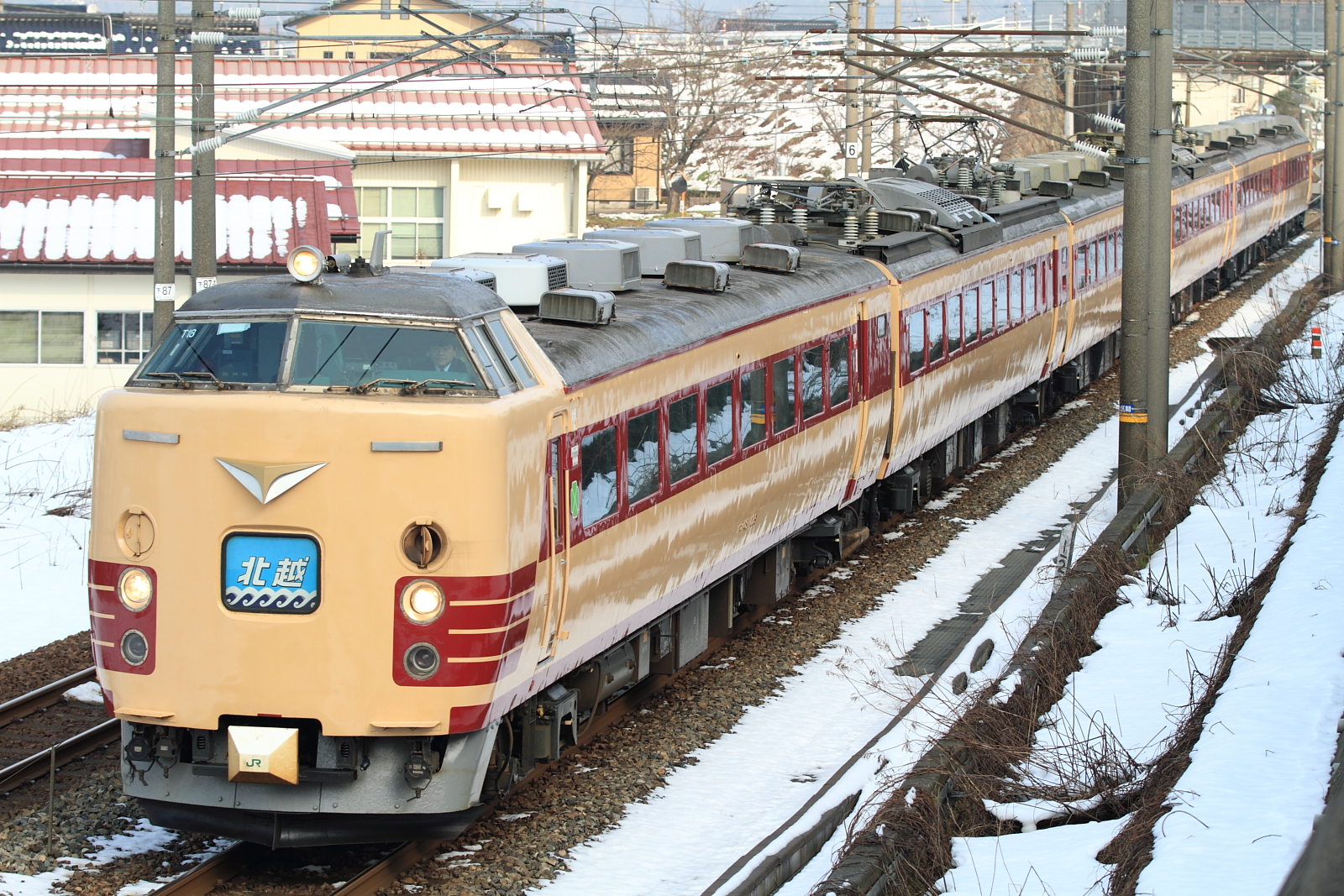 【北陸本線】北越2号T18編成撮影【485系】 H27.1.5新年、あけましておめでとうございます。新年1発目の撮影は今話題の485系T18編成。 1052M(北越2号)いつもの場所でまだ485系を記録していないと気づき、撮ったは良いものの直前で残念な薄曇り、そしてこれまた話題の……タイフォン半開き。これはこれで、良い記録となったと割り切って、新年最初のブログ更新となります。今年もブログ共々、よろしくおねがい致します。 [0回]