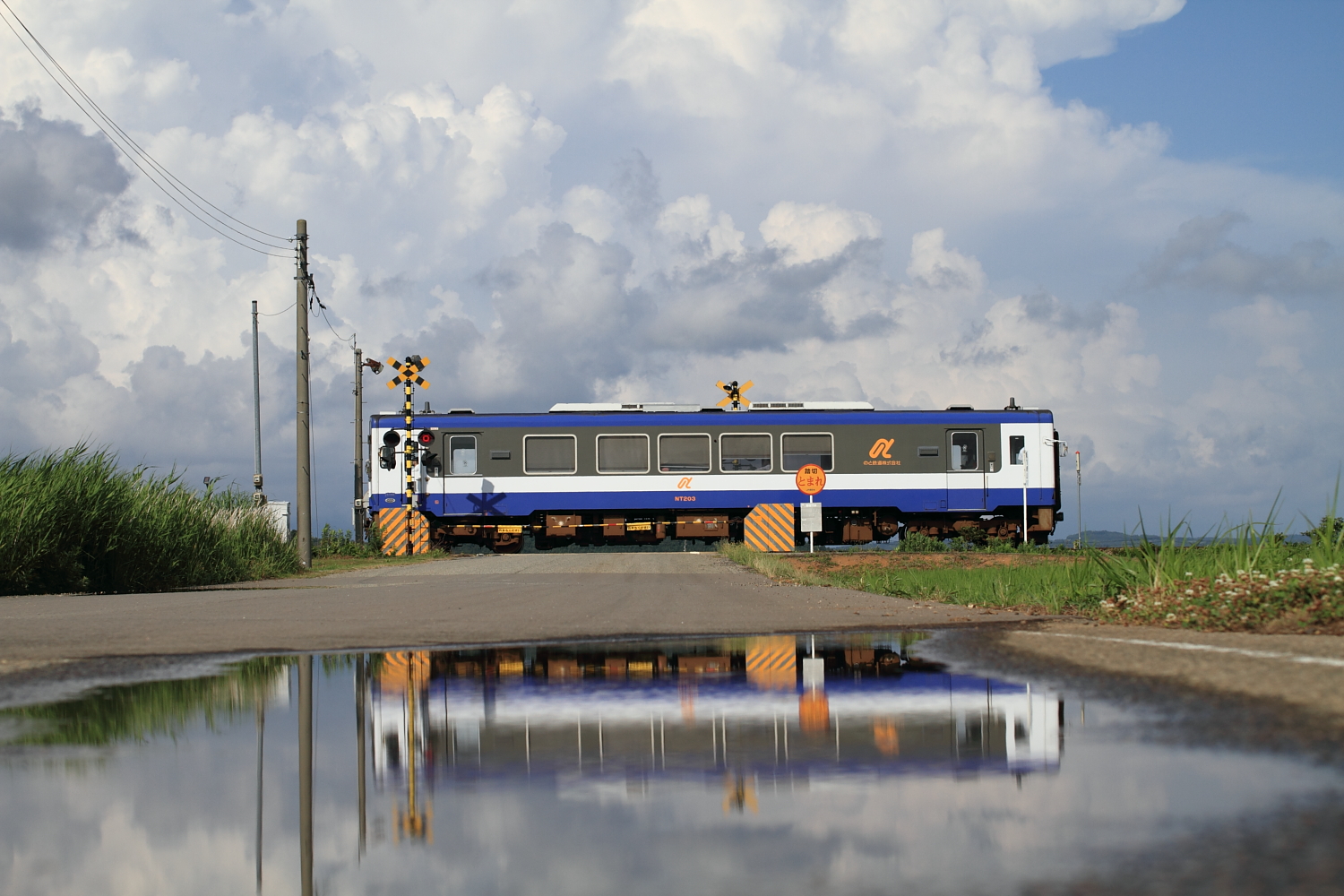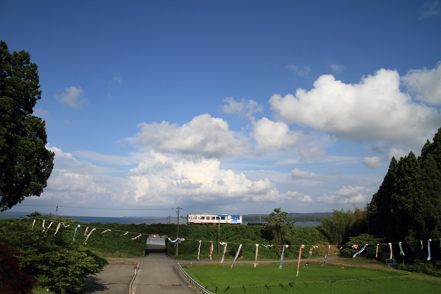 【のと鉄道】花咲くいろはラッピング列車 22【NT201】 H26.6.29雨上がり、天気が良かったので撮影。 水たまり、道路に寝そべって撮影。 花咲くいろはNT201は、こいのぼりと共に。このこいのぼり、アユとかいろいろいます。 [0回]