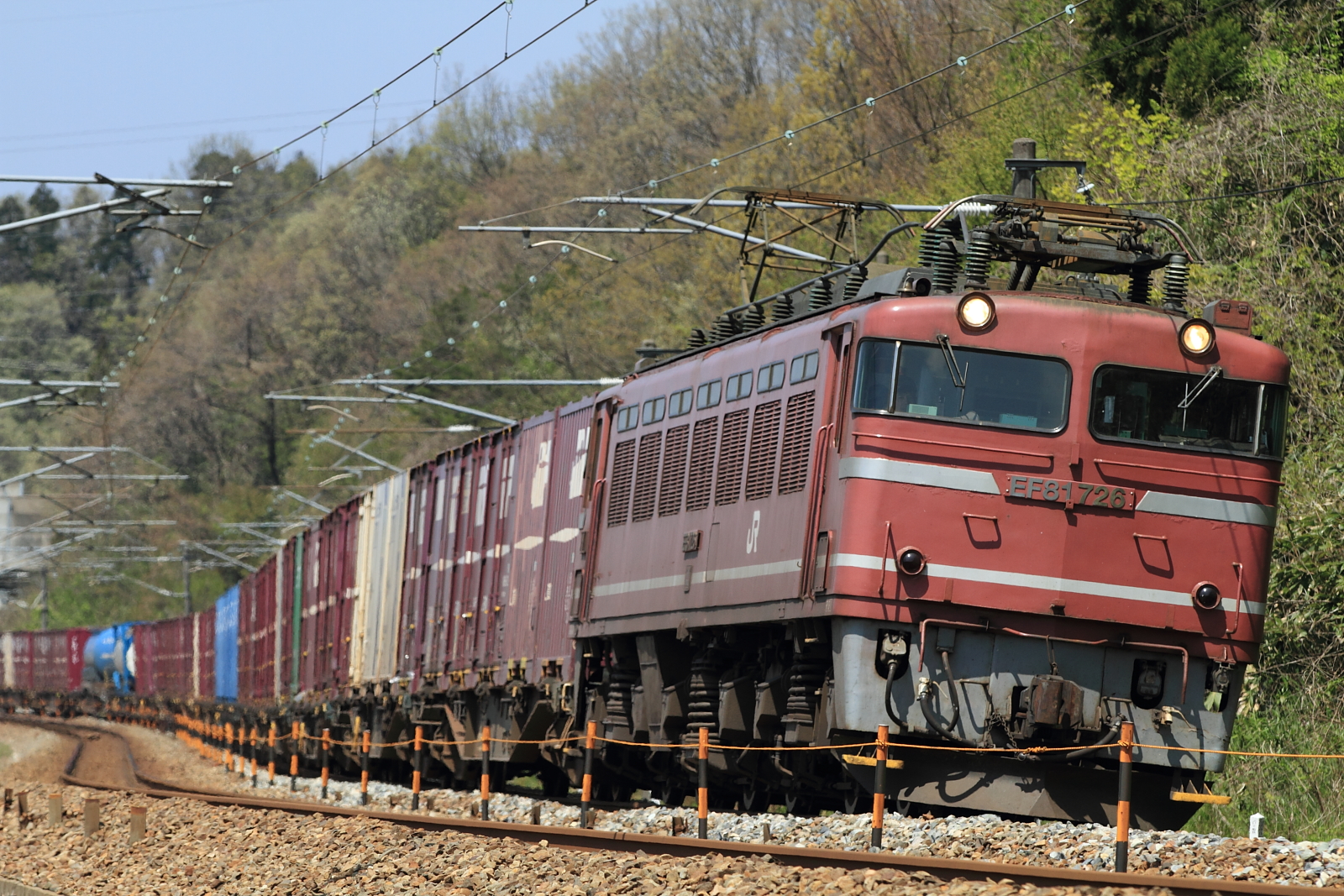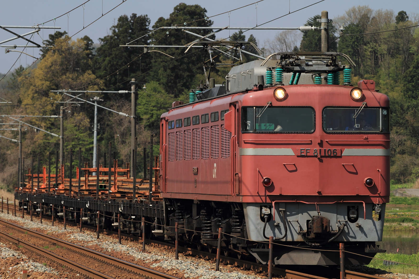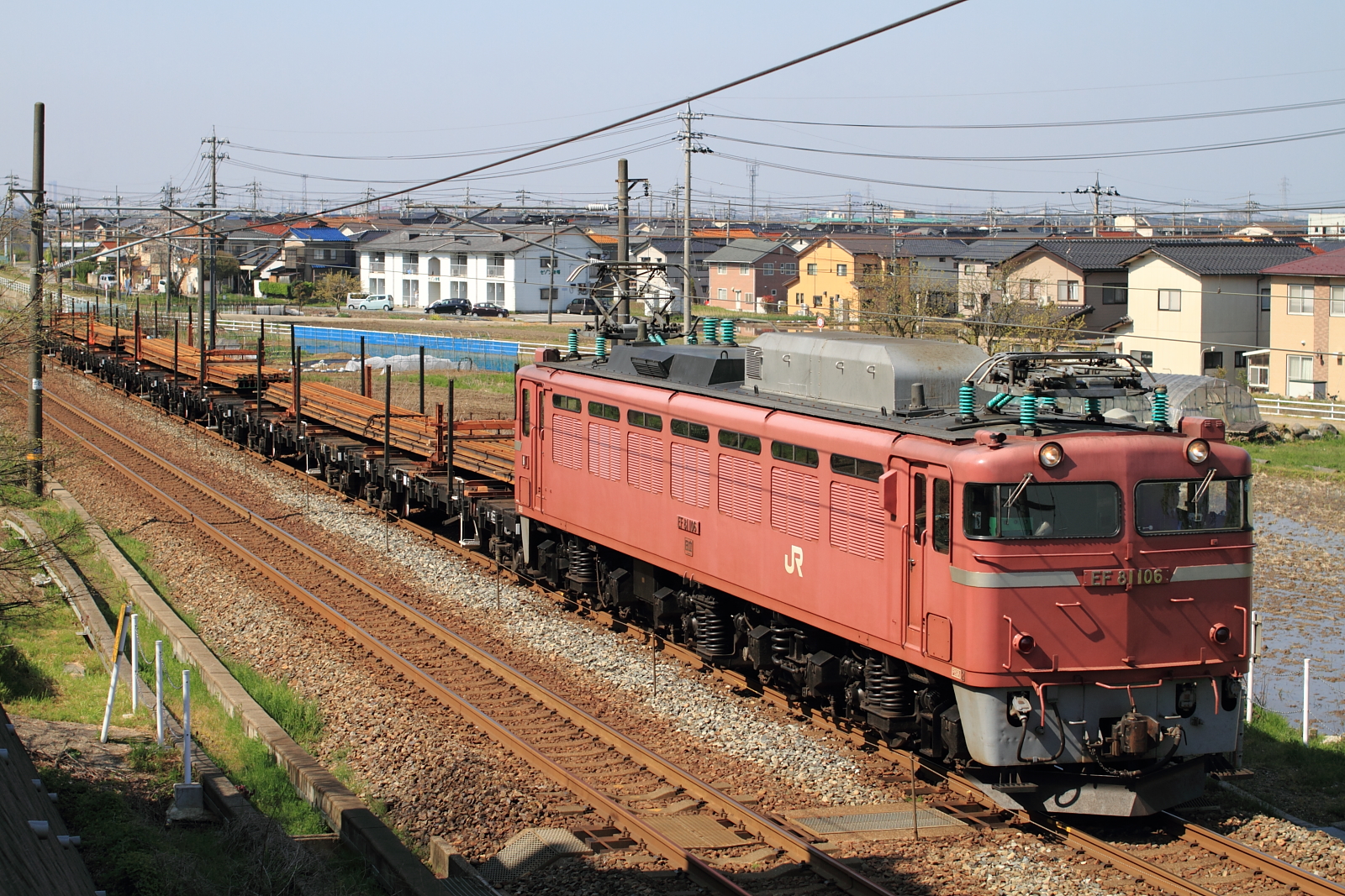 【北陸本線】工9573レ チキ6B撮影【EF81】 H26.4.23チキ6Bレール積載を撮影。 工9573レEF81 106号機の牽引でした。 工9573レ気持ちの良い天気だったので、のんびり撮影。1053M T12ヘセ 3097レ3097レはサワ急病人で遅れての運転でした。もっとひいて撮影すれば、後ろまで入ったのに… [0回]