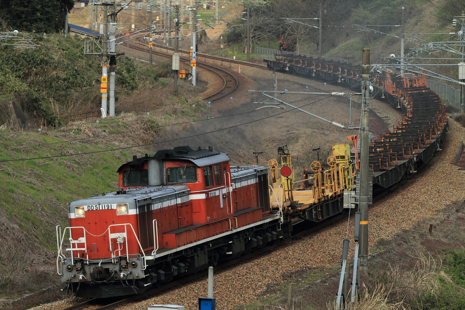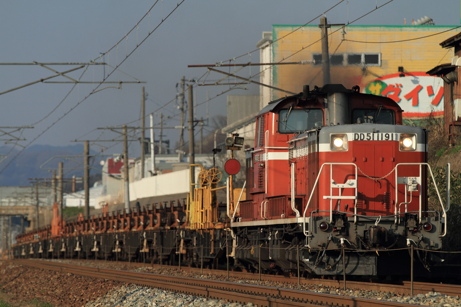 【北陸本線】工9588レ撮影【DD51ロンチキ】 H26.4.14年に数回運転される、直江津ロンチキの返空を撮影。 工9588レDD51 1191号機牽引でした。安楽寺付近をケムリを上げながら勾配を登ります。金沢支社の工臨は毎回時刻が変わり、今回はのんびりスジでした。 工9588レバックにダイソーさんが……むむむ。 [0回]