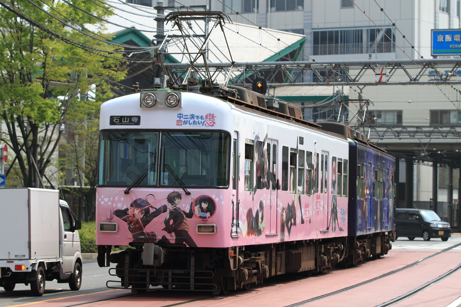 【京阪電車】中二病でも恋がしたい ラッピング車撮影【大津線】 H26.4.17京阪大津線で中二病でも恋がしたいラッピング車撮影。 前回は「けいおん」ラッピングで訪れましたが、今回も500円のフリーきっぷです。たまには乗り鉄も良いものです。フリーきっぷが毎日使えるものイイですね。 [0回]