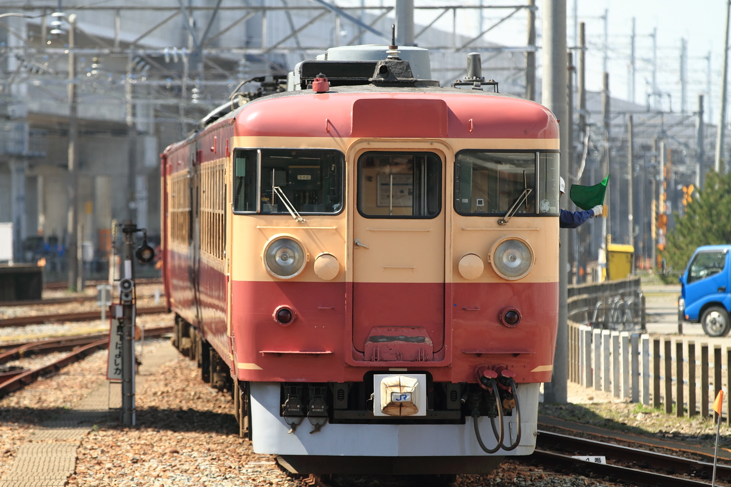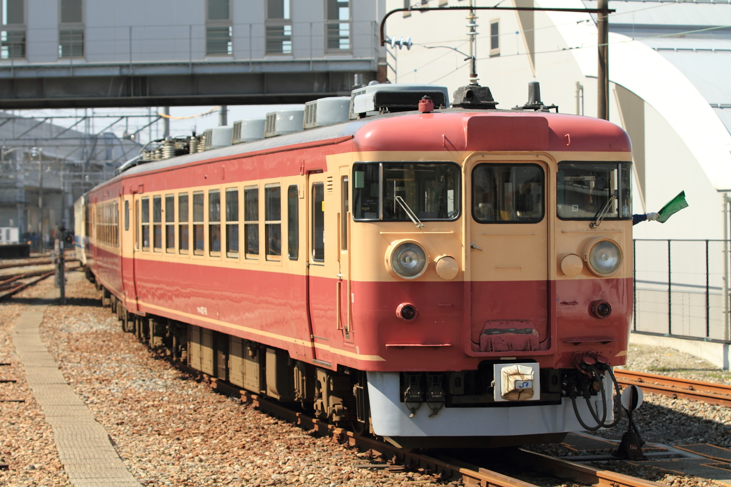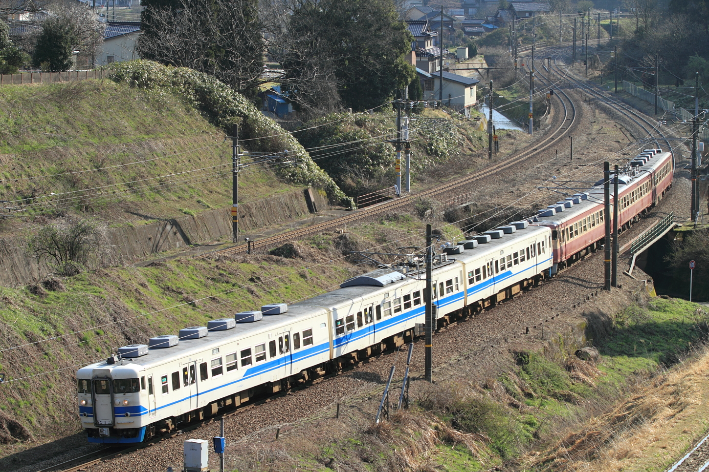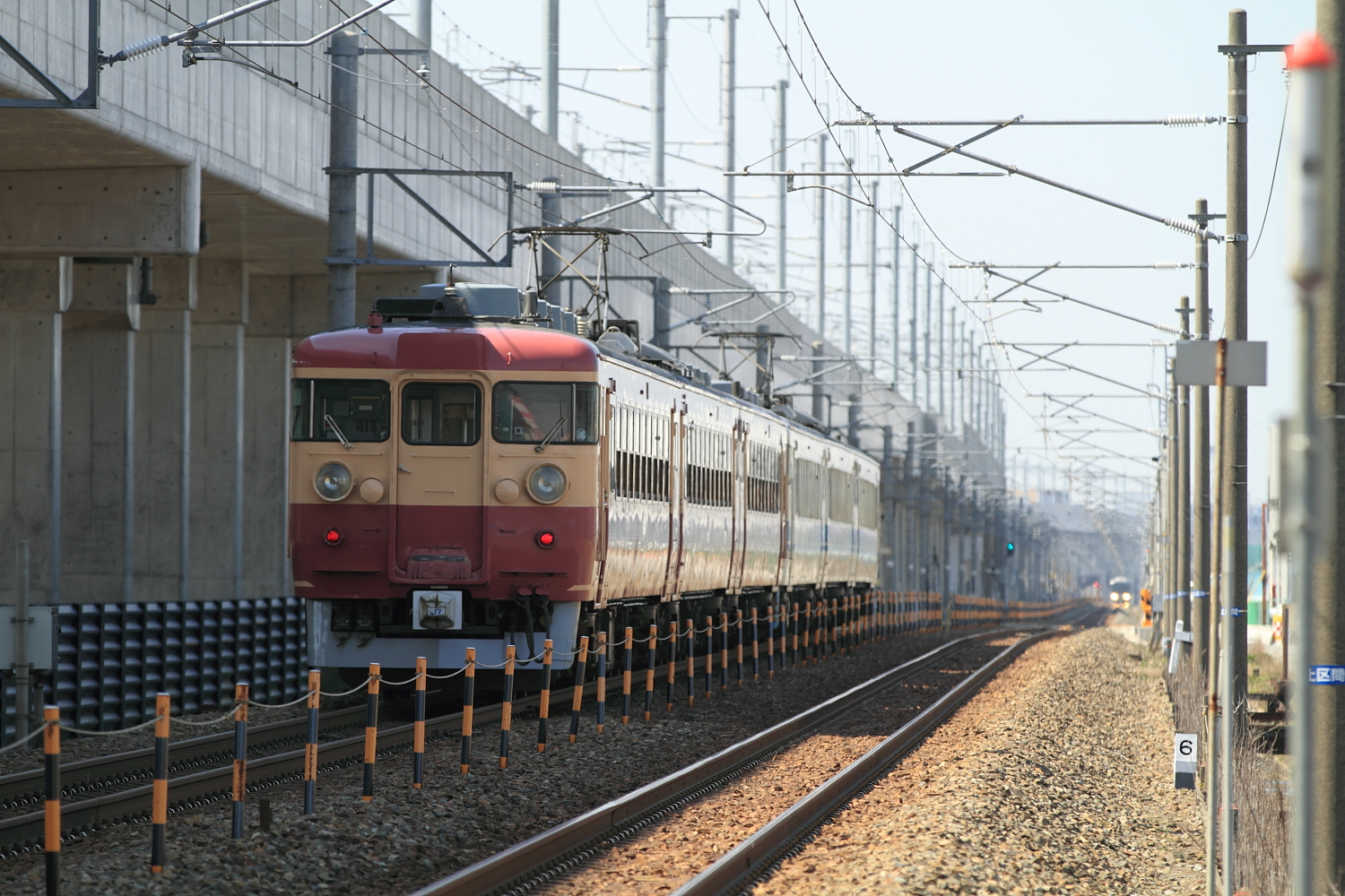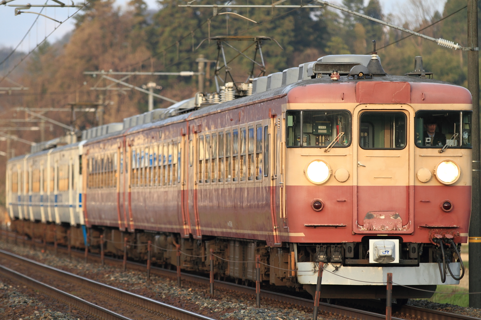 【北陸本線】A19ヘセ撮影【475系】 H26.4.7綺麗なA13ヘセは留置となってしまいましたが、A19ヘセはまだまだ現役。 朝日を浴び、413系と6連を組んで運転。 安楽寺では413が先頭。 固定運用がいつまで続くのか…475系A19ヘセとトワイライト、徹底的に撮ります! [0回]