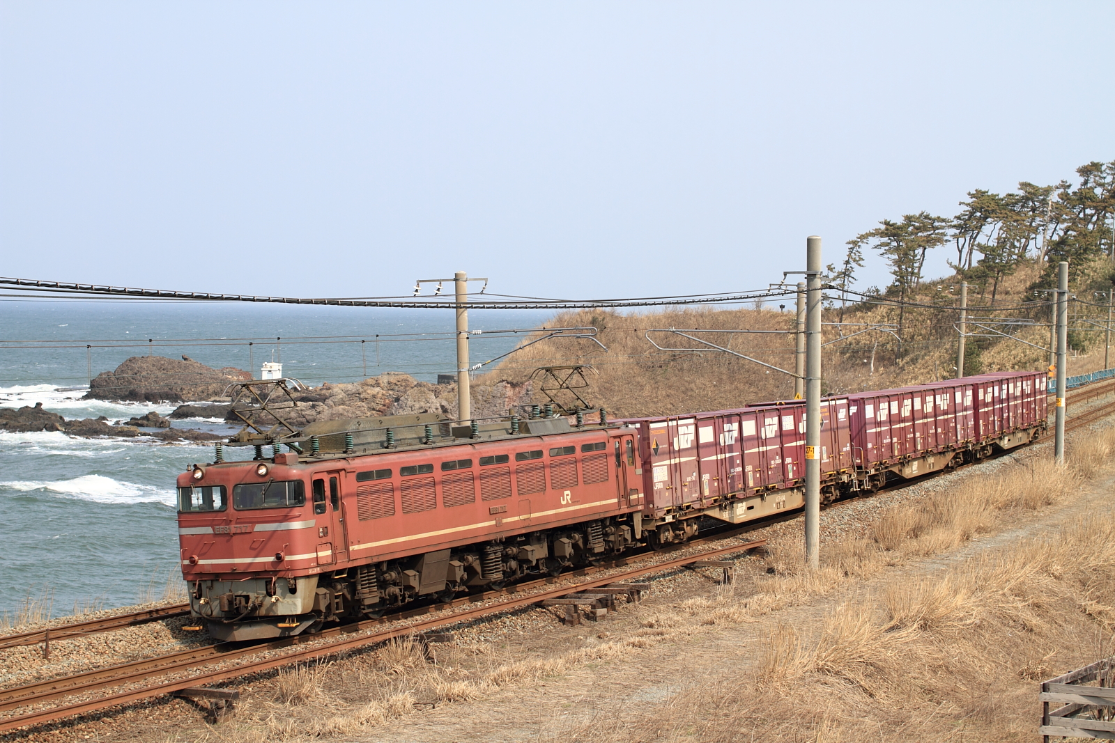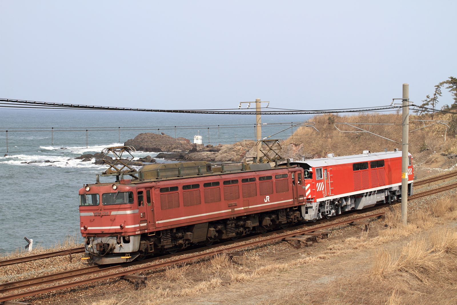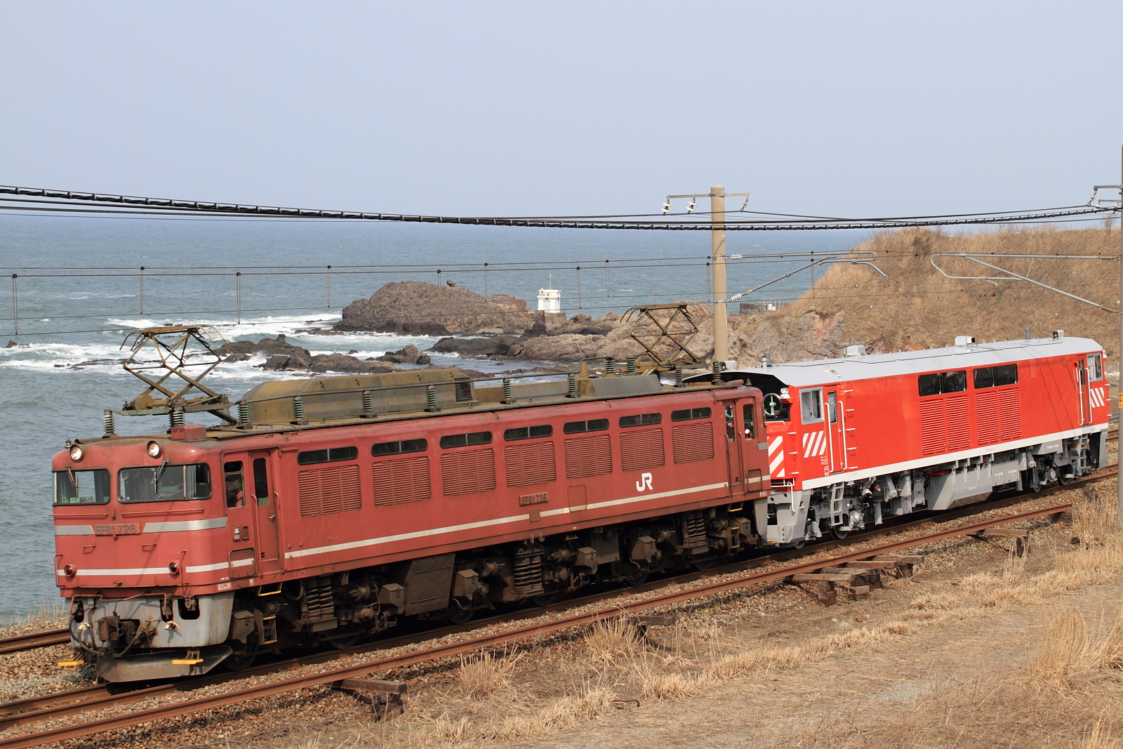 【信越・北陸本線】キヤ143甲種回送【キヤ143-2】 H26.3.122編成目となる、キヤ143-2が甲種回送されました。今回は海をバックにと青海川付近へ。1054MT13ヘセの北越号を撮影。 74レ続いて短い74レはEF81-717号機牽引。 9560レ甲種はEF81-726号機牽引でした。 キヤ143-1の甲種同様の場所で撮影。 前回より少し天気が良かったし、構図も良くなりました。キヤ143-3はいつになるのでしょうか…。 [0回]