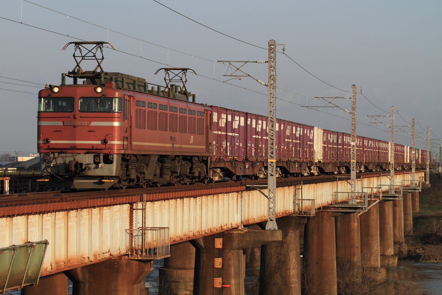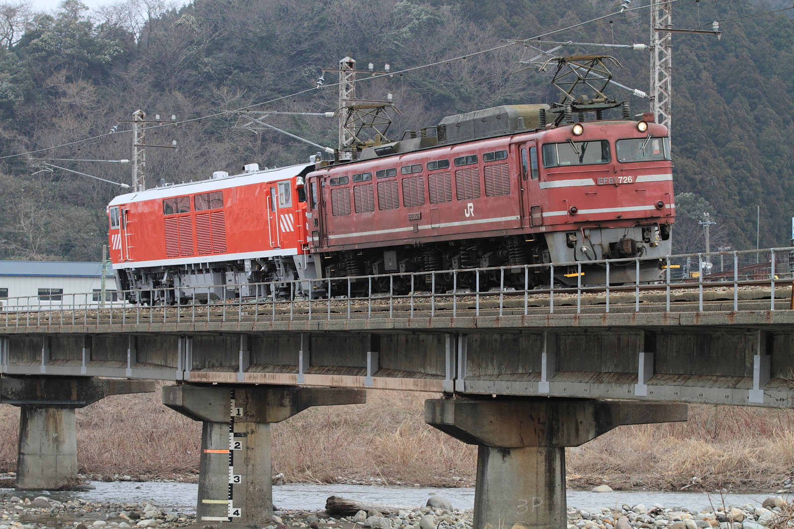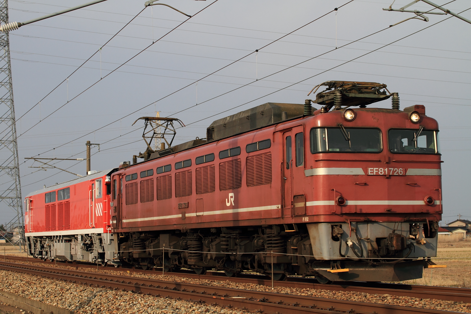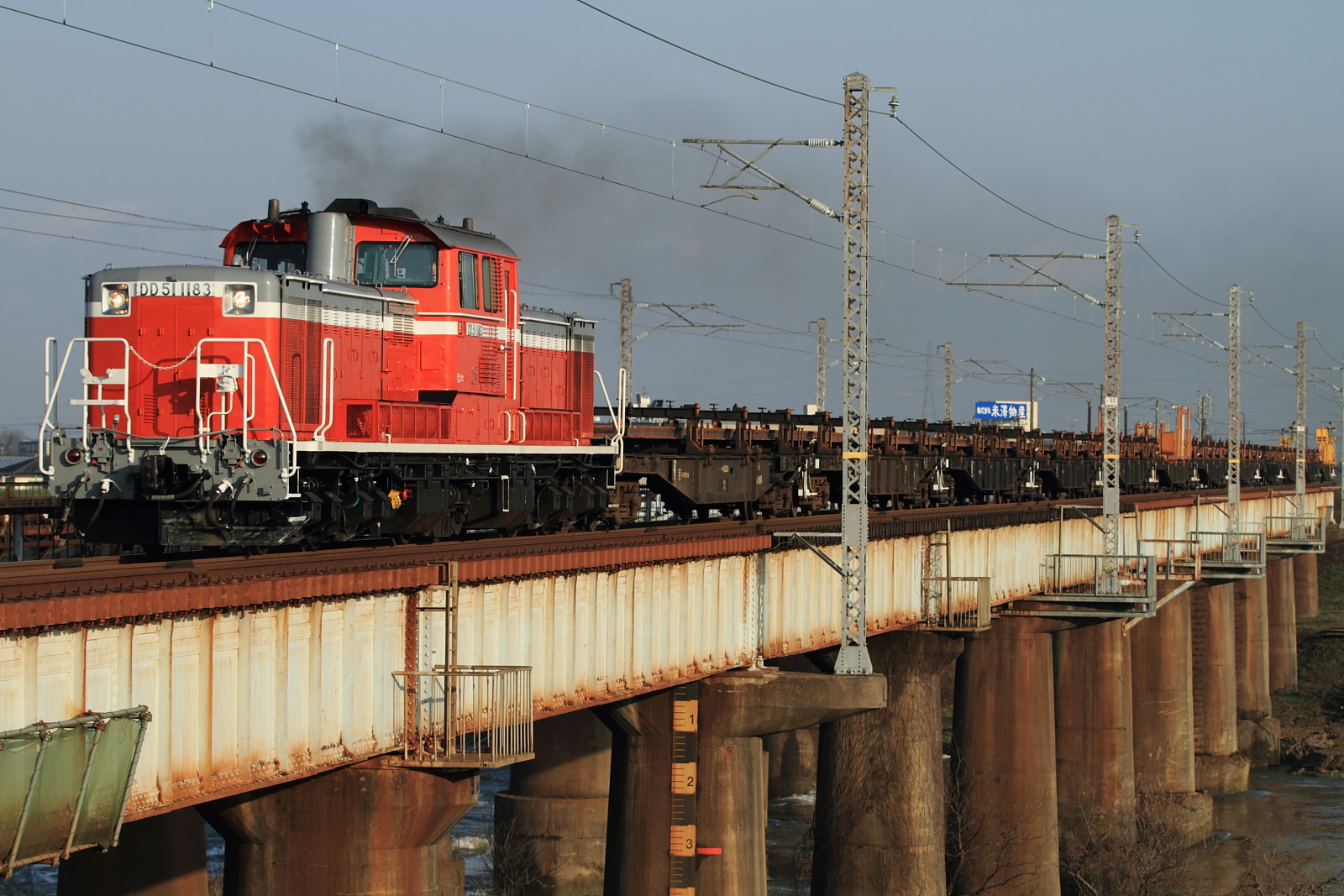 【北陸本線】工9584レ ロングレール輸送【DD51 1183】 H26.3.19糸魚川から折り返し、工9584レとなり、牽引機も引き続きDD51 1183です。の前にEF81貨物を。 3092レ EF81 721両パン上げのEF81貨物も久々に撮りました。 工9584レ朝日を浴び、ケムリもくもくのピカピカDD51!九頭竜川は初めてでしたが、朝はとても気持ちが良い。ここで日本海号をなぜ撮っていなかったのか、悔やまれます… [0回]