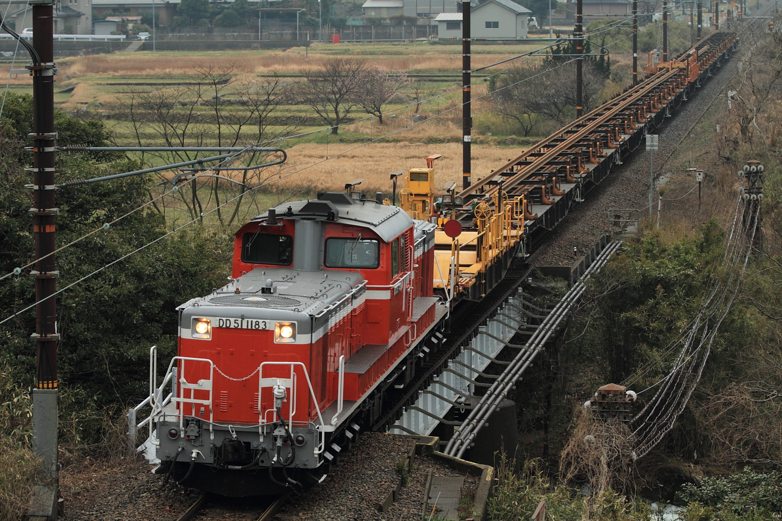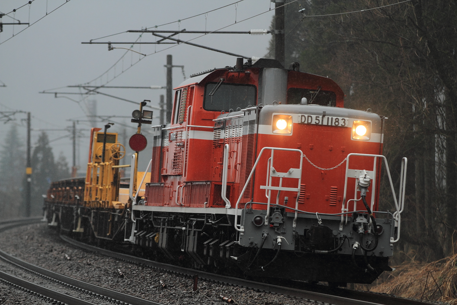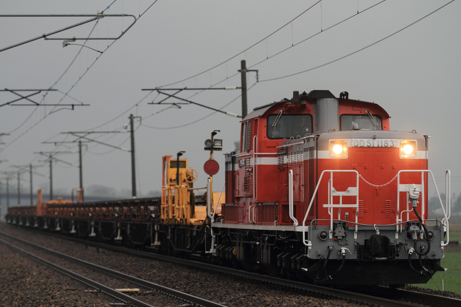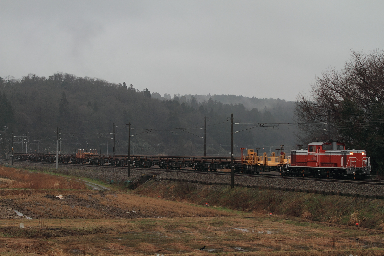 【北陸本線】工9589レロングレール輸送【DD51 1183】 H26.3.18糸魚川折り返しのロングレールチキ工臨が運転されました。全検明けのピカピカDD51 1183による牽引でした。 工9589レ積載のロンチキは久々に記録しました。 しかし天気が悪い悪い… 構図もありきたり… ですが、良い記録となりました。工9589レは一気に糸魚川まで運転し、給油・水・砂を入れ、折り返し工9584レに続きます。 [0回]