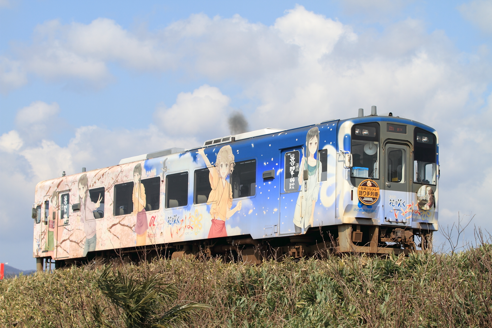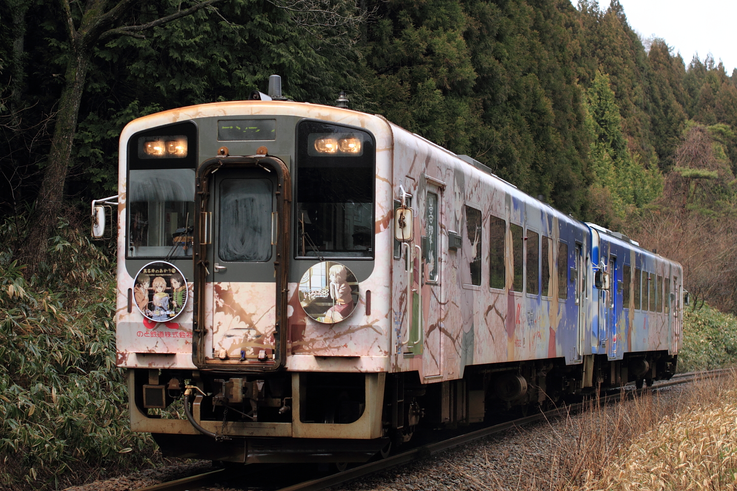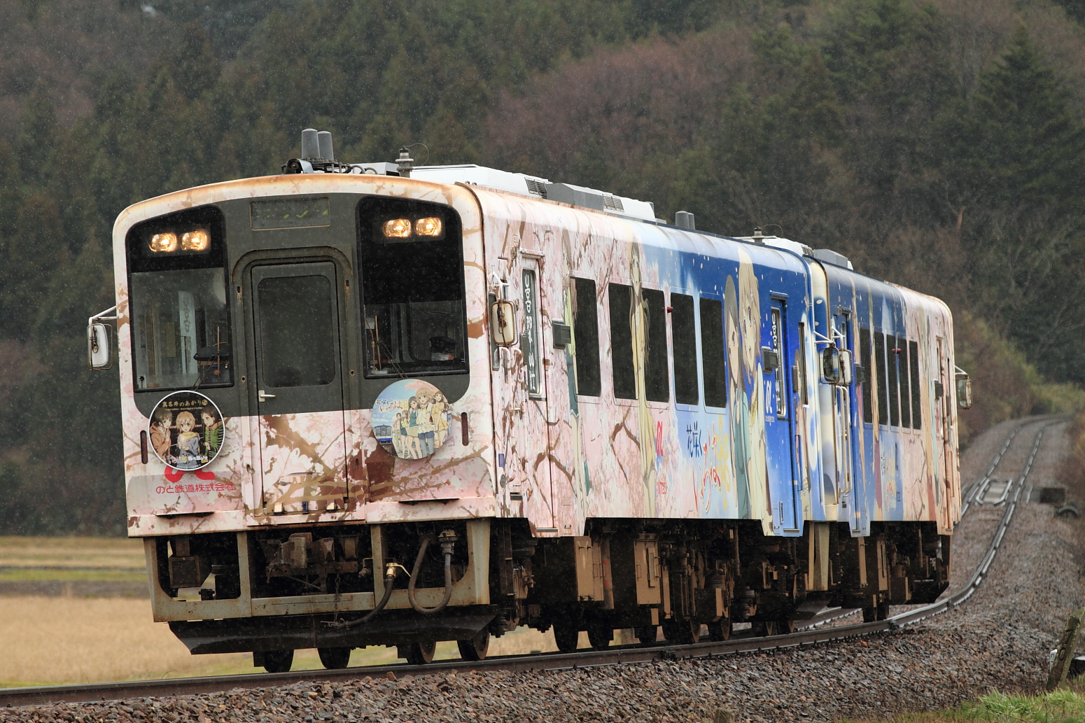 【のと鉄道】花いろラッピング・真名井のあかり列車運転【NT201/NT202】 H26.3.21のと鉄道花咲くいろはラッピング車2連による、「真名井のあかり列車」が運転されました。 136D@西岸~能登中島送り込みは136Dを増結し、ヘッドマークも取り付けての運転でした。 9935D@能登中島~笠師保 9935D@能登鹿島~西岸通常HMと特製HMのダブルヘッドマークでした。久々に、花いろラッピング撮った気がします。 土日に運転されている、カキ臨はマジンガーZ車でした。 [0回]
