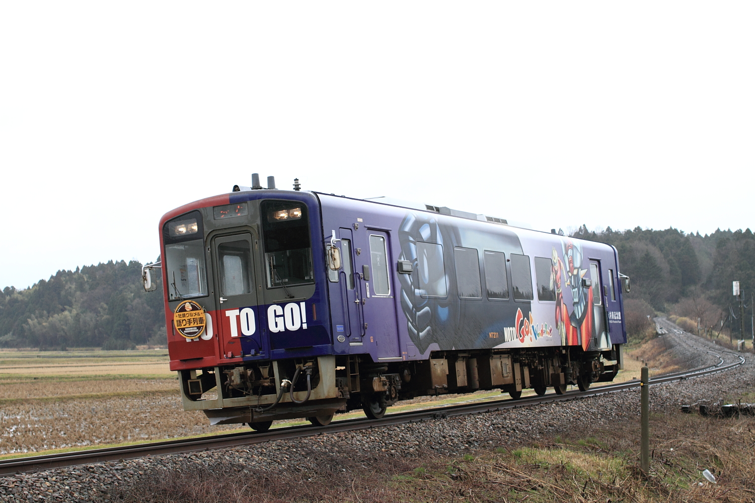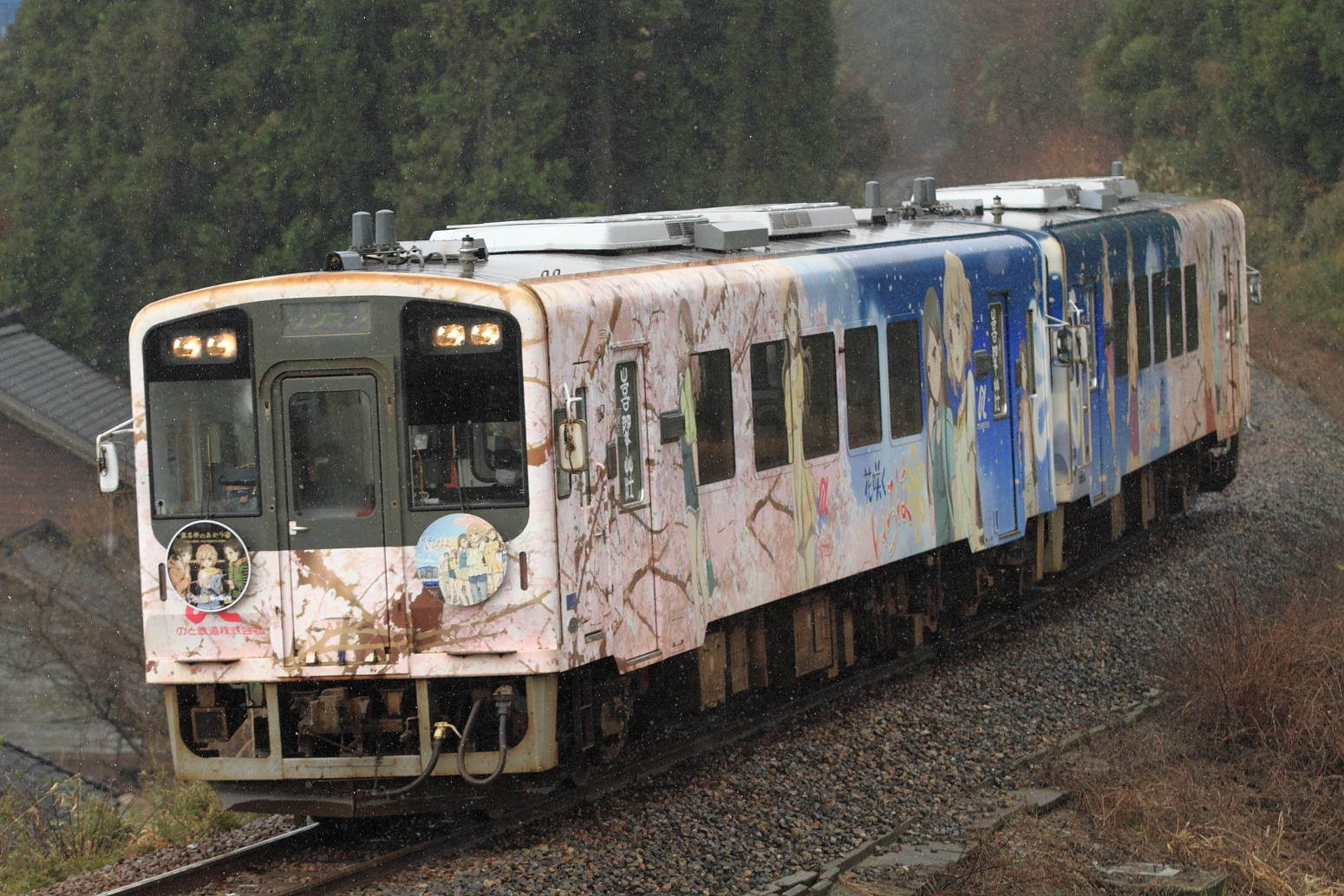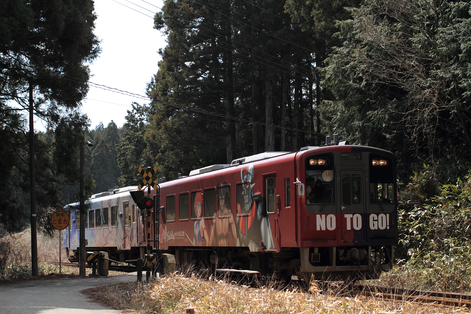 【のと鉄道】花いろラッピング・真名井のあかり列車運転【NT201/NT202】 H26.3.21のと鉄道花咲くいろはラッピング車2連による、「真名井のあかり列車」が運転されました。 136D@西岸~能登中島送り込みは136Dを増結し、ヘッドマークも取り付けての運転でした。 9935D@能登中島~笠師保 9935D@能登鹿島~西岸通常HMと特製HMのダブルヘッドマークでした。久々に、花いろラッピング撮った気がします。 土日に運転されている、カキ臨はマジンガーZ車でした。 [0回]