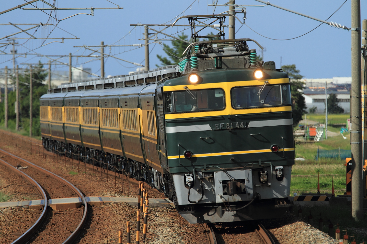 【北陸本線】EF81 44号機牽引のサロンカーなにわ撮影(復路)【サロンカーなにわ】 H29.9.24粟津温泉でまったり過ごし、お昼頃までのんびりして撮影地へ。復路は2年連続で同じ場所だったので、少し変化を。 回9516@明峰〜能美根上EF81 44号機牽引でした。エクステンダーを使用しても若干足りず、少しトリミングを。この時期は毎年天気も良く、復路も1発のみでしたがフル編成の美しい編成を記録することができました。 [1回]