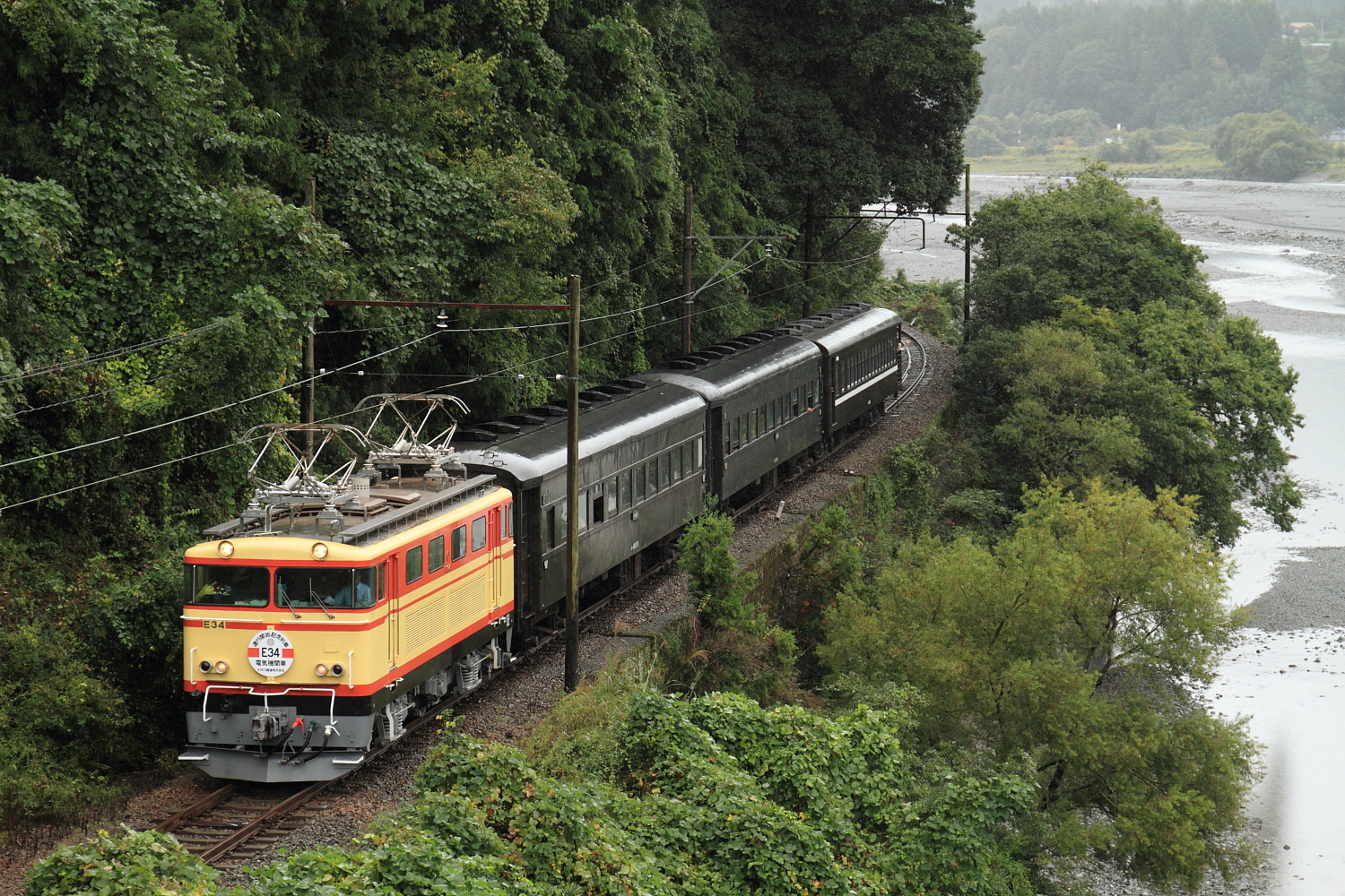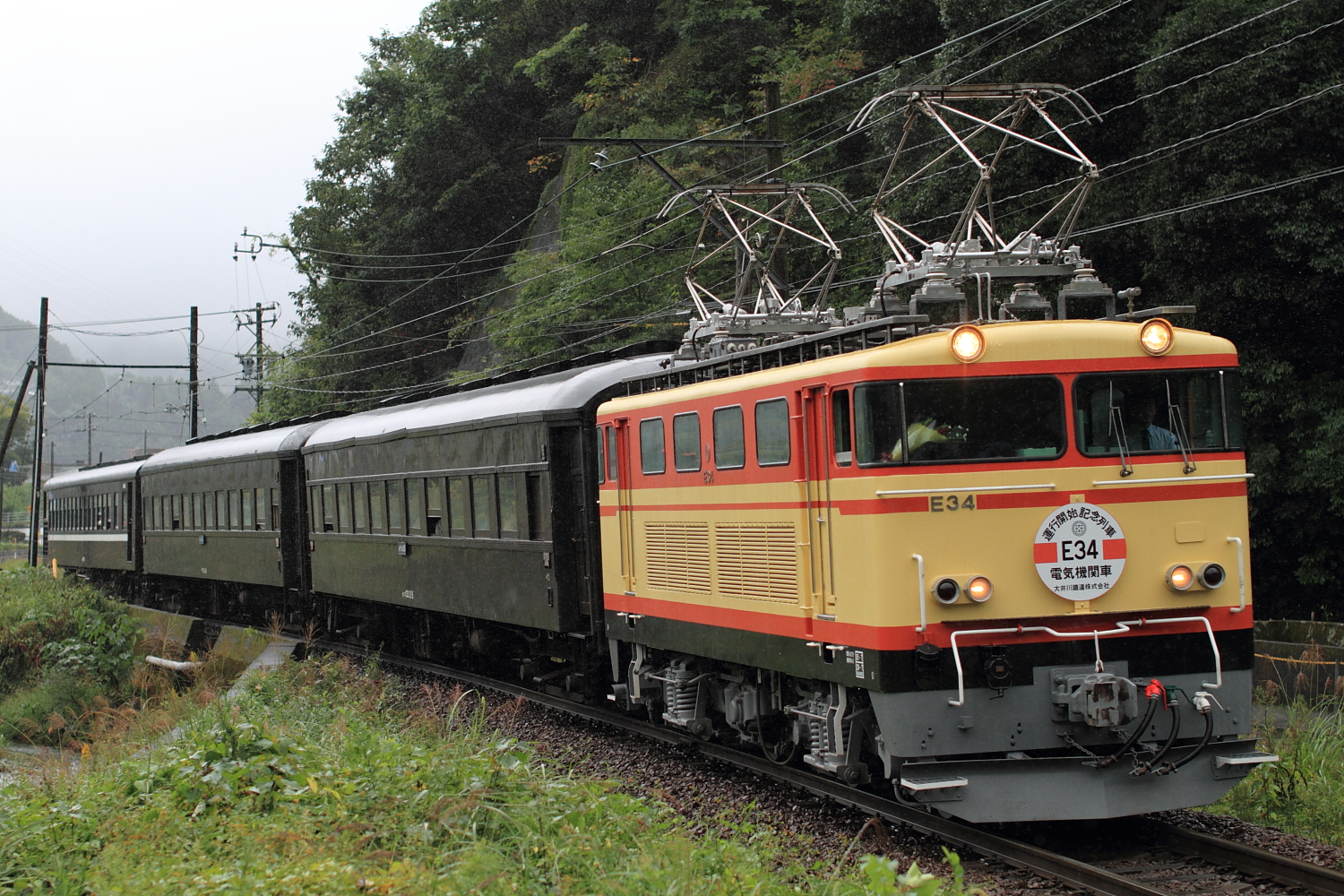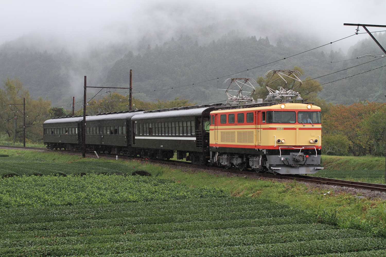 【大井川鐵道】元西武E31形デビュー記念特別列車撮影【E34】 H29.10.157年前の9月に搬入され、ずっと待ち続けてついにこの日が…東海北陸道から、初めての新東名高速へ。途中のサービスエリアを堪能しつつ、高ぶる気持ちを抑えながら新金谷駅へ。駅前に到着すると早速、友人を発見して駅の窓口へ。記念切符を購入し(No.51でした)駅の裏側へ。 14系客車とE32はホキ車と連結されていました。そして今回の目的でもある臨時列車の撮影地探し…。雨の中、セッティングして踏切が鳴るのを待…と思ったら第4種踏切だったので前を注視。すると遠くから聞き慣れた警笛が、、、、、 @福用〜大和田E34+オハフ33 215+オハ35 149+スイテ82 1元西武E31形の最終製造「E34」が旧型客車を牽引し、初めての営業列車としてデビュー。あいにくの雨でしたが、記念ヘッドマークを掲げて通過。そして家山で長時間停車の間に先回り。 @下泉〜田之口今度は大井川を入れて記録。ここでは少し明るくなり、雨も弱まりました。この後は千頭駅での撮影をする前に、井川線を少し見に行くとものすごい勾配を登る重連機関車を発見。 @長島ダムED90形この後、引き上げ線へ入ってしまいました。動きそうになかったので千頭駅へ戻り、入場券を購入し友人と合流してE34を撮影。 @千頭SLが到着する直前であったが、降り続く雨に嫌気がさしていたためE34の往路撮影のため移動開始。大井川鐵道と言えば茶畑であり、有名な抜里カーブへ。 @家山〜抜里雨の茶畑を横目に、E34牽引の客車列車が通過。ヘッドマークはなく、ステーがむき出しでした。復路は時刻もよくわからず、1発のみだったので後続のSLを…と思ったが降り続く雨が。。と言うことで新金谷駅へ戻り入換作業を見つつ、撮影終了。せっかく大井川鐵道へ来たのに、SLを撮らないとか。。。合流した友人らと静岡県「さわやか」でげんこつハンバーグをいただき、寄り道する元気も無くなりのんびり休憩しつつ復路と同じ経由で帰宅。今後のE31形の活躍に期待!大井川鐵道へ通うことを決心する日となりました。 [1回]