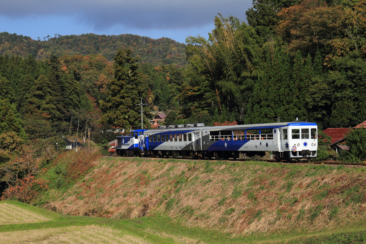 【木次線】奥出雲おろち号撮影2【DE15】 H29.11.3松江へ行く事になり、秋の山陰を満喫。紅葉が綺麗で良いお天気の連休ということもあり、どこも賑わっていました。この日はレンタカーを借りて、木次線へ。 8421レ@下久野〜出雲八代DE15 1558号機牽引でした。線路沿いに走り、撮影地を探し駅近くのこの場所で。晴れたり曇ったりでしたが何とか晴れの時間で通過。走って出雲八代駅停車中も撮影。 @出雲八代撮影後、亀嵩駅が最寄駅という知り合いの実家へ行ったり、紅葉真っ盛りな奥出雲おろちループを巡り、再び亀嵩駅へ。どこも出雲そばのお店が混んでいて、たどり着いたのが亀嵩駅。しかしここも長蛇の列で、待っている間に復路の「奥出雲おろち号」が接近!撮影地を探す間も無く、何とか撮影、、 8422レ@亀嵩〜出雲横田このあたりはまだ紅葉には早かったようでした。戻って出雲そばを堪能し、普通列車があるので撮影。 リニューアルされたばかりのキハ120 8でした。その後は宍道湖のカフェなど、松江を満喫。せっかく持ってきた三脚を活用しようとサンライズ出雲を松江駅で撮影しようと思ったら時間の勘違いで撮れず、、、翌日は一畑電車を乗り鉄して、やくも・のぞみ・サンダーバードで帰宅しました。のんびり乗り鉄+レンタカーもたまには良いですね。 [3回]PR