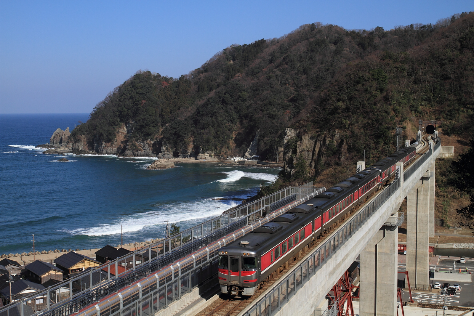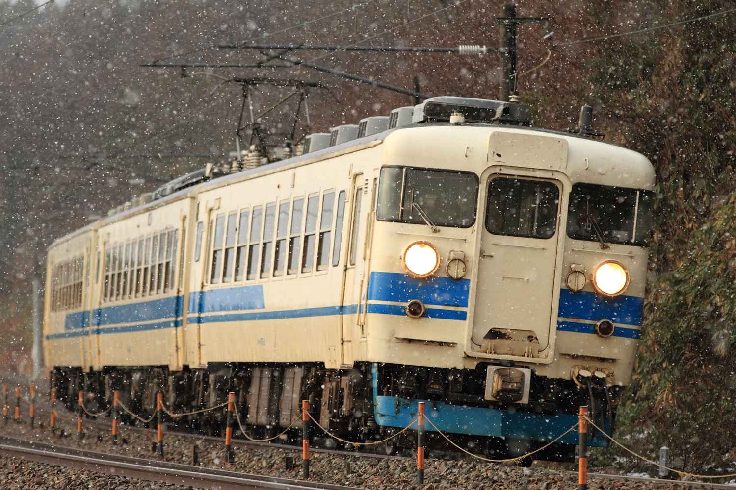 【七尾線】快速能登の里山里海号運転 in2014【415系】 H26.1.25おなじみ、七尾線の快速「能登の里山里海」号が金沢~七尾間で運転されました。 9885M車両は昨年同様、415系C10ヘセの国宝等伯ラッピング車で、ヘッドマークも普段のものを「能登の里山里海」号に取り換えて運転されました。七尾~穴水間はのと鉄道リレー号として快速が設定され運転されました。なお、今春には直通パターンでの運転を予定しています。ちょっと雰囲気の良いところを見つけたので、1枚 415系C04ヘセ [0回]
