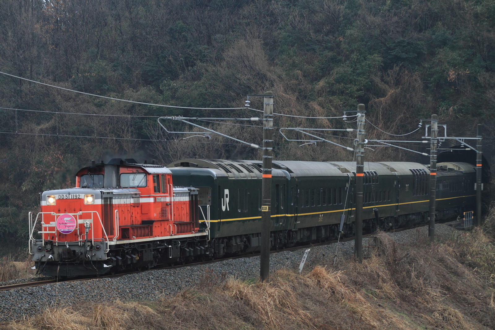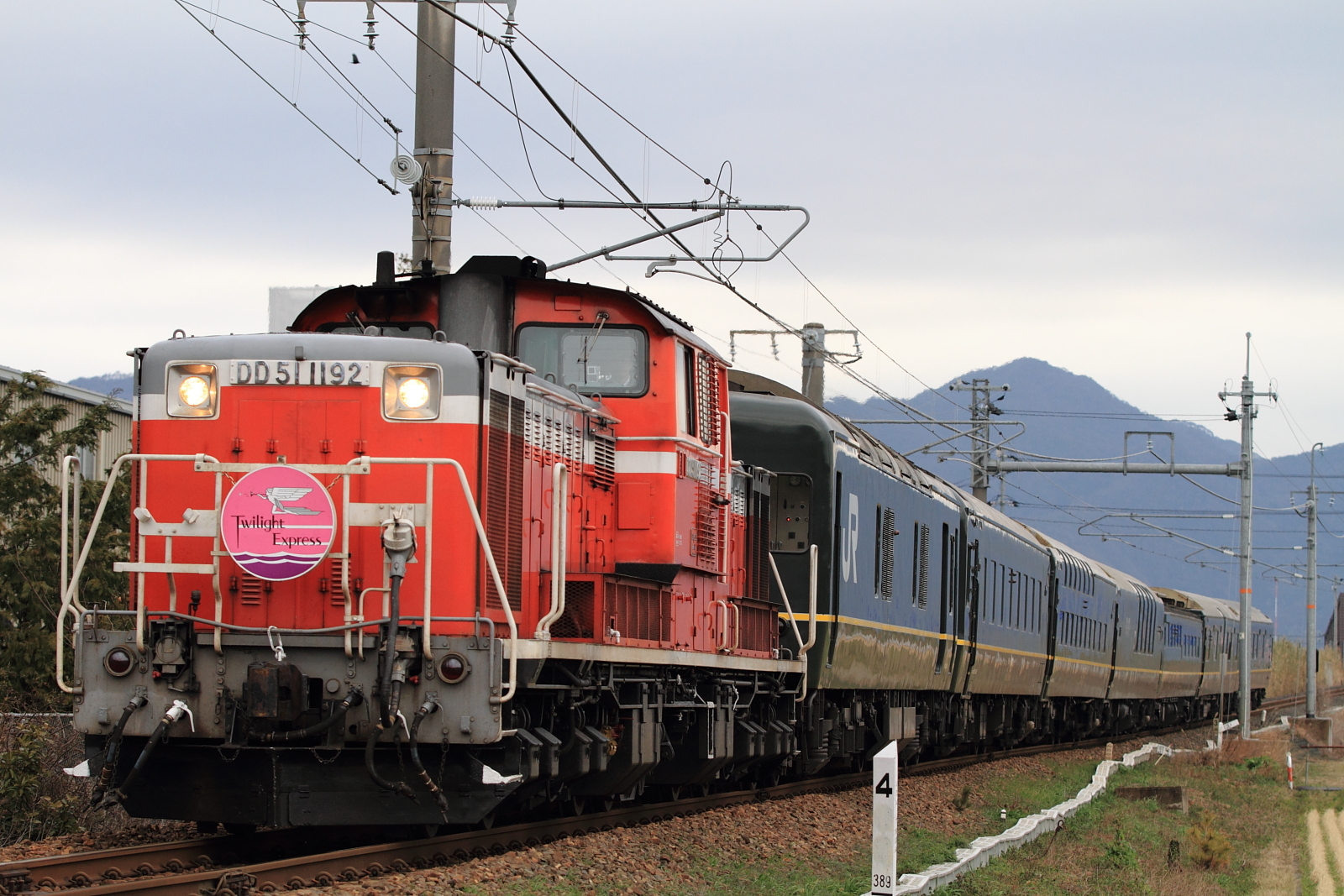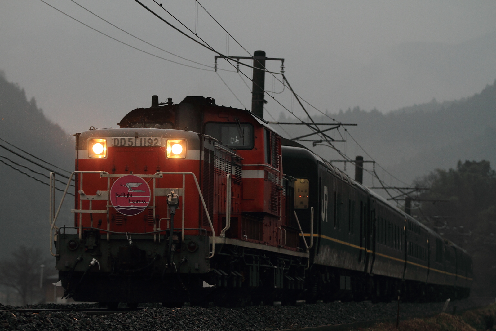 【伯備・山陽本線】DD51 1192牽引の団体列車撮影・EF64貨物【トワイライトエクスプレス】 H26.1.30山陰遠征2日目は、早朝の伯備線黒坂~根雨から。 DD51 1192+24系(トワイライトエクスプレス)7B昨日と違い、あいにくの天気での撮影です。 途中、停車が長いので何度も撮影できました。伯備線から山陰本線へ。 築堤を走ります。 トンネル飛び出しも。 少し晴れてきたところで、松江からはサンライズ出雲号が先行し、 追っかけでトワイライトが。 最後に出雲市からの回送を撮影し、トワイライトの撮影は終了。伯備線EF64を撮りに伯備線へと戻ります。 原色のEF64+コキでした。 カーブをゆっくりと曲がり、勾配を上ります。 途中、381系特急やくも号が先行します。 信号所でやくもに抜かれ、勾配を砂をまきながら上ります。 濃霧の中のロクヨンを撮って、遠征は終了です。やはり、DD51、EF64は最高です。 [1回]