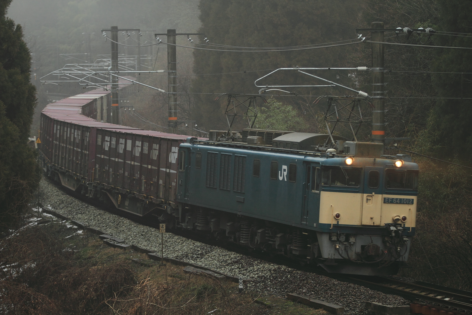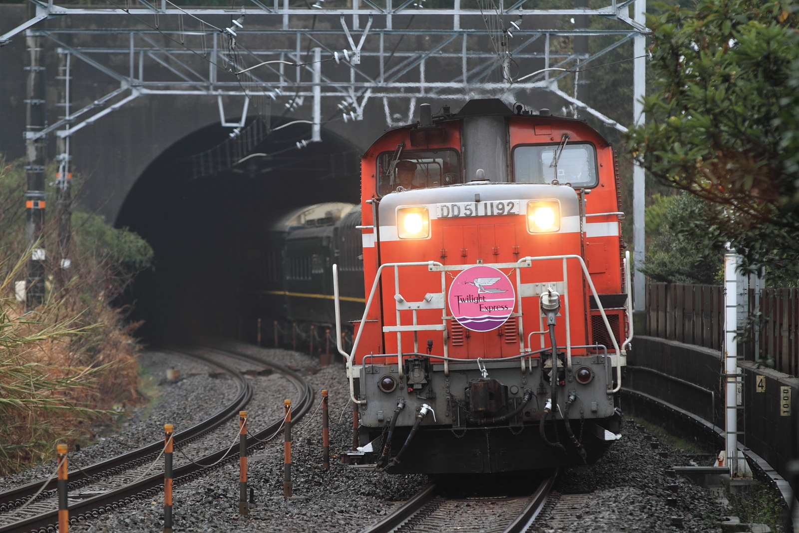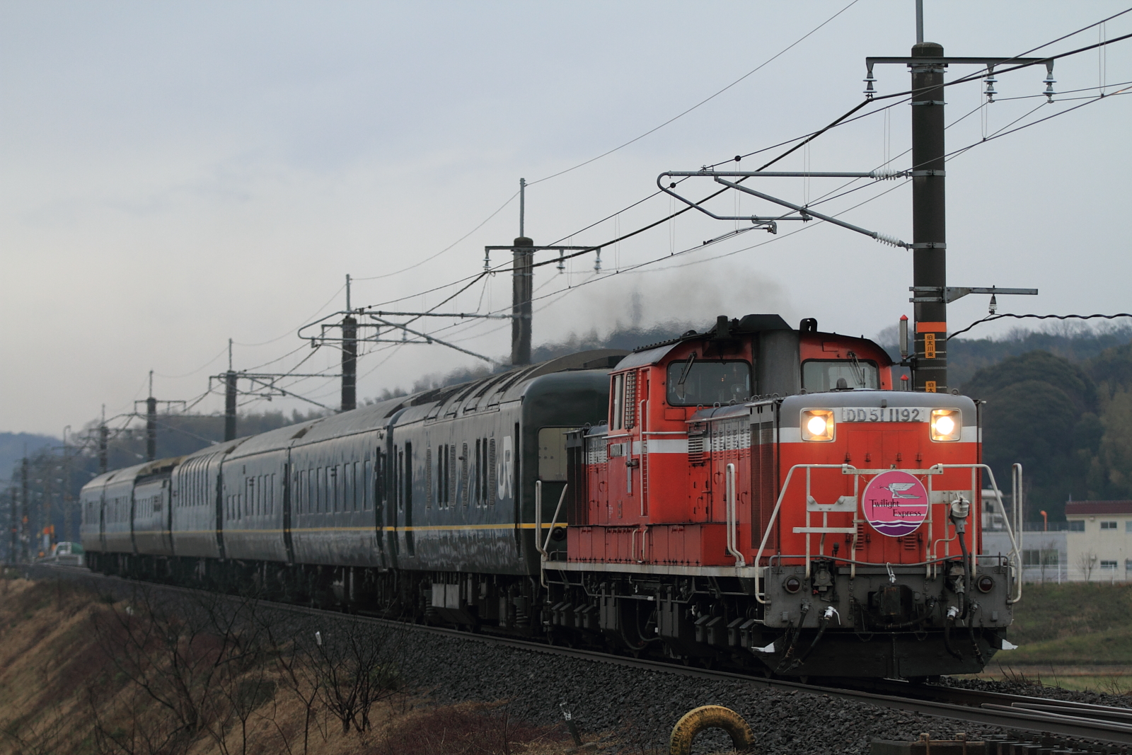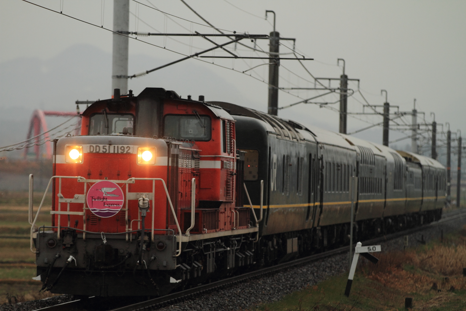 【伯備・山陽本線】DD51 1192牽引の団体列車撮影・EF64貨物【トワイライトエクスプレス】 H26.1.30山陰遠征2日目は、早朝の伯備線黒坂~根雨から。 DD51 1192+24系(トワイライトエクスプレス)7B昨日と違い、あいにくの天気での撮影です。 途中、停車が長いので何度も撮影できました。伯備線から山陰本線へ。 築堤を走ります。 トンネル飛び出しも。 少し晴れてきたところで、松江からはサンライズ出雲号が先行し、 追っかけでトワイライトが。 最後に出雲市からの回送を撮影し、トワイライトの撮影は終了。伯備線EF64を撮りに伯備線へと戻ります。 原色のEF64+コキでした。 カーブをゆっくりと曲がり、勾配を上ります。 途中、381系特急やくも号が先行します。 信号所でやくもに抜かれ、勾配を砂をまきながら上ります。 濃霧の中のロクヨンを撮って、遠征は終了です。やはり、DD51、EF64は最高です。 [1回]
