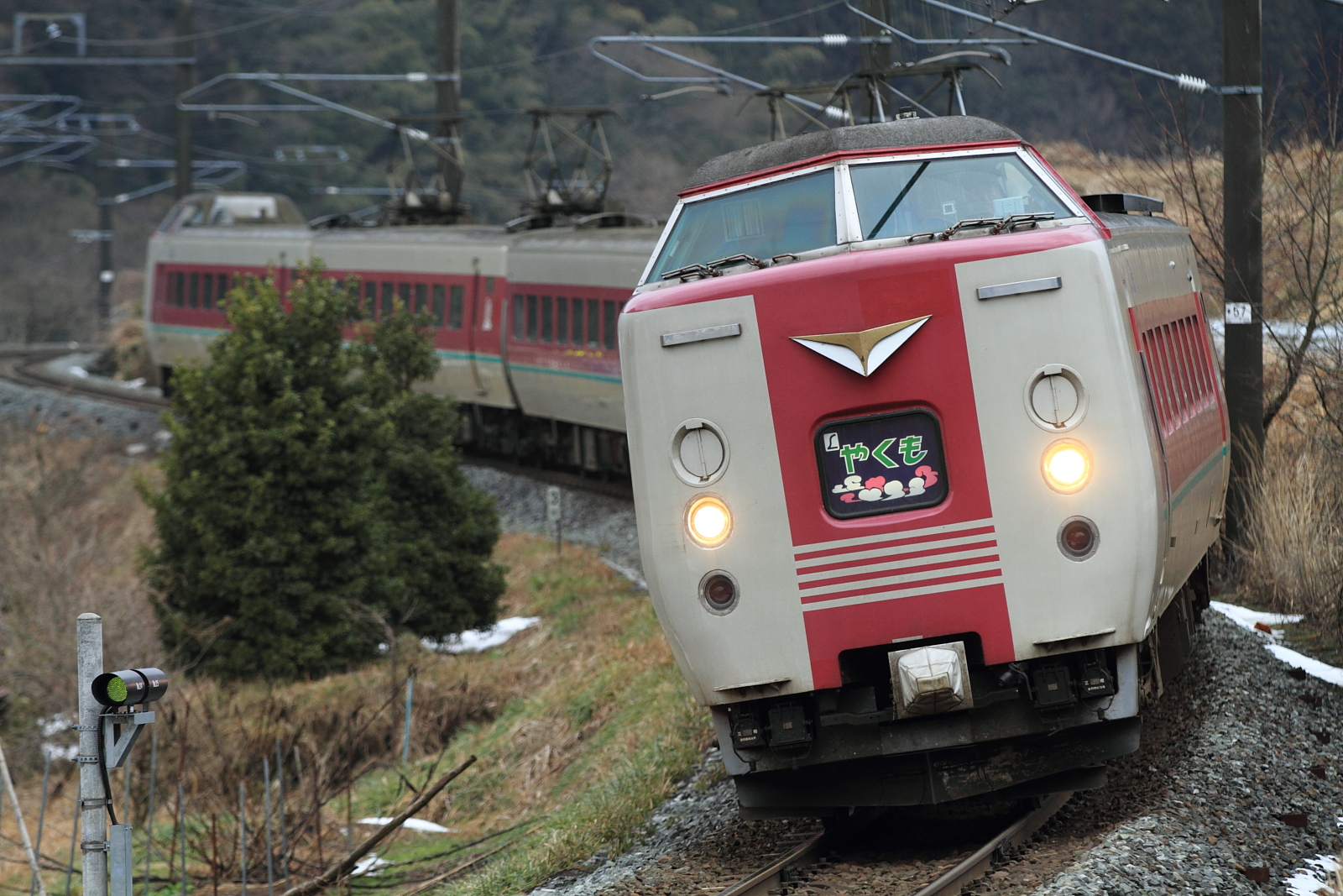 【山陰本線】山陰本線撮影【キハ189】 H26.1.29トワイライトを撮りに行く途中、山陰本線で撮影しました。京都から381系はしだて号に乗車。 福知山地区の381系国鉄色も走行が撮りたいものです。そしてレンタカーに乗り移動。 1D(特急はまかぜ1号)初めてこの鉄橋で撮影しました。昔の鉄橋で、キハ181を撮りたかった…。 続いてEF64 1010+コキ綺麗な大山をバックに撮影し、引いてもう1枚。…見事に架線柱が。。。今回の遠征は電車とレンタカーで、三脚が使い物にならない小さいものしかなく手持ちを基本としました。 続いてコナンキハ。 381系やくも号は4連でした。夕方から境港方面へ行き、有名な「べた踏み坂」へ。 撮影していたらいつの間にか夜にf^^撮影後、温泉を調べて行くも休館日…で線路沿いを走っていると隣にEF64が! @江尾行き違いのやくも号の証明を利用して撮影し、1日目終了です。 [0回]