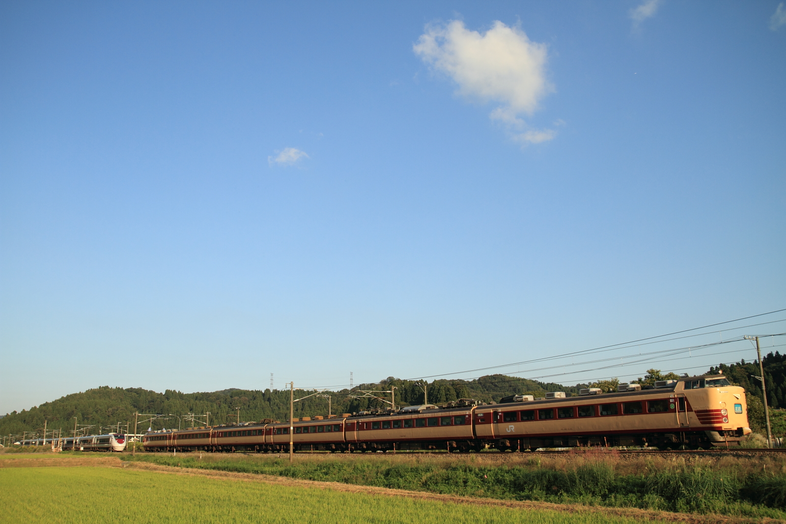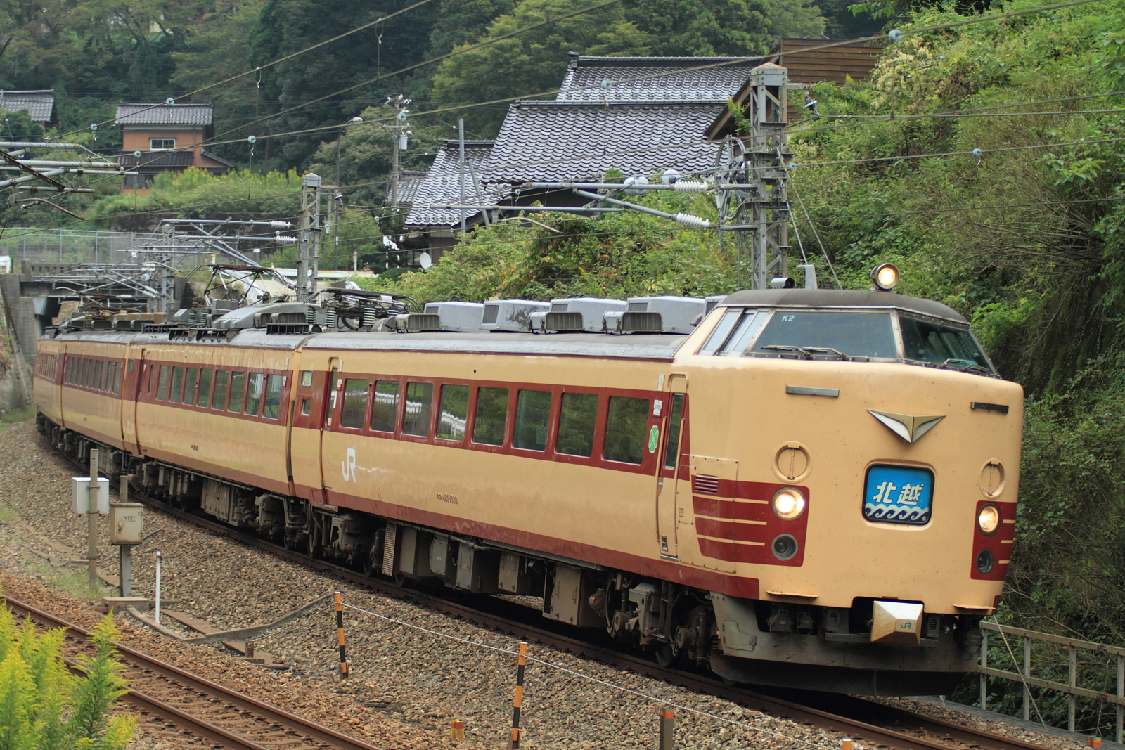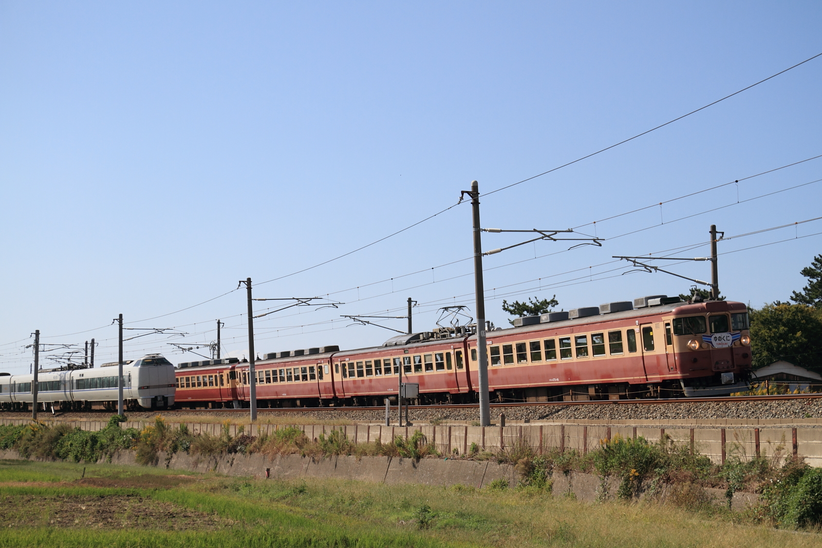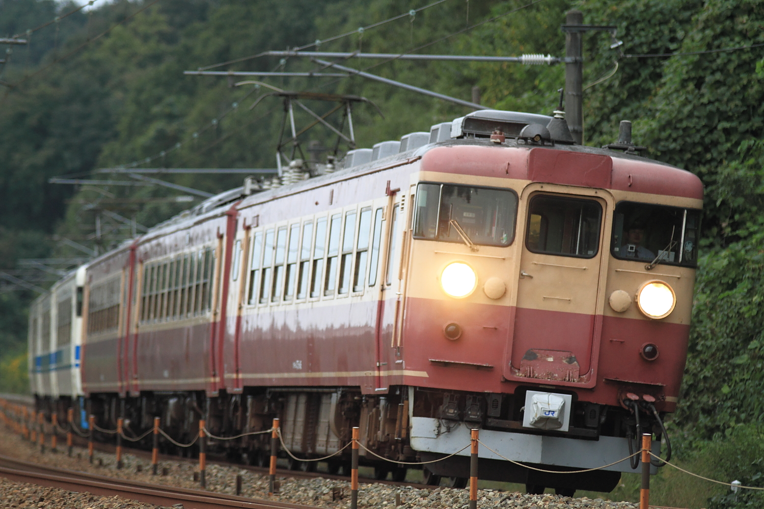 【北陸本線】国鉄色撮影その2【475系・485系】 H25.10.2連日の国鉄色撮影。 475系A13ヘセを。ホロが付いている方がお気に入りです。やはりデカ目+ホロが良いですね。続いて485系K1ヘセ。 イマイチな天気が残念です、、 コチラは485系K2ヘセ短時間に国鉄色がたくさん記録できました。天気の良い日には毎日にでも撮りたいですね。 [0回]