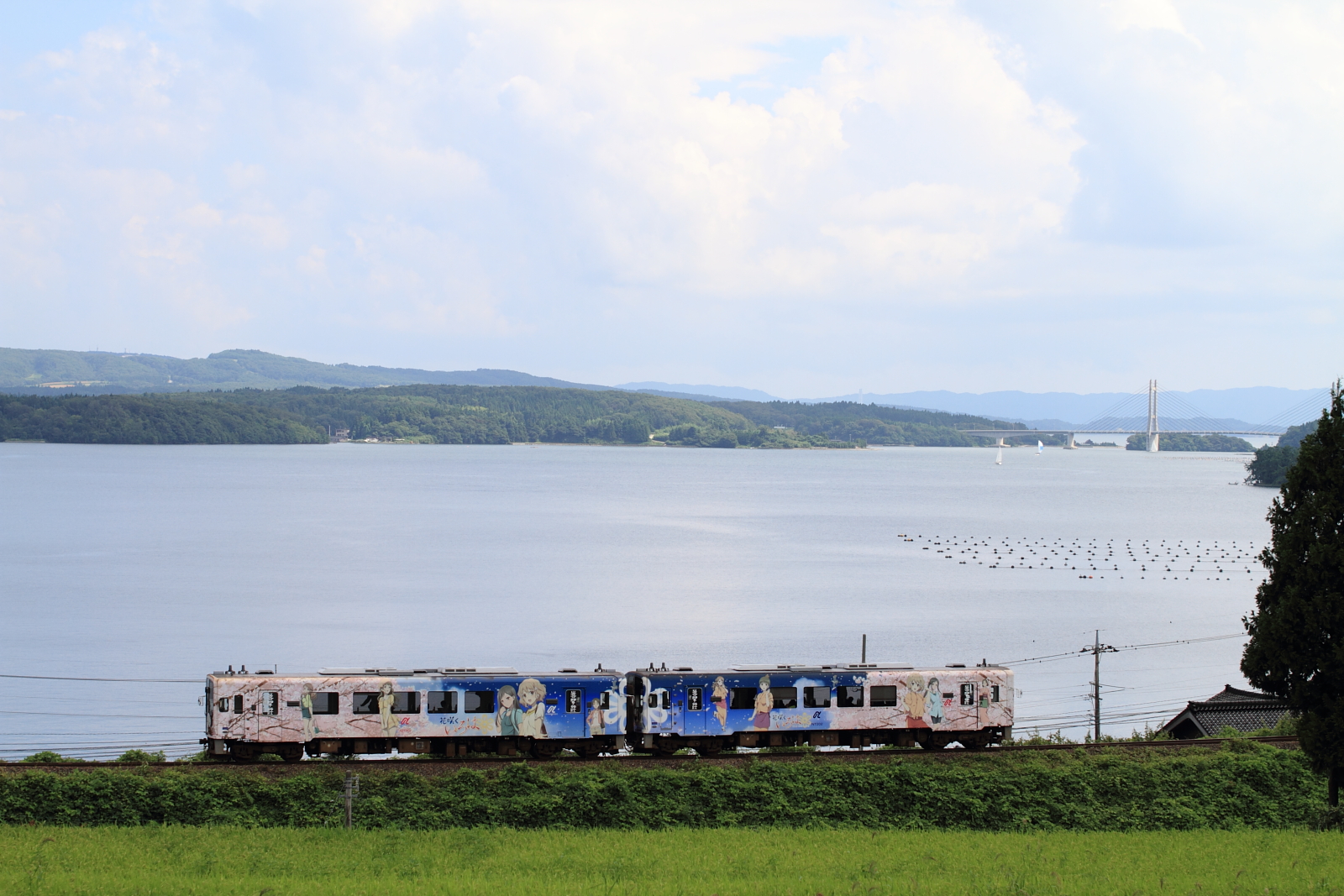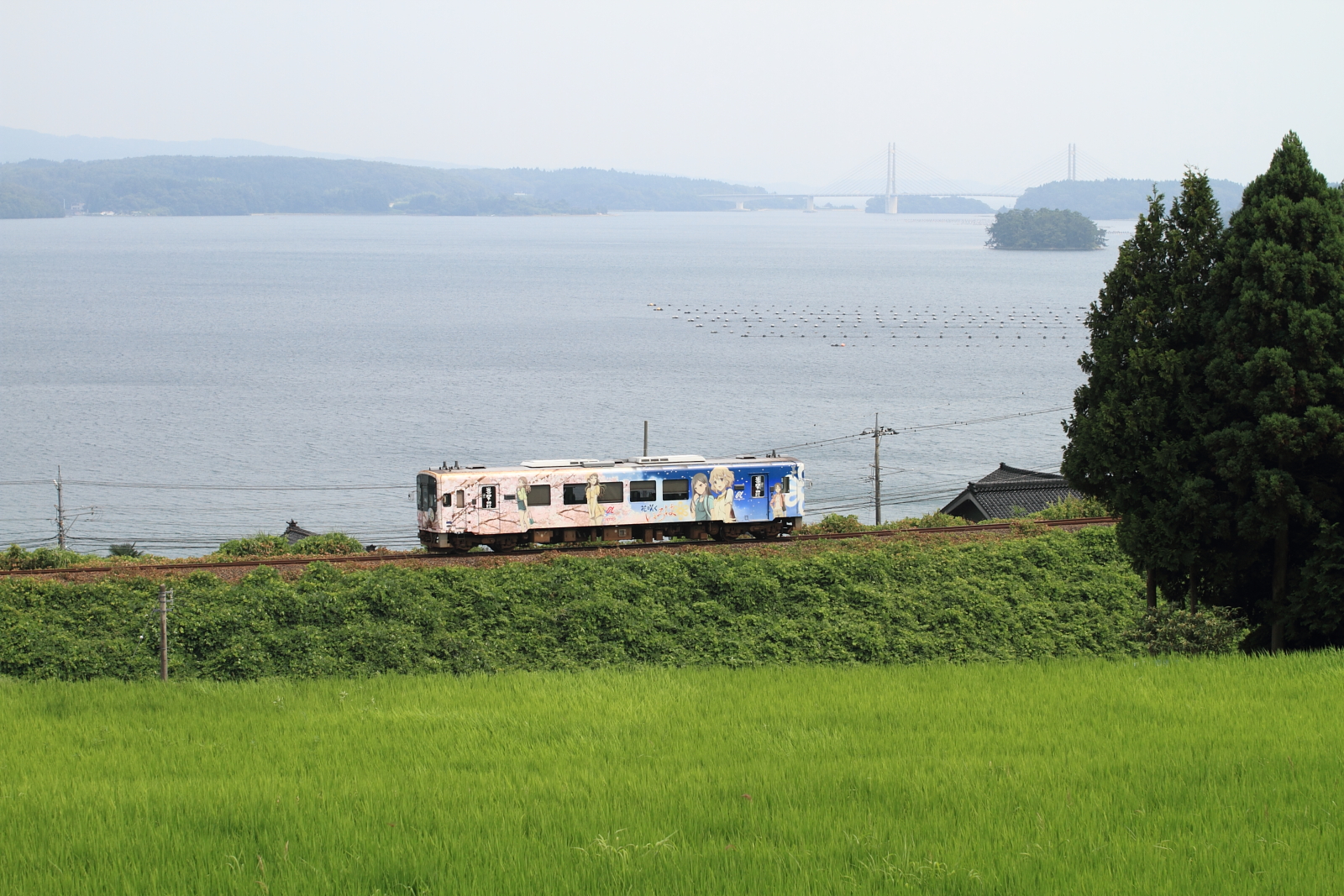 【のと鉄道】花咲くいろはラッピング列車18【NT201】 H25.8.25おなじみ、のと鉄道花咲くいろはラッピング車です。 通過前、少し天気が霞んでしまいましたが、この場所でのダブルラッピングの記録は初めてかと。 [0回]