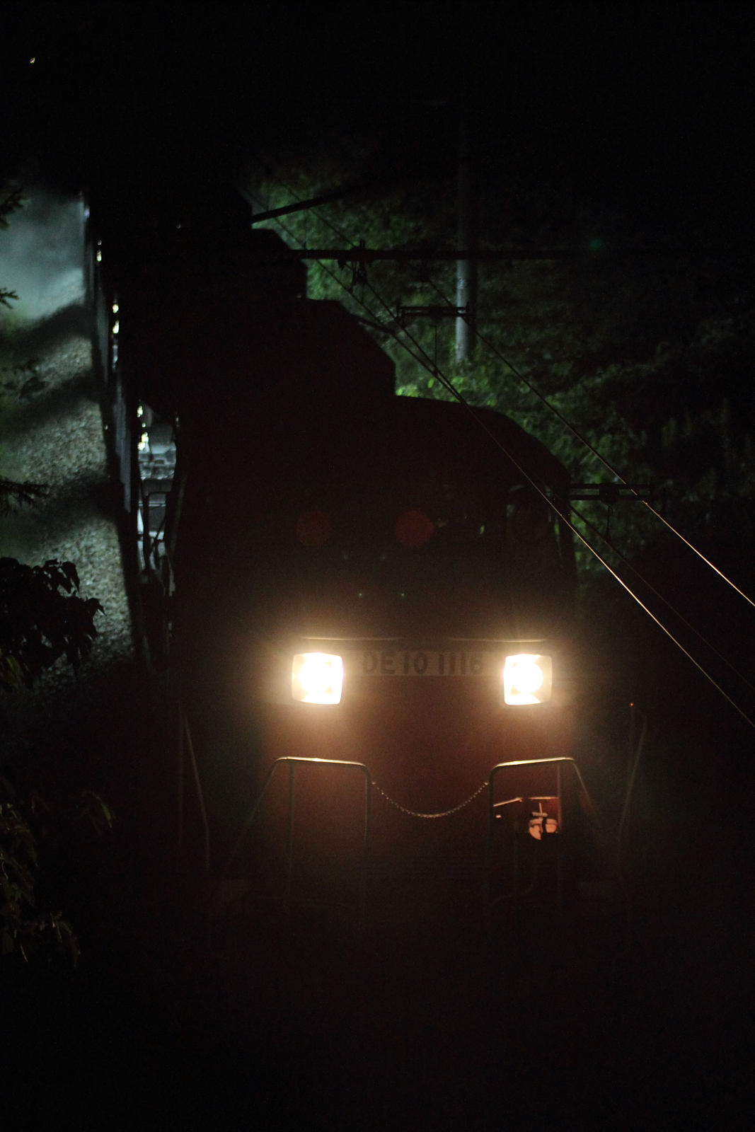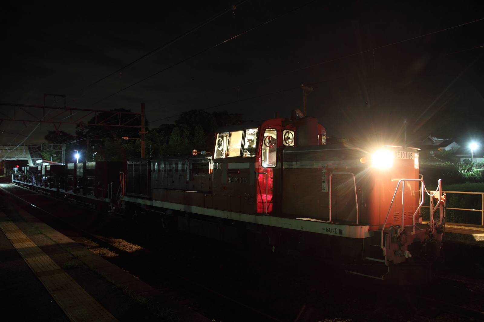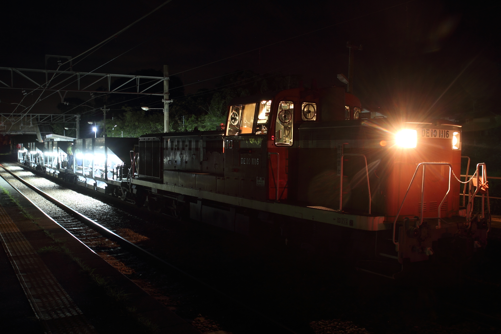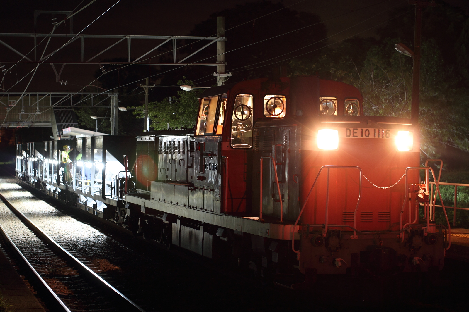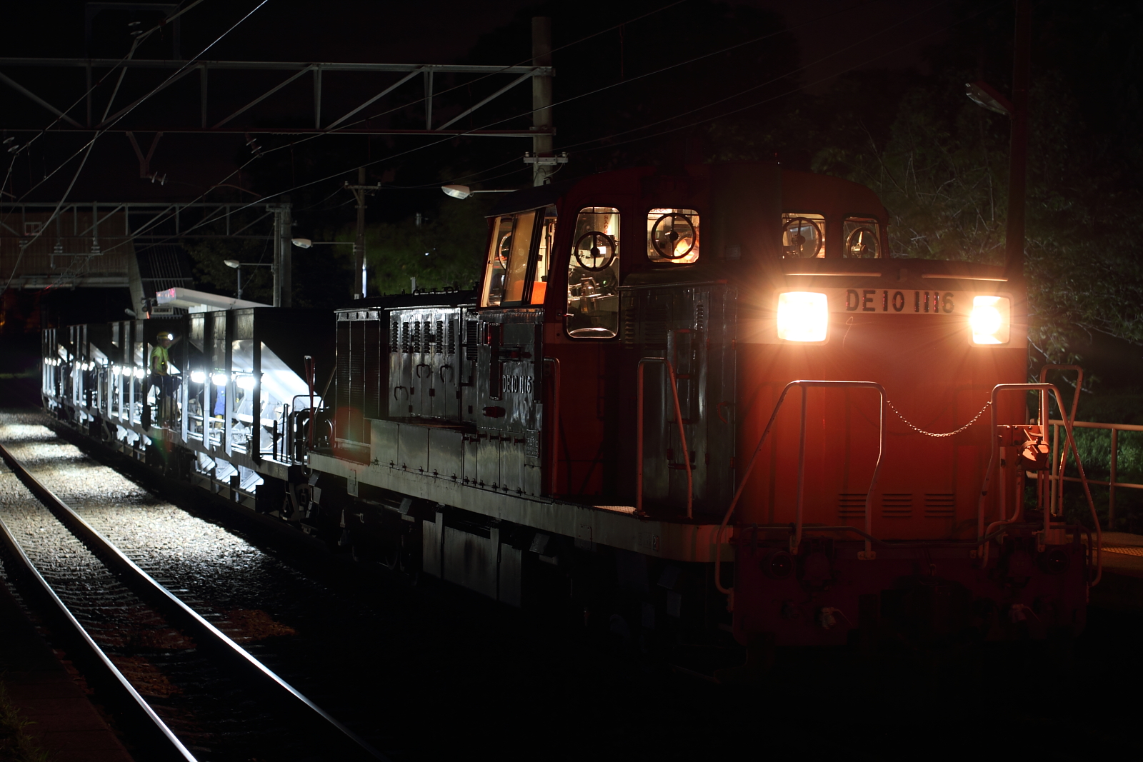 【七尾線】工9957バラスト散布運転【DE10ホキ4】 H25.8.29七尾線で深夜にバラスト散布のため、ホキ4両が運転されました。 工9957@敷浪牽引はDE10 1116でした。今回取り降ろしは敷浪~千路間で手前の敷浪で準備。到着後、ホキ最後部に発電機を積んで、ホキに電気を通し点灯。 4両全てに蛍光灯を点灯、出発準備ヨシ。ゆっくりと発車し現場でゆっくりとバラストを散布しながら運転。 工9957@敷浪~南羽咋南羽咋駅で係員を降車させ、羽咋方面へ。七尾で機回しして返却は東金沢へと運転されました。現場の苦労が少し理解でき、良い勉強となりました。 [0回]