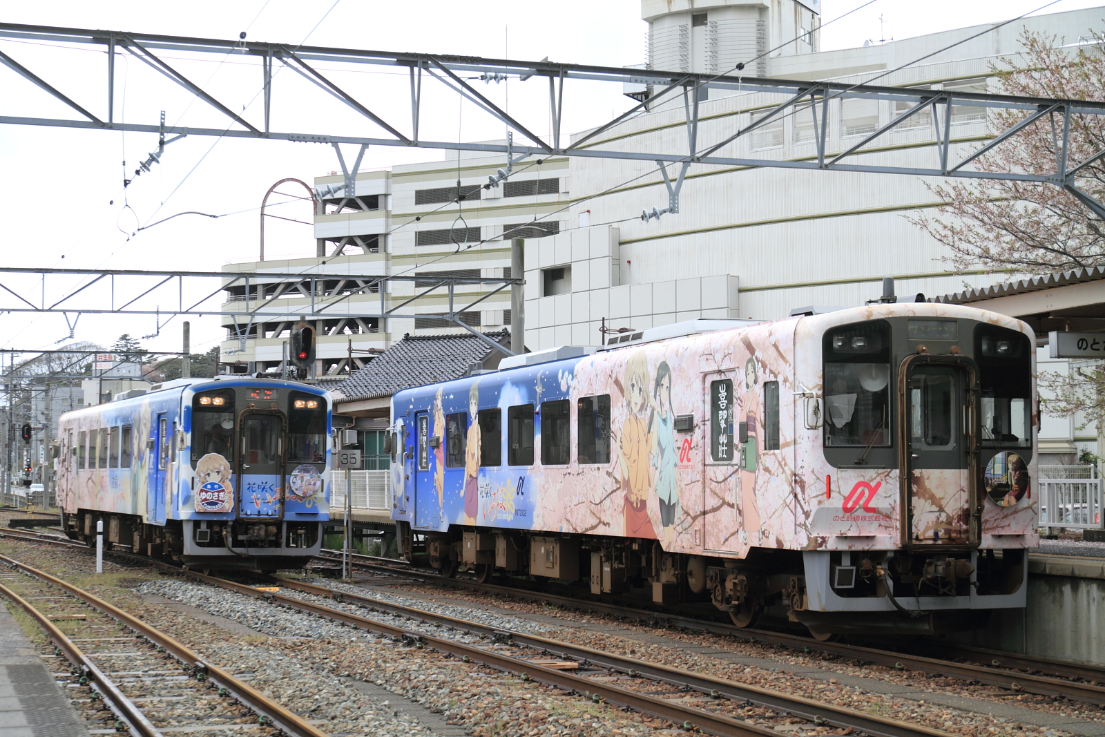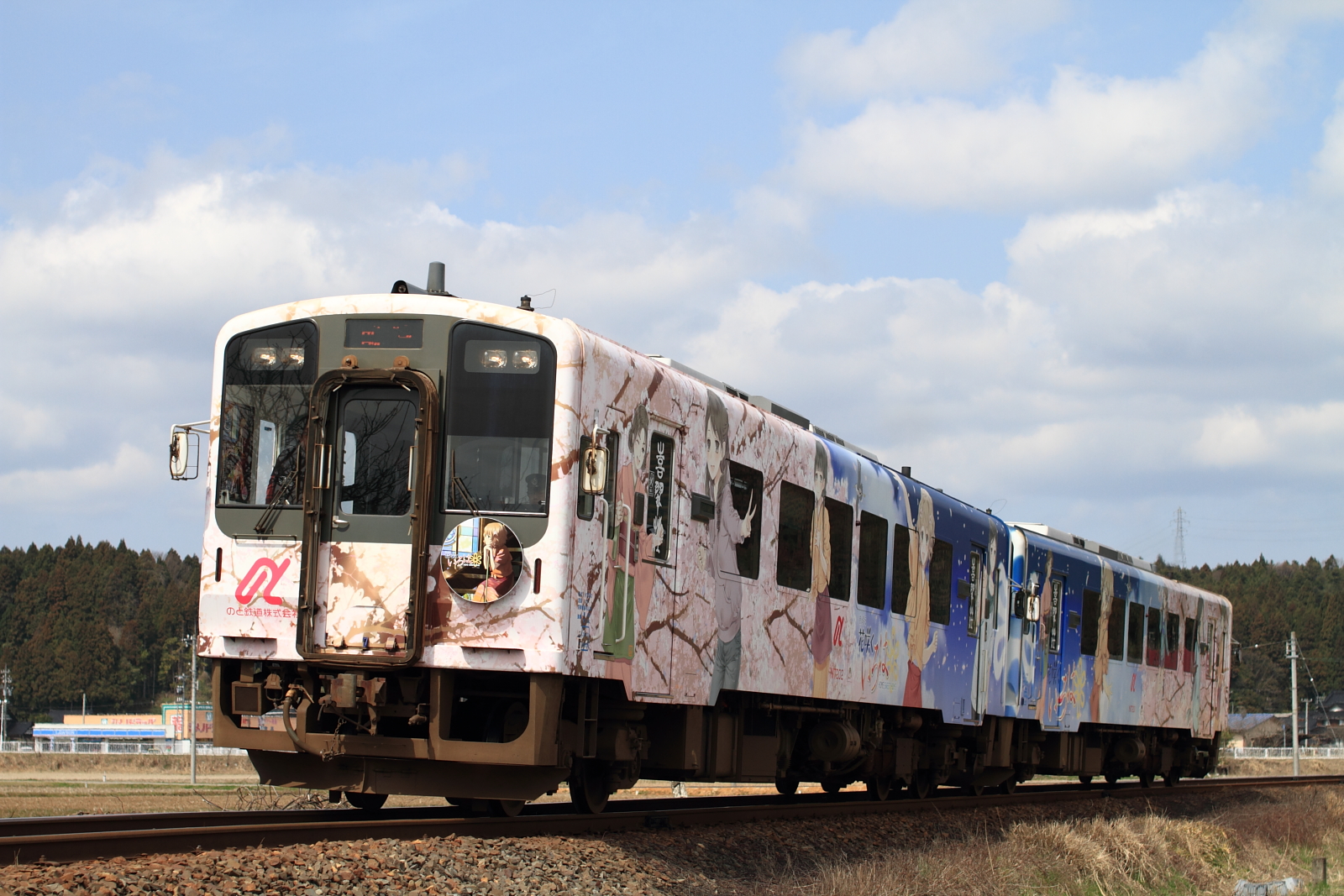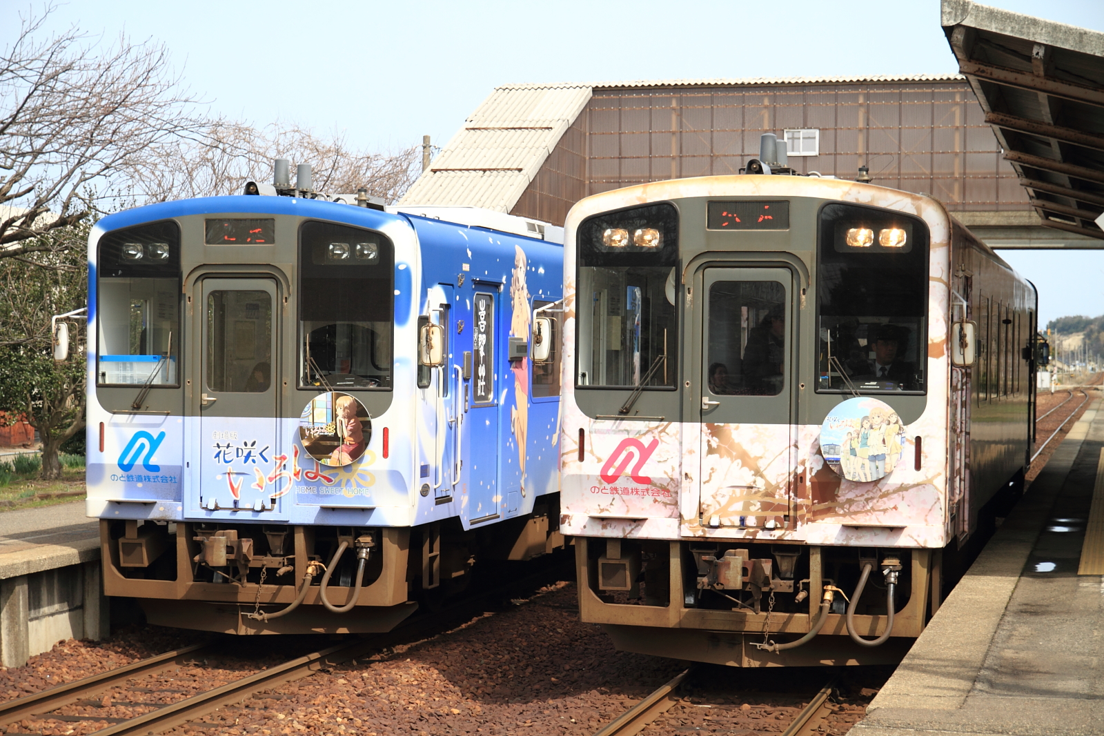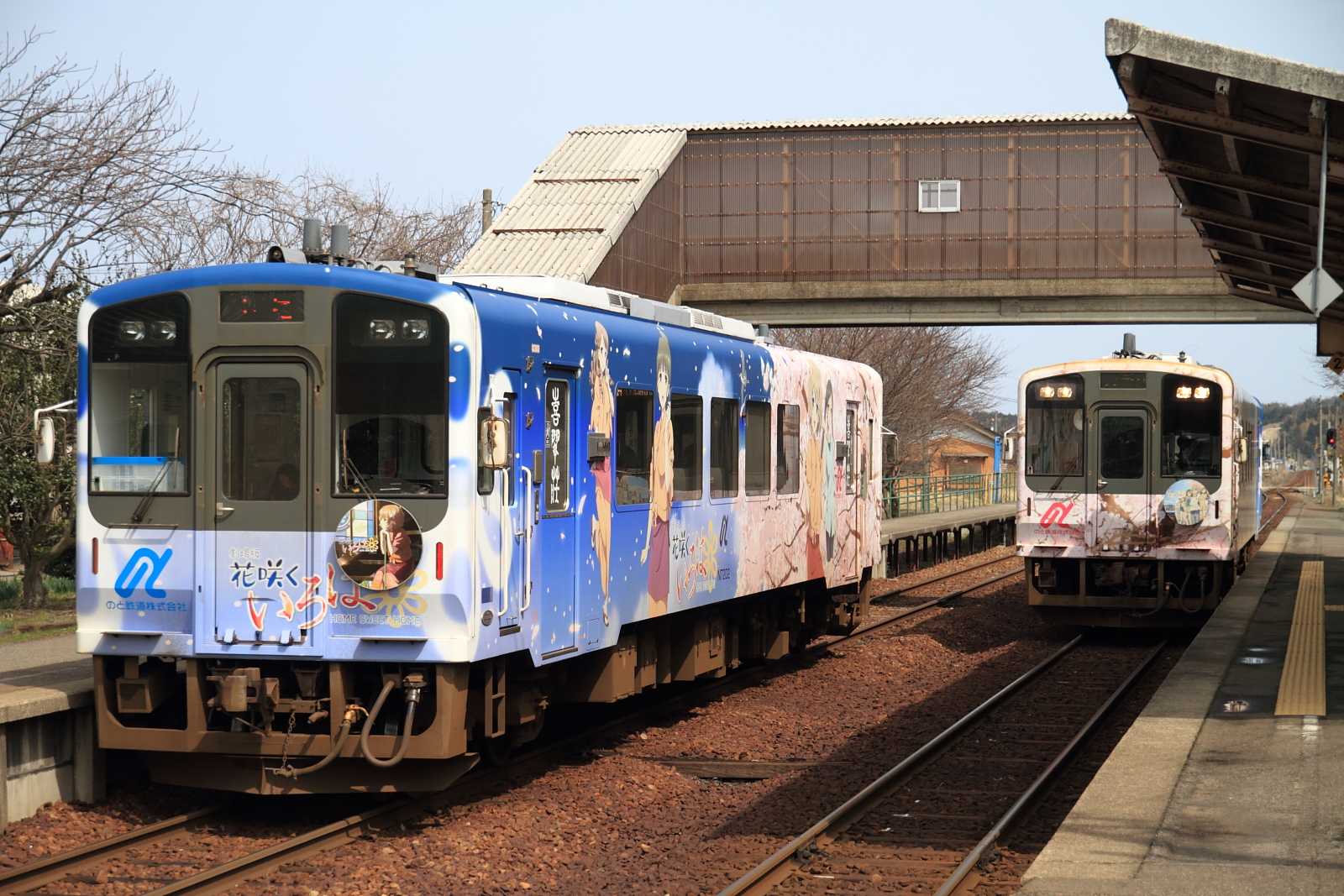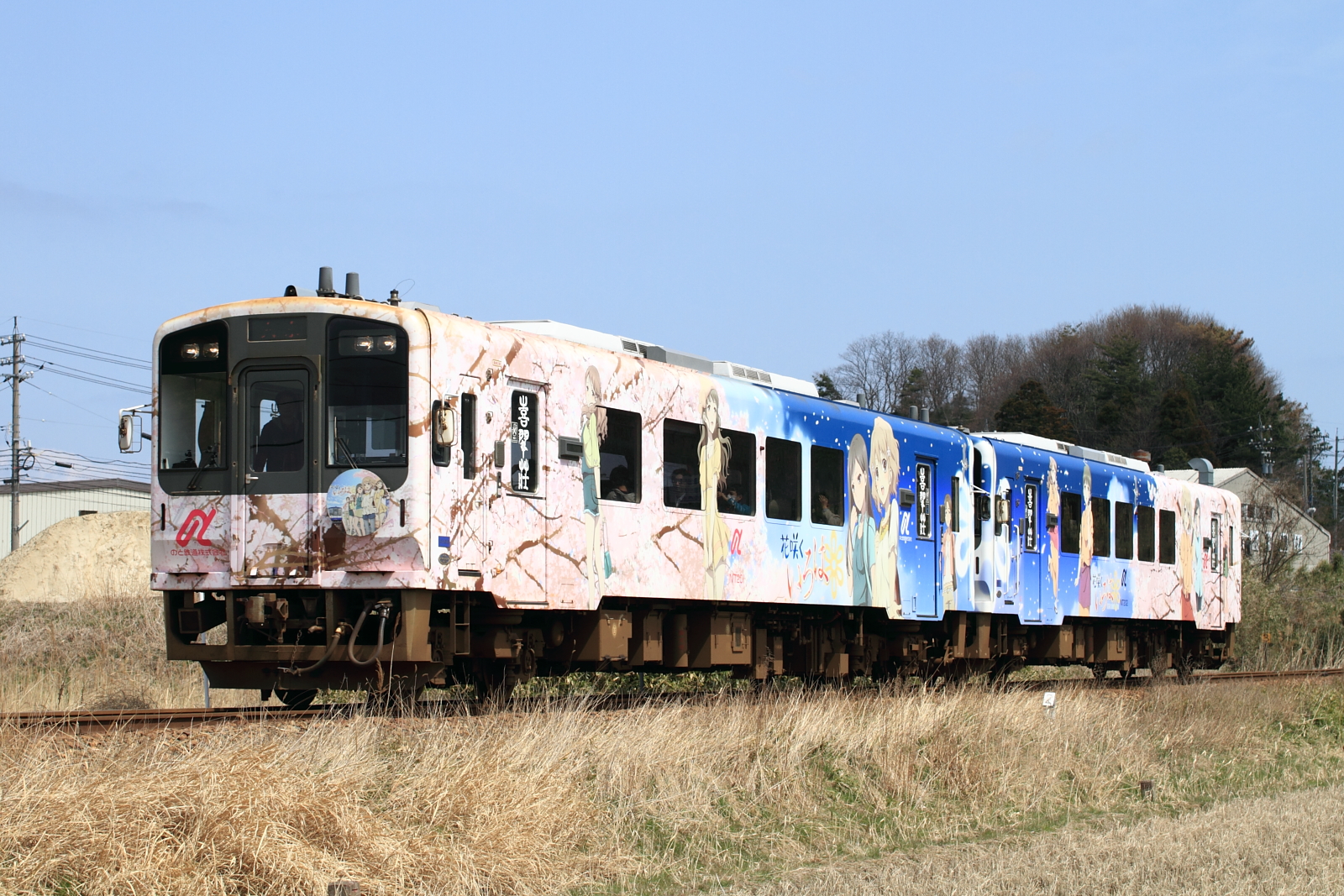 【のと鉄道】花咲くいろはラッピング列車13(初の2両併結)【NT201・NT202】 H25.3.30のと鉄道の花咲くいろはラッピング列車が初の2両運転として、臨時列車が運転されました。30日からヘッドマークや車内放送も一新し(第3弾)運転されています。桜もそろそろでしょうか。 [0回]