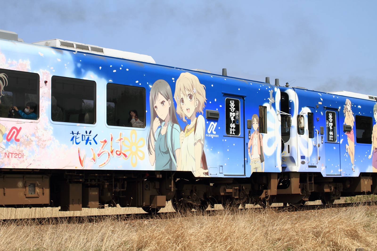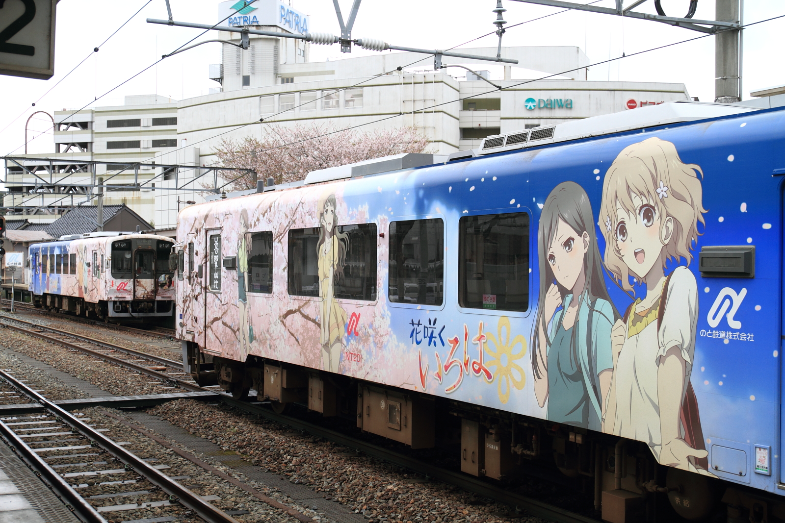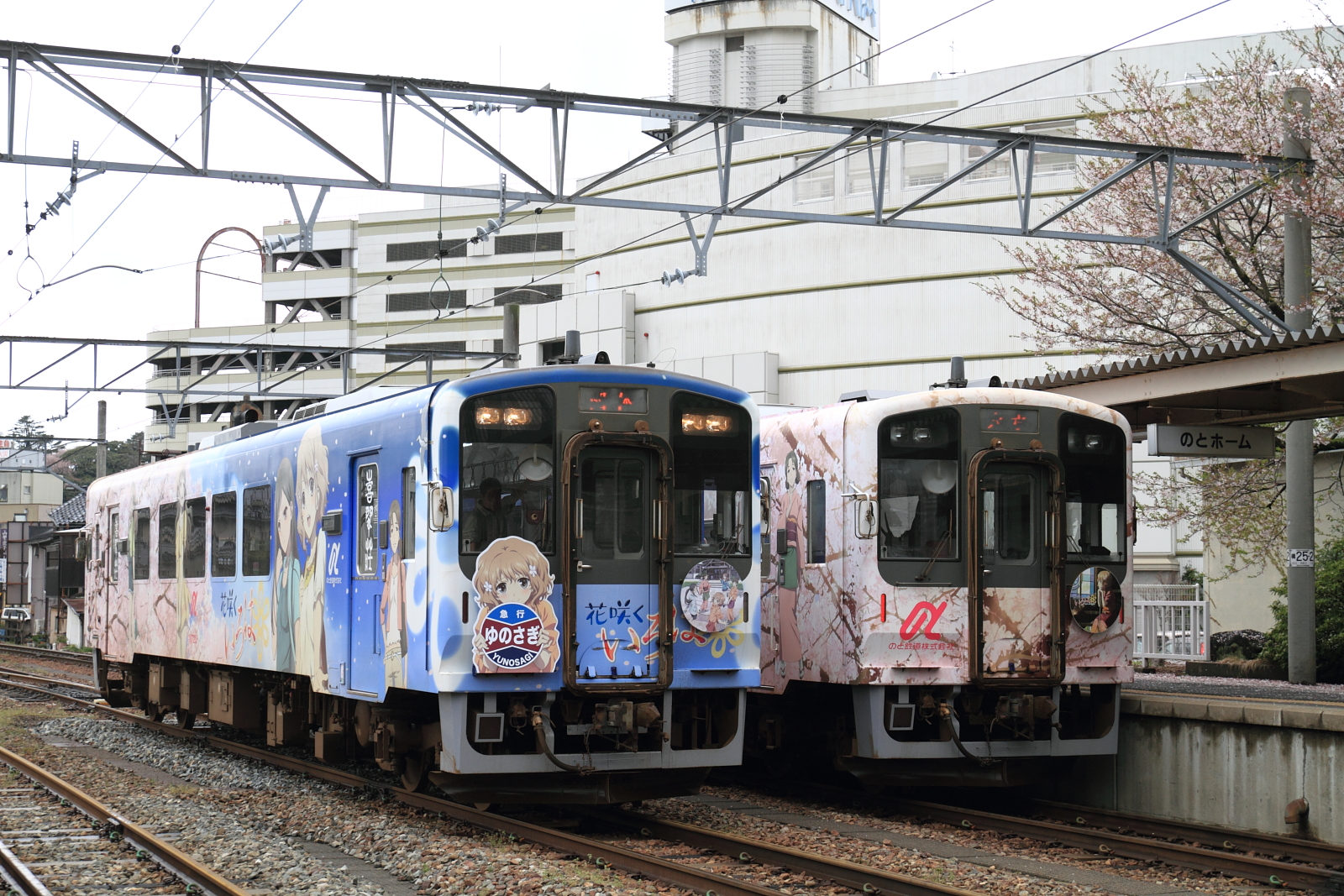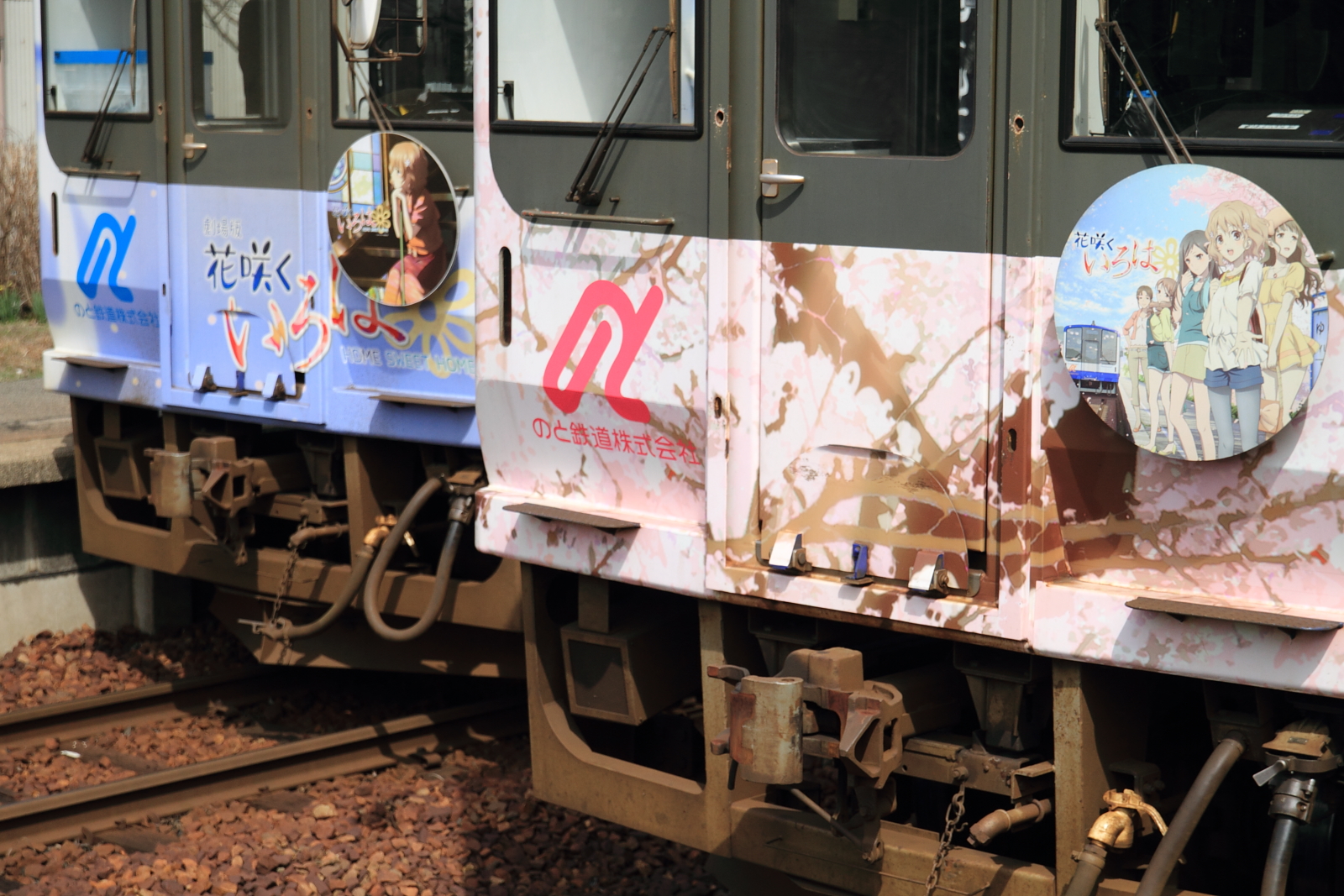 【のと鉄道】花咲くいろはラッピング列車13(初の2両併結)【NT201・NT202】 H25.3.30のと鉄道の花咲くいろはラッピング列車が初の2両運転として、臨時列車が運転されました。30日からヘッドマークや車内放送も一新し(第3弾)運転されています。桜もそろそろでしょうか。 [0回]