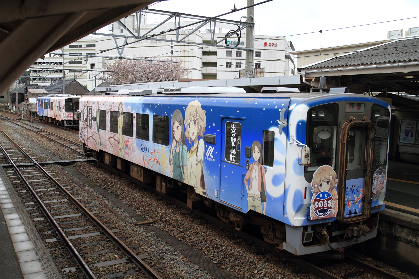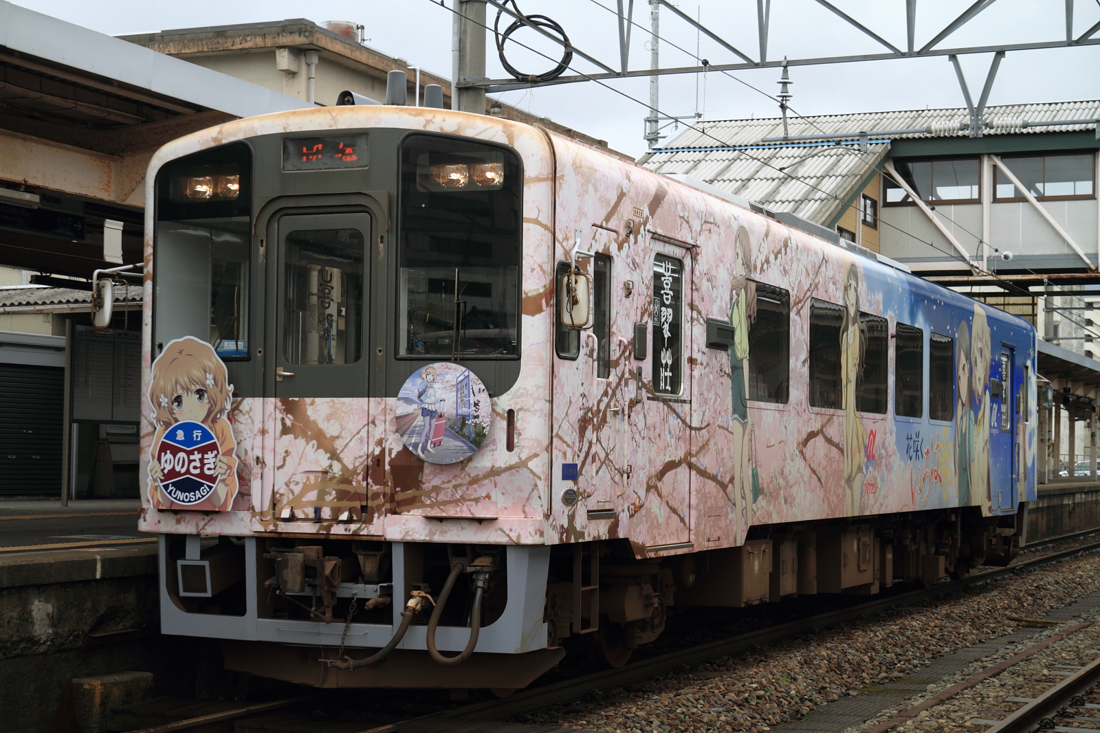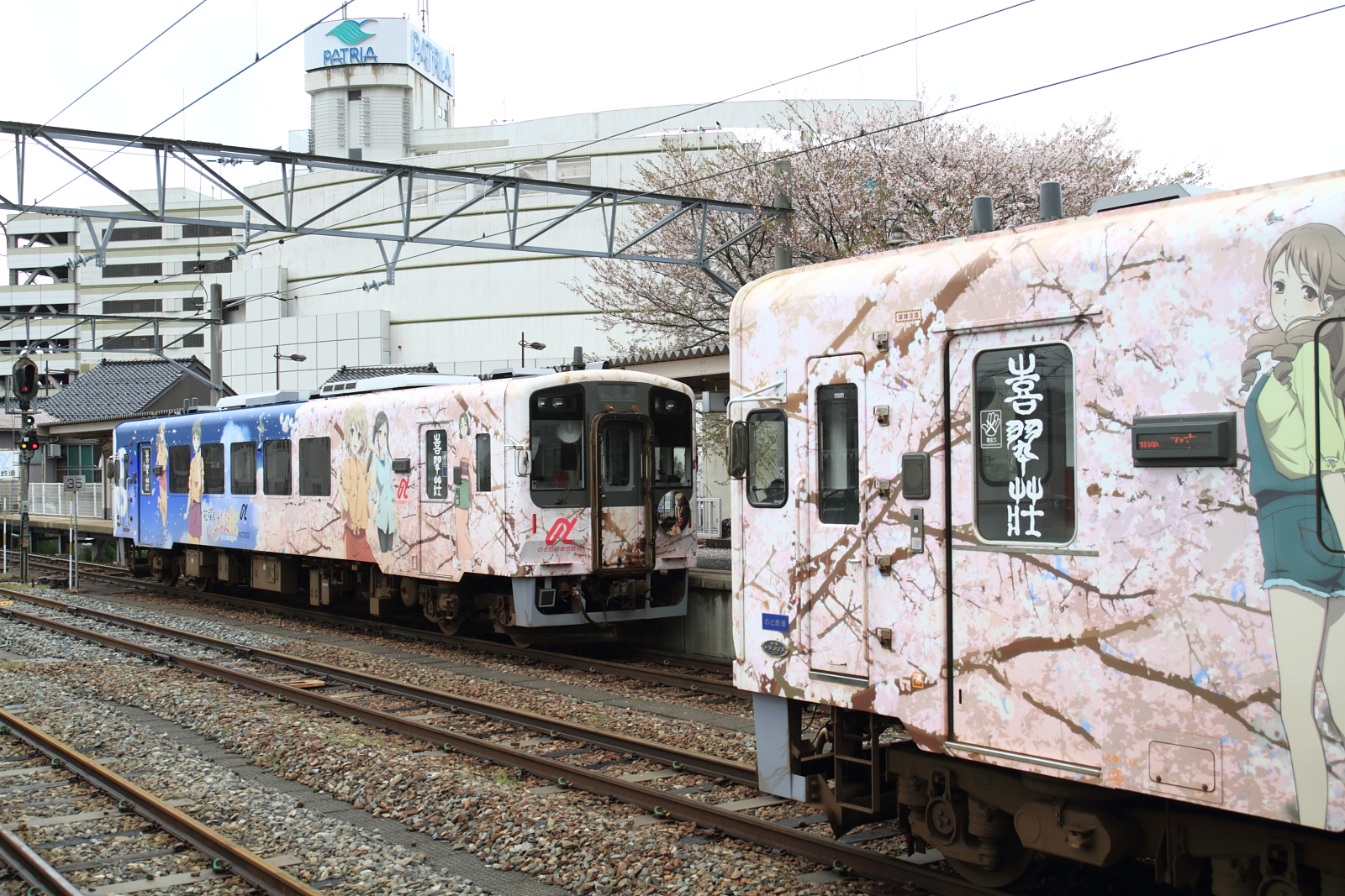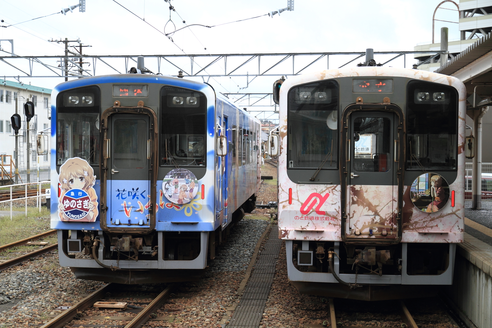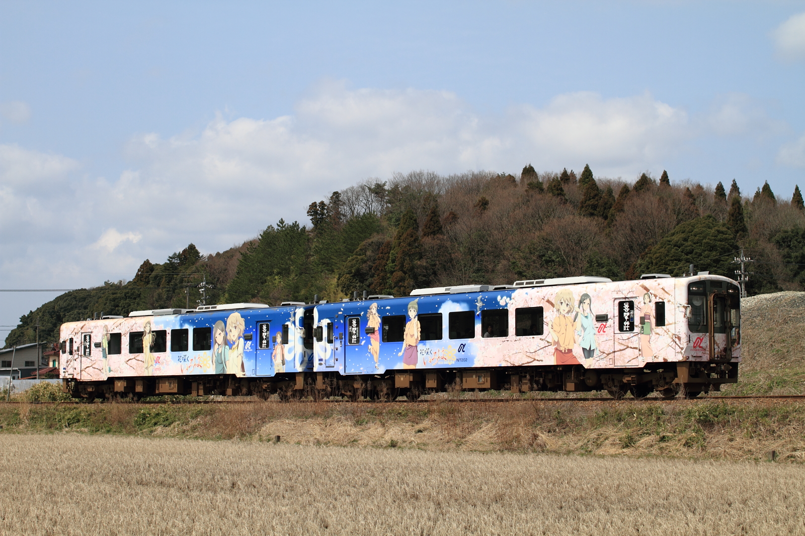 【のと鉄道】花咲くいろはラッピング列車13(初の2両併結)【NT201・NT202】 H25.3.30のと鉄道の花咲くいろはラッピング列車が初の2両運転として、臨時列車が運転されました。30日からヘッドマークや車内放送も一新し(第3弾)運転されています。桜もそろそろでしょうか。 [0回]