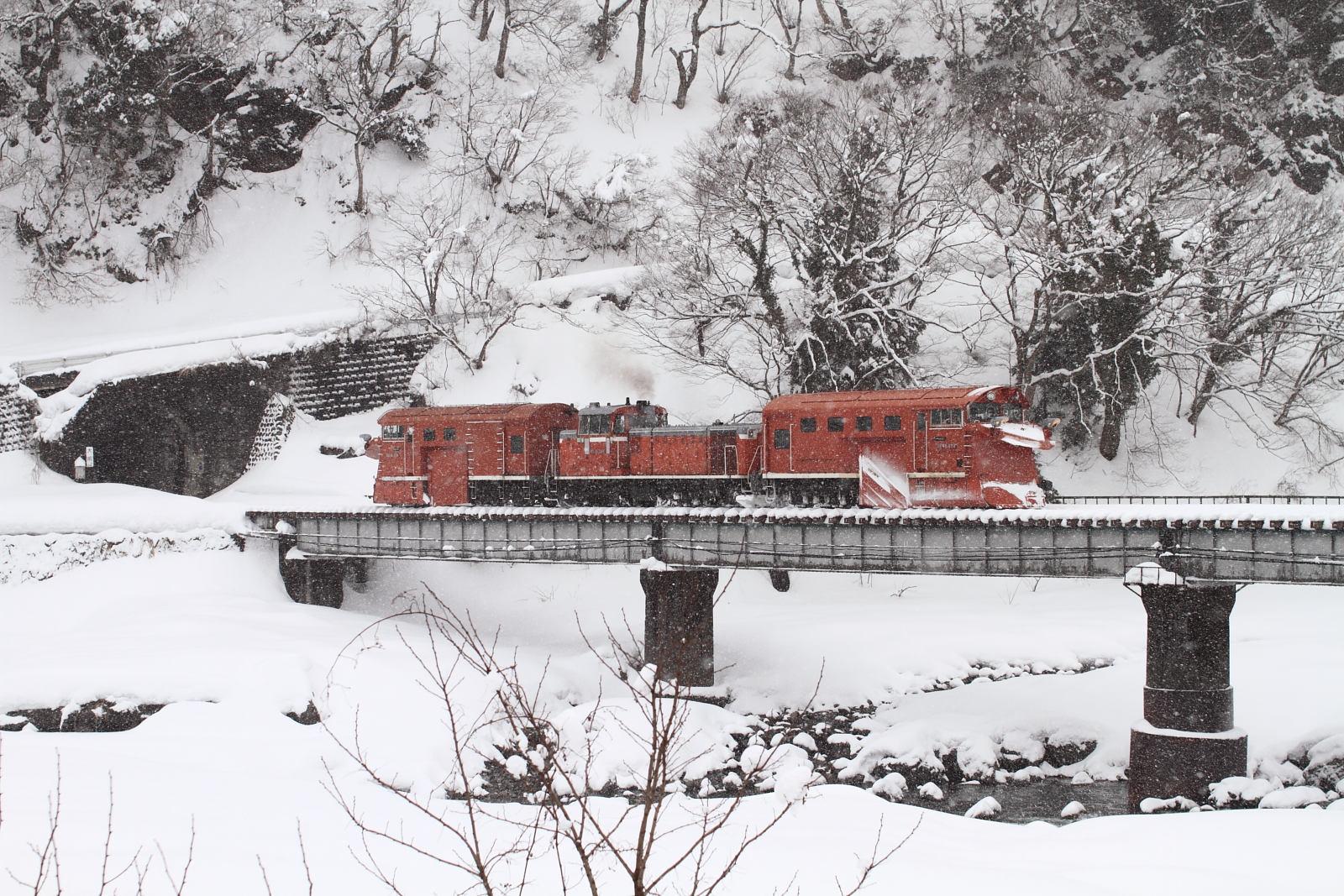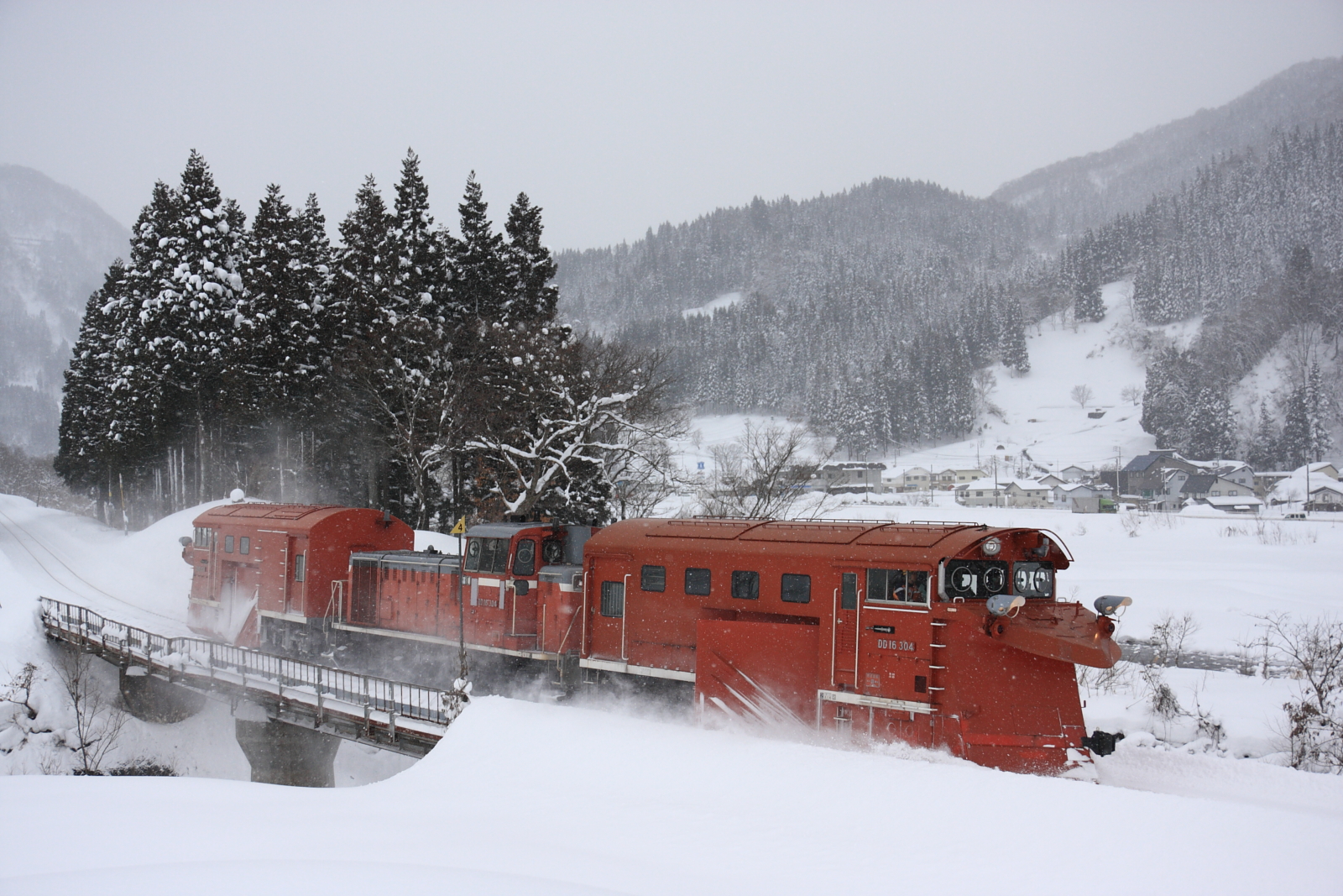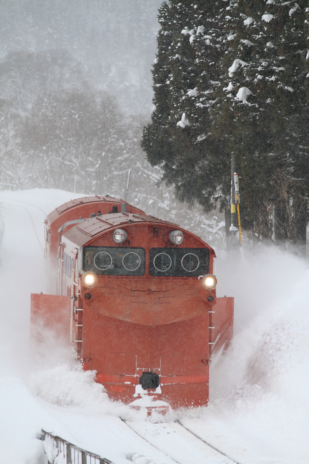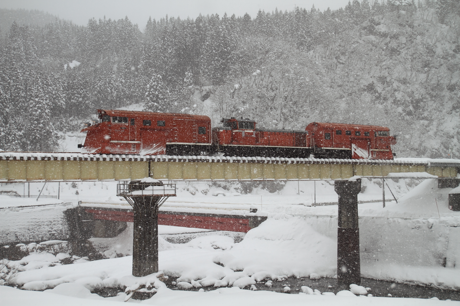 【大糸線】日中の大糸線DD16 304ラッセル撮影2【DD16ラッセル】 H25.1.18またも日中に大糸線DD16 304ラッセルが運転されました。今回は最初から撮影できました。冬の北陸の天気は変わりやすく、運まかせですが晴れました。しかしすぐに天気は雪へと変わります。。少し「ゆるてつ」っぽくなりましたが、ただのミスです。。。。前日にも訪れていたので、雪の量やロケーションは把握済みでスムーズに撮影できました。続いて復路です、、豪快に雪を……とまではいきませんが、除雪している場面です。40Dで撮影ここではサブカメラで広角気味にも撮影。平岩の鉄橋では横から40Dで撮影サブカメラで望遠気味…でもないですね。この場所は直前にキハ120が通過するので雪も少な目で、、、、いやはや、お気に入りのDD16をお腹いっぱい撮影できました。単線式ラッセルというのもローカル感が出て良いです。これからもDD16 304を追い続けます! [0回]