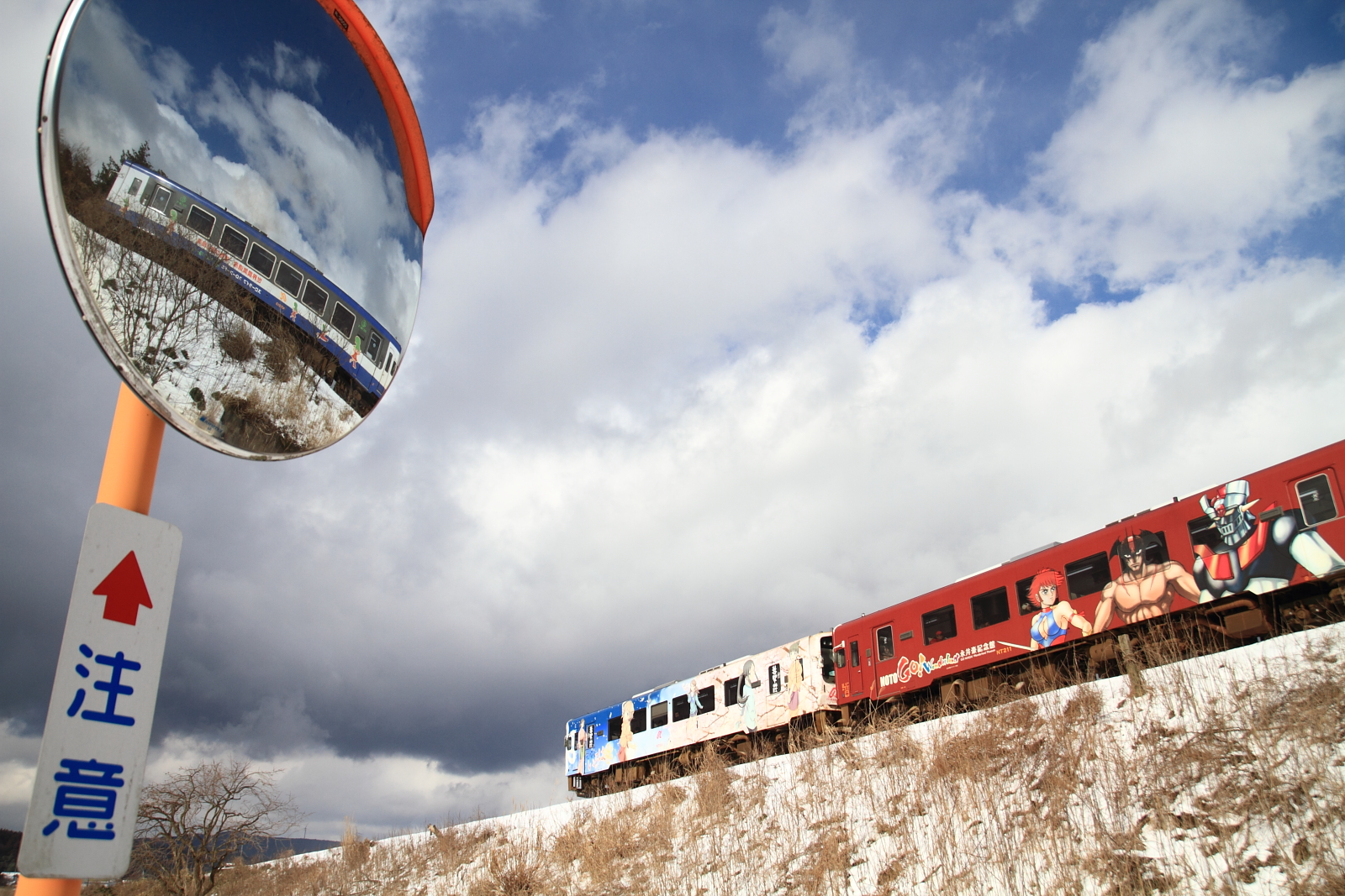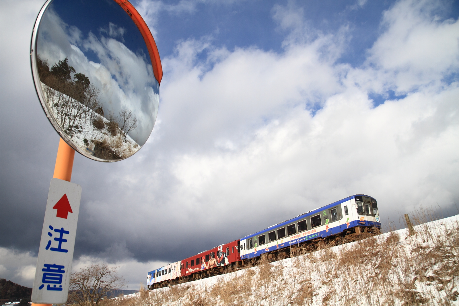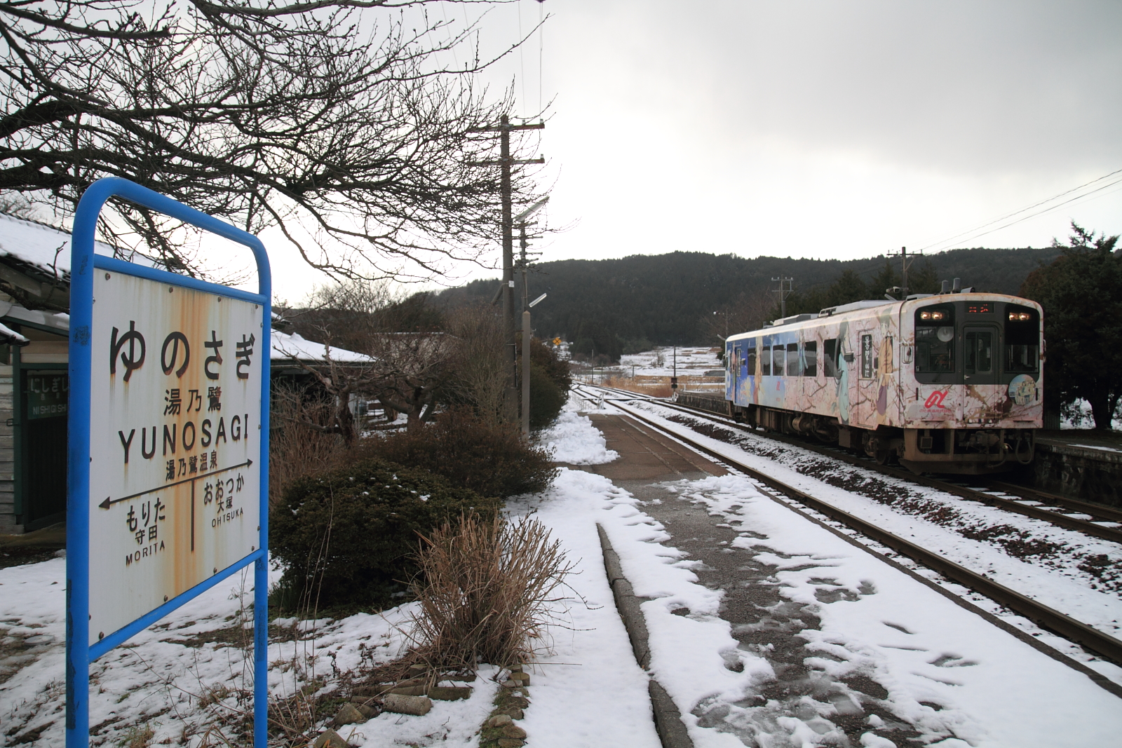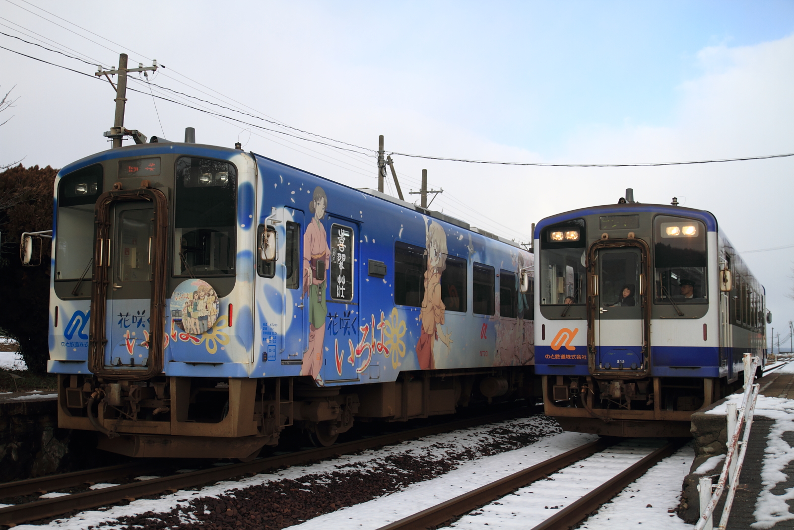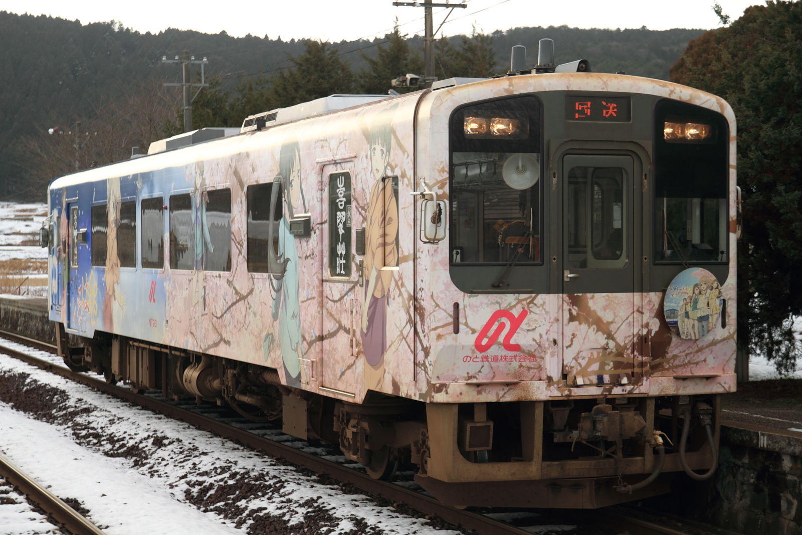 【のと鉄道】花咲くいろはラッピング列車13【NT201】 H25.1.20花咲くいろはラッピングが「回送」表示で運転。湯乃鷺駅にて撮影。これは臨時「牡蠣列車」運転のため、運用の都合上回送となっています。撮影の後は能登半島めぐり。久々に「恋路駅」に寄ってみました。そして、千枚田のライトアップを見て、輪島のねぶた温泉でほっこりして帰宅。撮影+美味しいもの+温泉このサイクルはやめられませんね。 [0回]