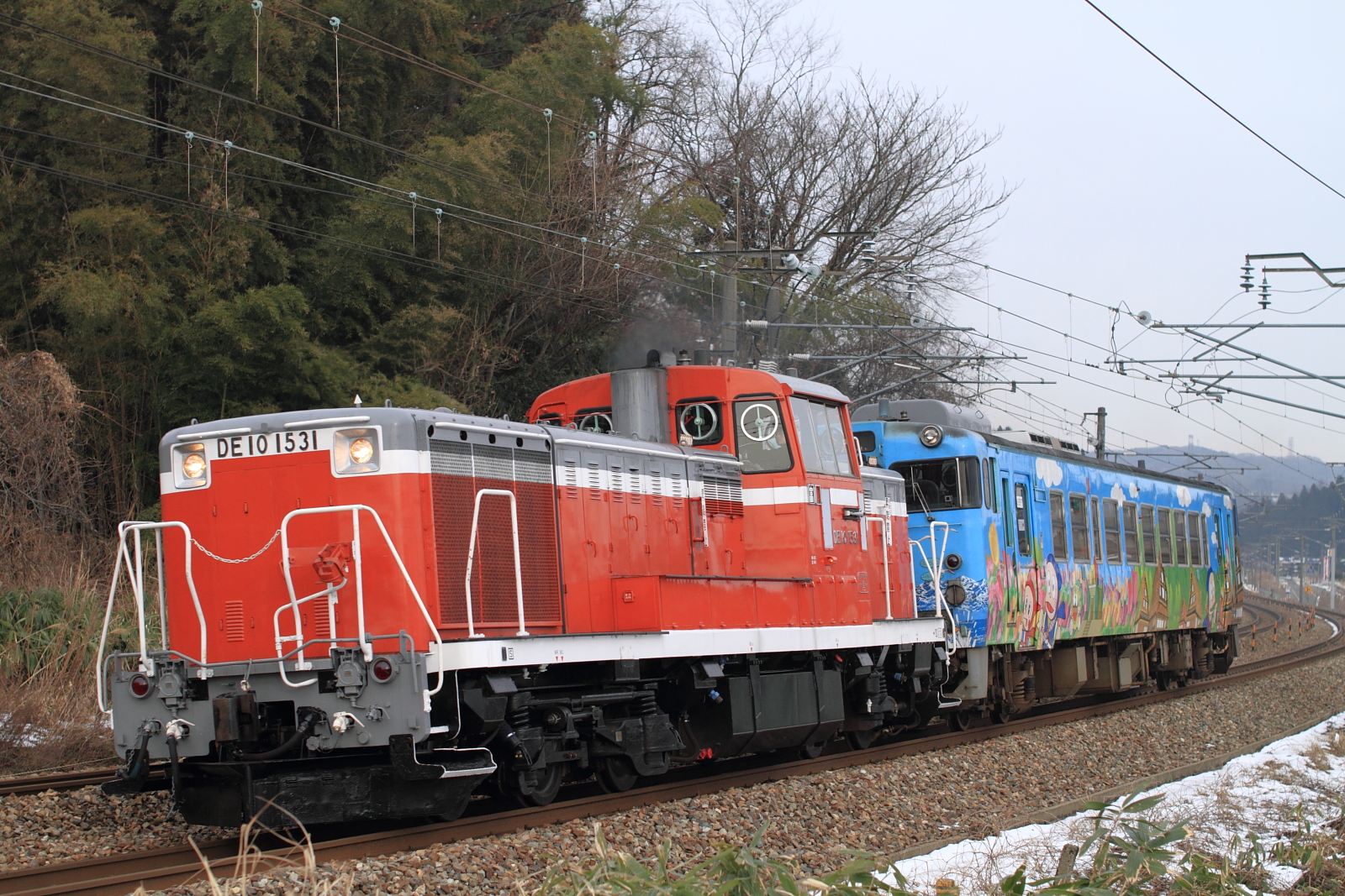 【北陸本線】ハットリキハ40配給【DE10+キハ40】 H25.1.21氷見・城端線のキハ40 2135がDE10 1531牽引の配給で松任へ。先日の城端線踏切事故による損傷での緊急入場です。北陸地方では踏切による事故が増加しています。特に冬は事故が多いので、緊急時には緊急ボタンを迷わず押してくださいね。 [0回]