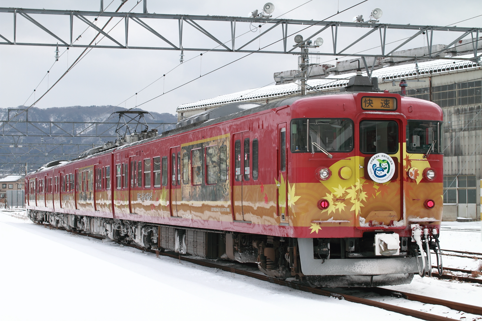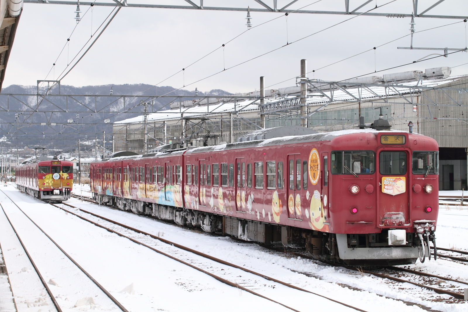【七尾線】快速里山里海号運転【のと鉄道】 H25.1.26/27前回は高岡キハ40・キハ47を使用して直通運転でしたが、今回は七尾駅で乗換えパターンで運転されました。27日9885M車両は2日間とも415系3両の国宝等伯号にHMを付けて運転しました。七尾からはのと鉄道NT200の3両運転で、ラッピング車の3両でHM付けての運転。27日9129D26日七尾駅雪が降ったり、晴れたりと不思議な天気の中の撮影でした。これでH24年度の快速里山里海号の運転は終了となりますが、今後も運転される可能性が高いと思われます。 [0回]