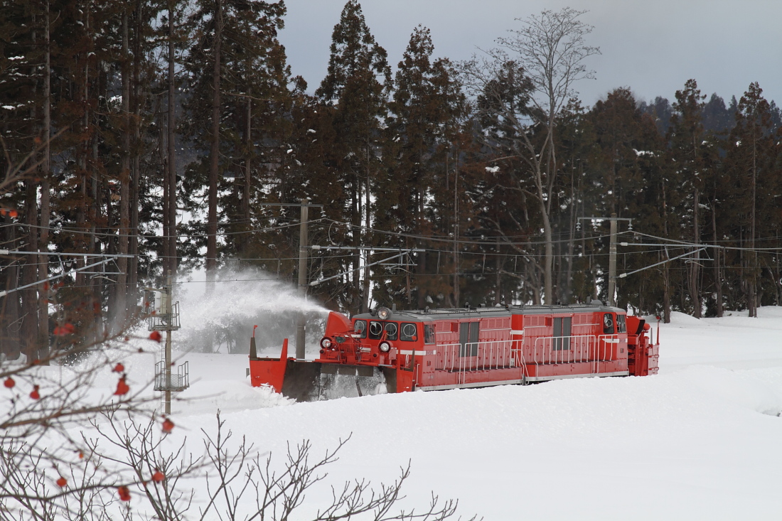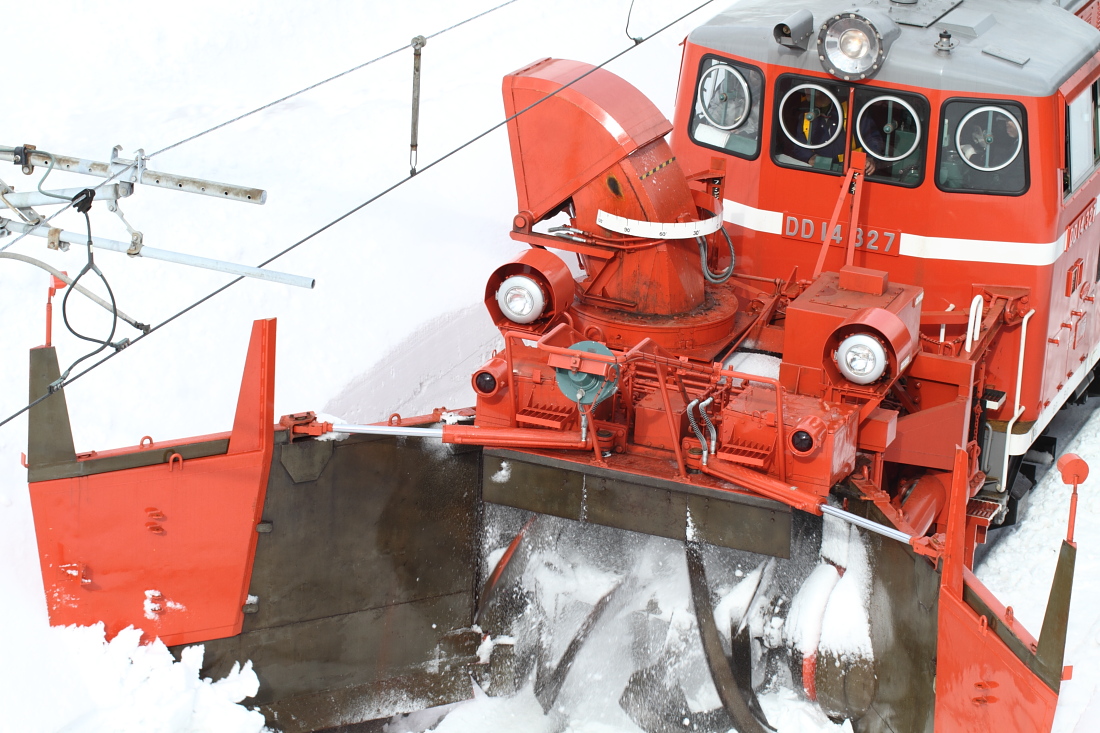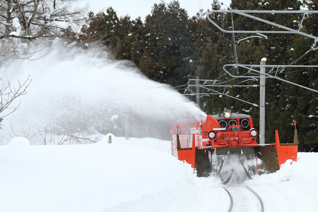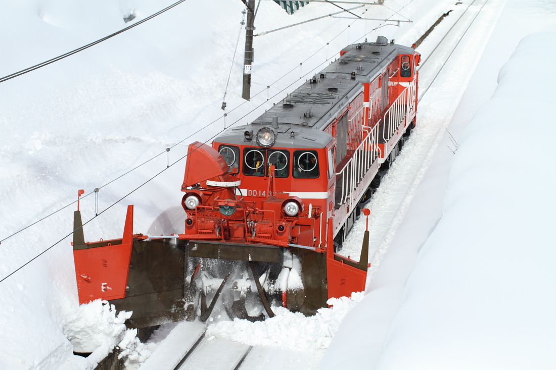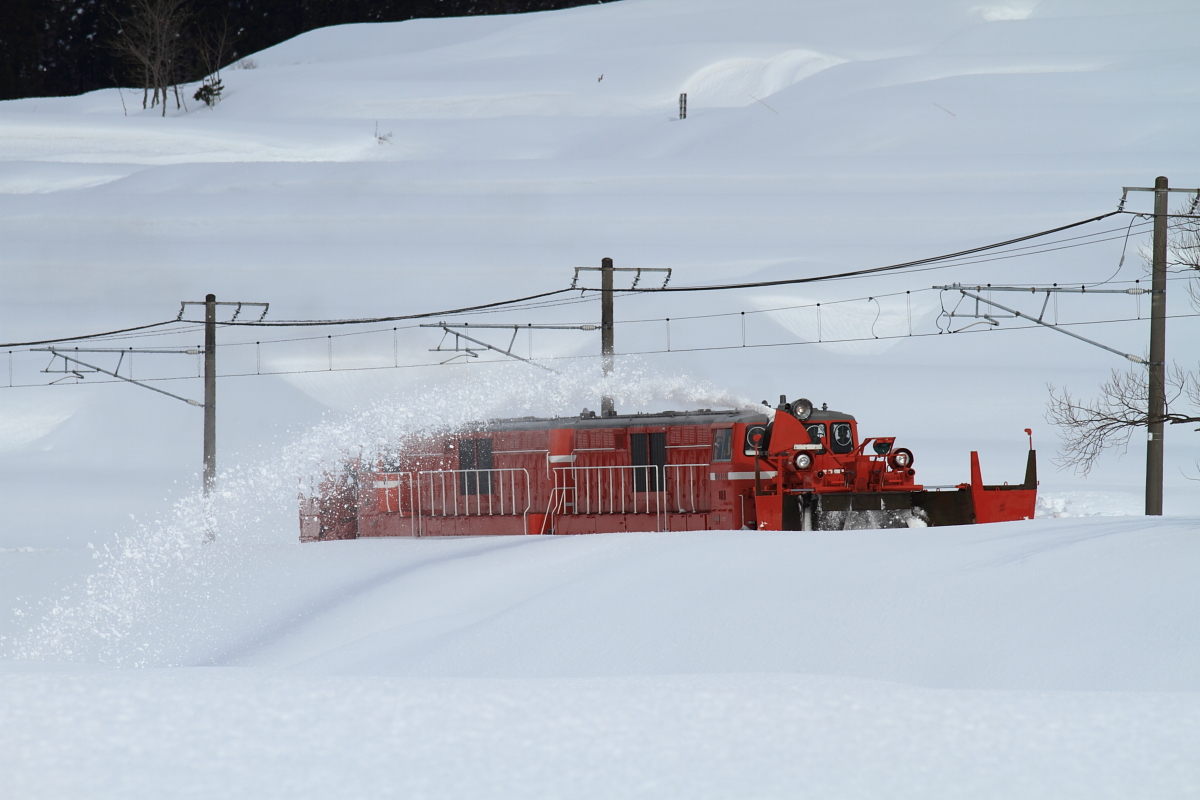 【信越本線】DD14-327+DD14-332【DD14背向重連ロータリー式除雪車】 13日今季、除雪・排雪列車2回目です。大糸線DD16に続き、今回は信越本線「特雪」ことDD14背向重連ロータリー式除雪。 ←長野 直江津→ ≪DD14-327凸+凸DD14-332≫時間の都合で、二本木から。妙高号がゆっくりと駅へ。駅で交換しラッセル開始!見慣れない連結。豪快に雪を飛ばします。綺麗な雪の中をのんびり通過。防雪林をバックに。天気にも恵まれました。妙高のスキー場をバックに……見えない。。信越本線の除雪はさすがに圧巻でした!! [0回]