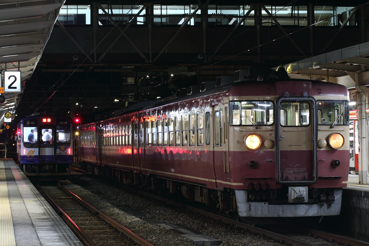 【七尾線】ミリオンスターズ応援号【475系国鉄色】 23日七尾で行われた、ミリオンスターズの試合に合わせ、JRとのと鉄道で臨時列車が運転されました。JRは475系国鉄色3両、のと鉄道はNT212(のとドン号)が使用されました。@七尾駅七尾線の475系国鉄色は初めてかな?NT200も定期列車では中線に入りません。 [0回]