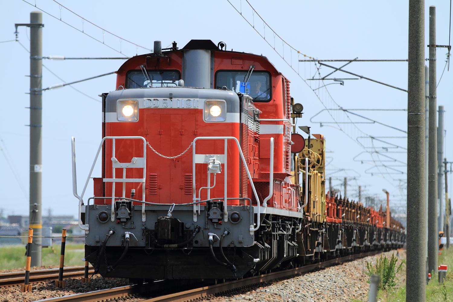 【北陸本線】工9588レ(DD51 1191号機牽引)ロングチキ撮影【DD51】 H29.5.29夜間に取り降ろしを行い、向日町へ空ロングチキの返却を撮影。 工9588@美川〜加賀笠間DD51 1191号機牽引でした。時間もなく、光線状態も悪いですがせっかくなので記録… [2回]